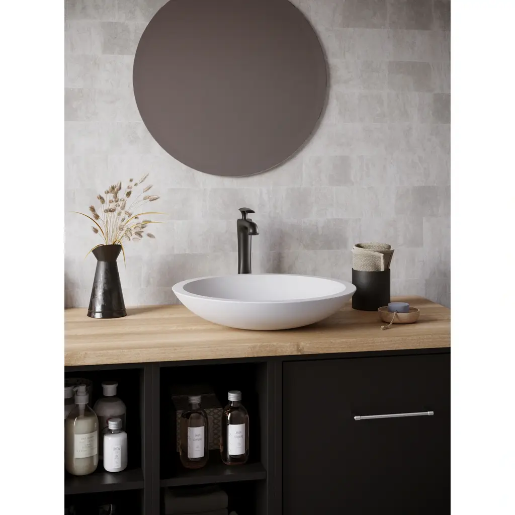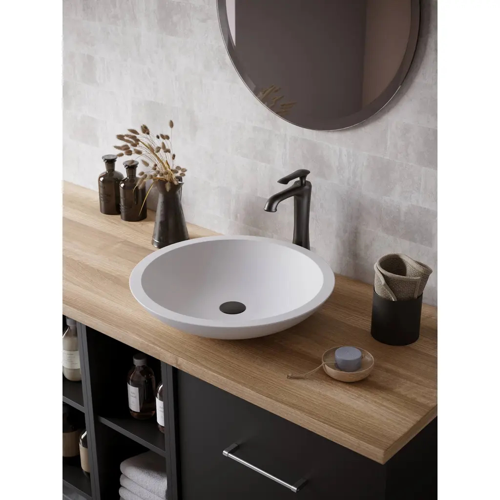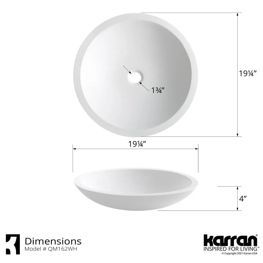 This beautiful bathroom sink pair will liven up your home. This solid surface vanity bowl, with its precisely spherical shape and shorn, flat rim, will look magnificent in your new bathroom. When combined with the Karran Woodburn single handle vessel faucet, this set will give you the style you've always wanted.Features & BenefitsDesigned for an above-counter installation in any countertop materialAbove-counter installation saves valuable storage space in cabinet belowMade from 100% pure acrylic resinNon-porous and naturally hygienic materialResistant to scratching, fading, and impactSmooth, non-porous material means toothpaste and soap residue won't stick or stain the sink's surfaceSolid construction reduces water flow sound for a quieter bathroom experienceSpecificationsSeries: Quattro Matte CollectionBowl configuration: Vanity bowlInstallation: Above-counterShape: RoundOverall sink length (side to side): 19-1/4"Overall sink width (front to back): 19-1/4"Overall sink height: 4"Drain opening size: Standard 1-3/4"Approximate weight: 17lbsFaucet holes: 0Overflow: 0Colors available: WhiteADA compliant Accessories included with sink: NoneFaucet Specifications Series: Woodburn Collection Installation type: Single hole Handle type: Single handle Faucet height: 11-5/8" Spout height: 8-7/8" Spout reach: 5-1/4" Included: Drain, water lines and installation hardware cUPC Certified