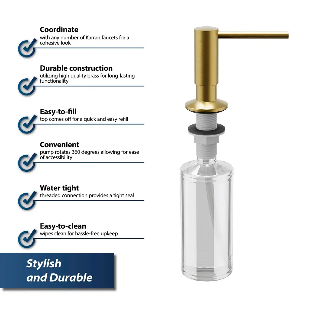 Complement and enhance your kitchen faucet and sink functionality with a Karran soap dispenser. The elegant designs for these deck-mounted soap dispensers complement any kitchen faucet and sink. Select from two different models, available in multiple different finishes.Specifications:• Overall height: 12-1/4"• Spout height: 2-3/4"• Spout reach: 3"• Diameter 2-1/4"