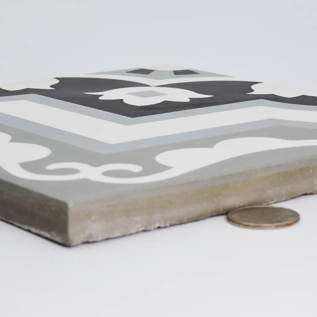 Design a dazzling backsplash, floor, or wall with these stunning tiles. Handmade by skilled Moroccan artisans for superior craftsmanship and traditional authenticity. These decorative tiles made from cement are durable indoors and outdoors. Weather-resistant and waterproof, the eco-friendly Moroccan tiles support your commitment to a greener home.Features:· Handmade in Morocco· Decorative floor and wall tiles· Made of cement materials· Professional installation is recommended.· Tiles need to be sealed before and after grouting.· Eco-friendly· Indoor or outdoor use· Geometric pattern· When ordering a box, 12 tiles come included. Sample is just 1 tile.· 12 tiles per box, covering 5.22 square feet.· 2.3 tiles per square foot· Each tile measures 8 inches wide x 8 inches longStory Behind the Art: "It's more than tile, it's art." That simple statement is what sets the craftsmanship of Moroccan Mosaic apart from the rest. Based in the small city of Sale, Moroccan Mosaic is a family business going back 4 generations. When Simo, the current head of the business graduated from university in New York, he had little interest in the family business. But on a return trip home, he saw that the business was not doing well and set about reviving it. One important change he made was introducing black, grey, and white designs to appeal to American and European customers. It worked. When he started, they employed 2 workers and now they have nearly 80 on staff. The workshop itself is fairly simple, and the techniques used to create the tiles are steeped in tradition. Some modern equipment is available, though the workers prefer to use the more rustic tools. The creative process is time intensive and done by hand, as Simo insists on no corners be cut or production be rushed. Environmentally responsible and resource efficient, no chemicals are used at any step. For example, colors used come from nature literally. Green comes from mint leaves, orange from orange peel, and black from charcoal. The tiles themselves are a simple mixture of cement, sand, and granite powder. Moroccan Mosaic hires only local workers, teaching them a valued skill as well as paying them fair wages. Simo's goals for his business are to share the tradition of gorgeous Moroccan tile, grow the business, and employ more and more workers.