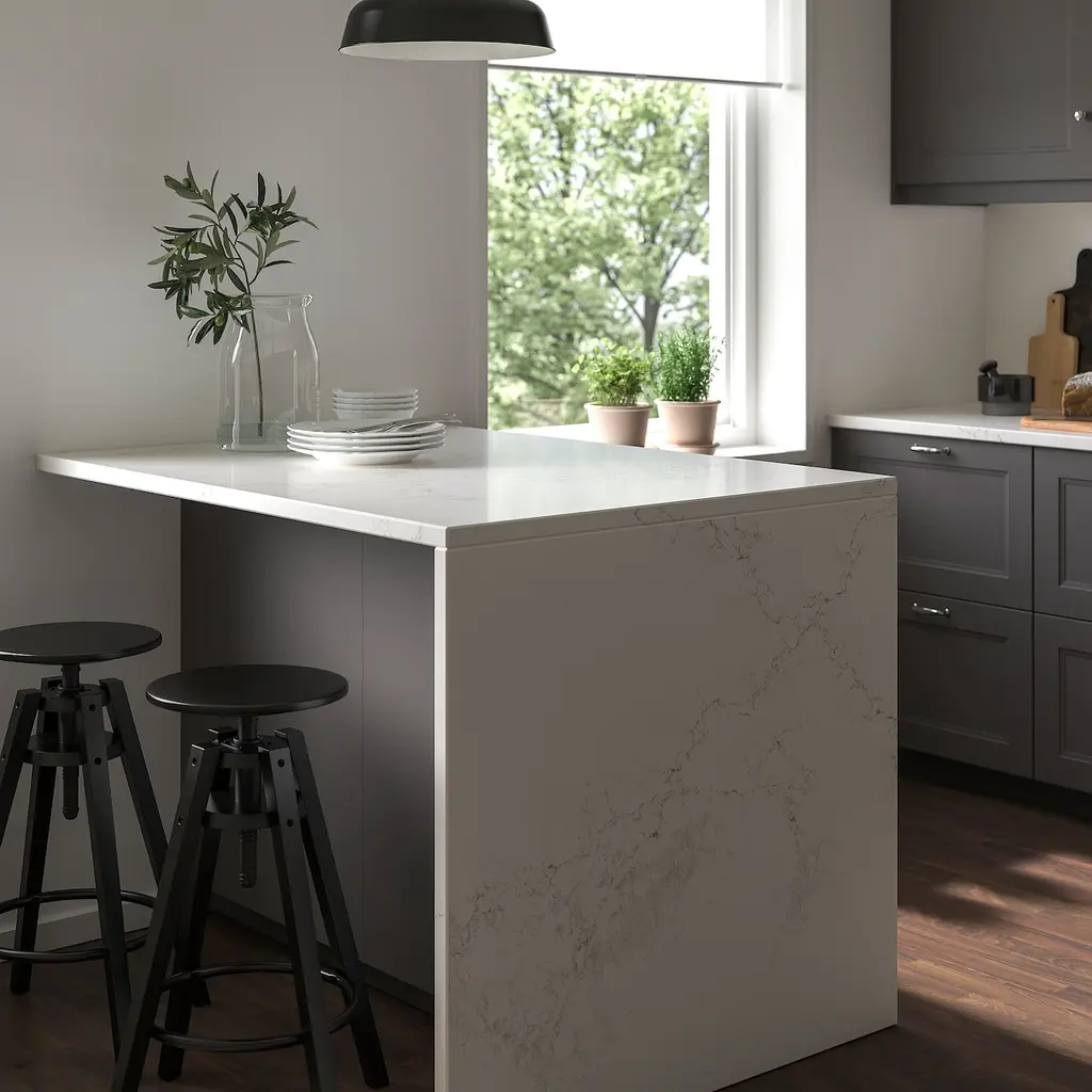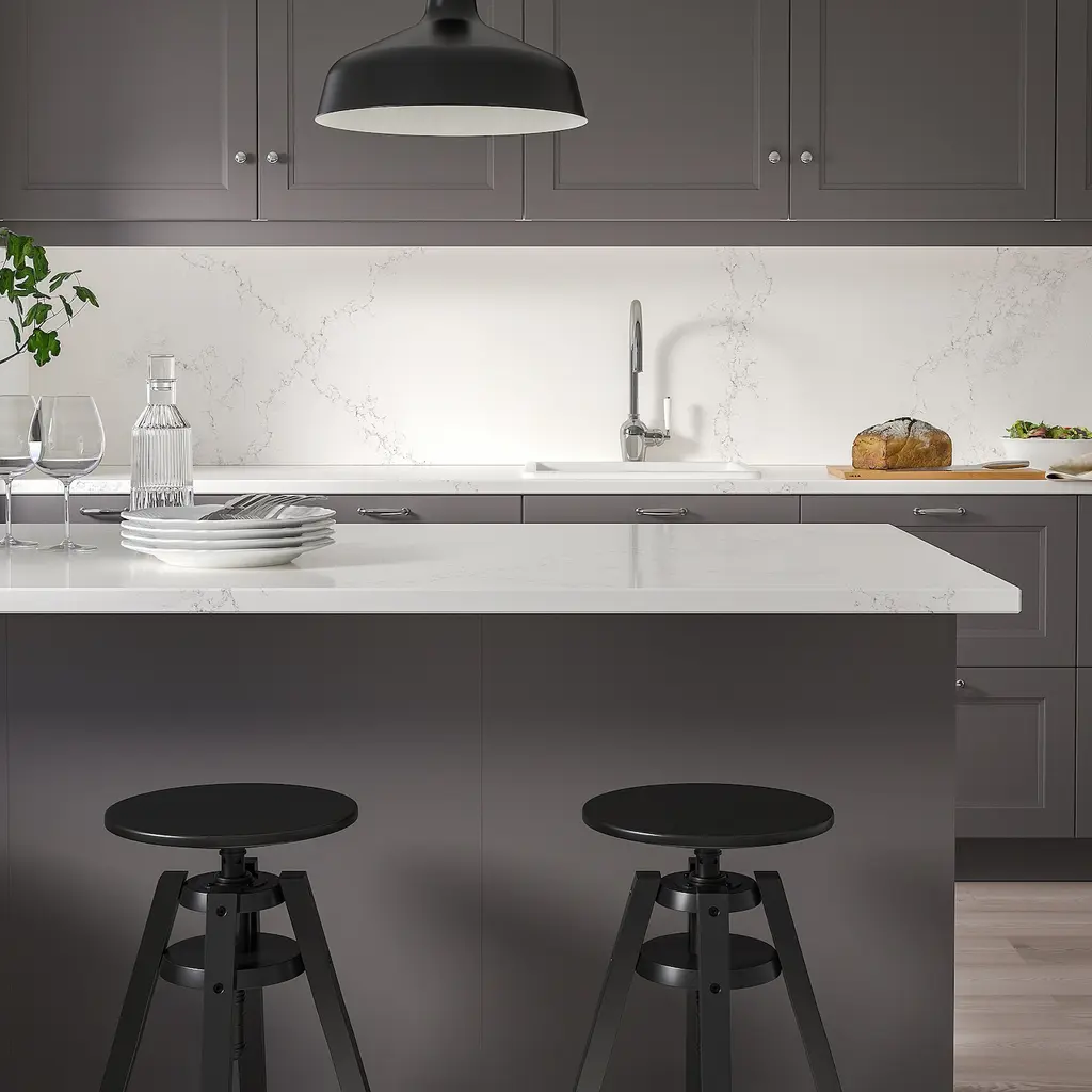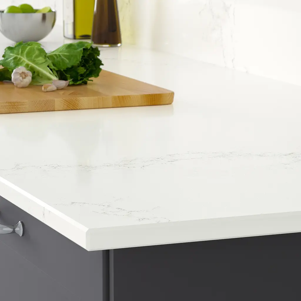 KASKER Custom countertop - white lively marble effect/quartz 1 1/8 ". Limited lifetime warranty. Read about the terms in the guarantee brochure. The countertop is custom-made for your kitchen solution. Select the appropriate depth and length.