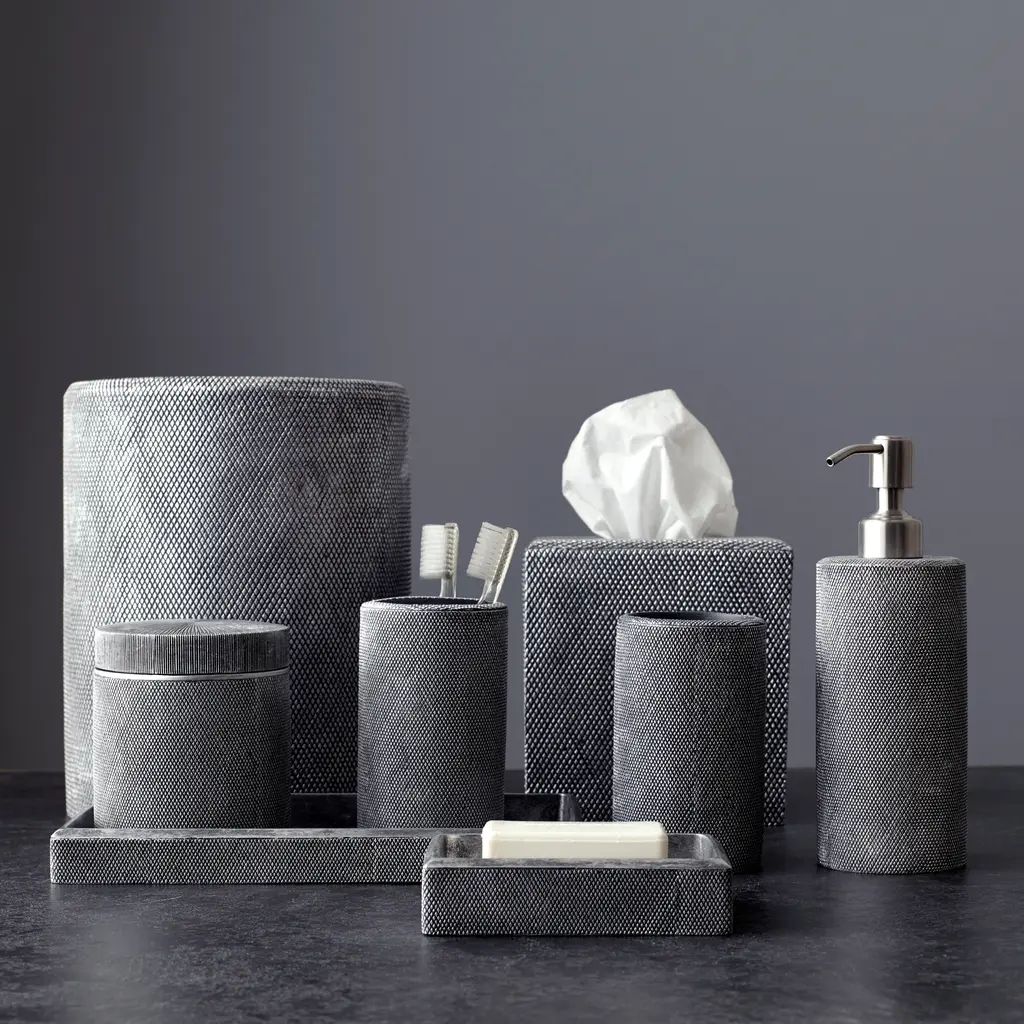 Add an industrial-chic touch to your bathroom decor with our Textured Resin Bath Accessory collection. Each piece in this collection is crafted from durable grey resin, designed to mimic the look of metal. Elegant and practical, this collection will withstand everyday use and elevate your bathroom style.Features:Dimensions:
