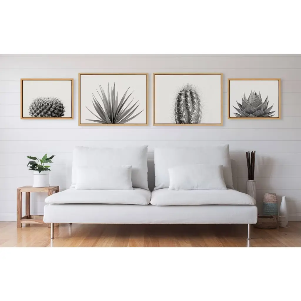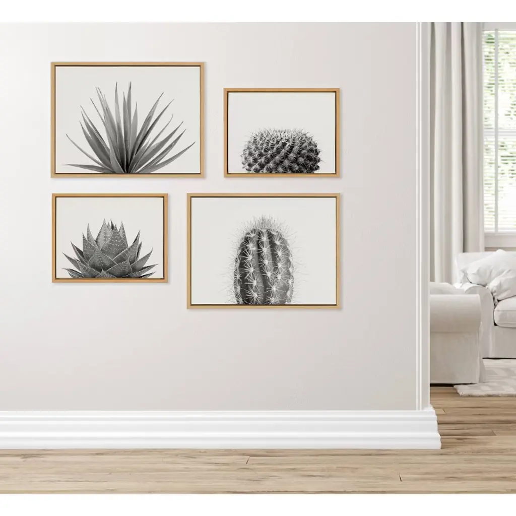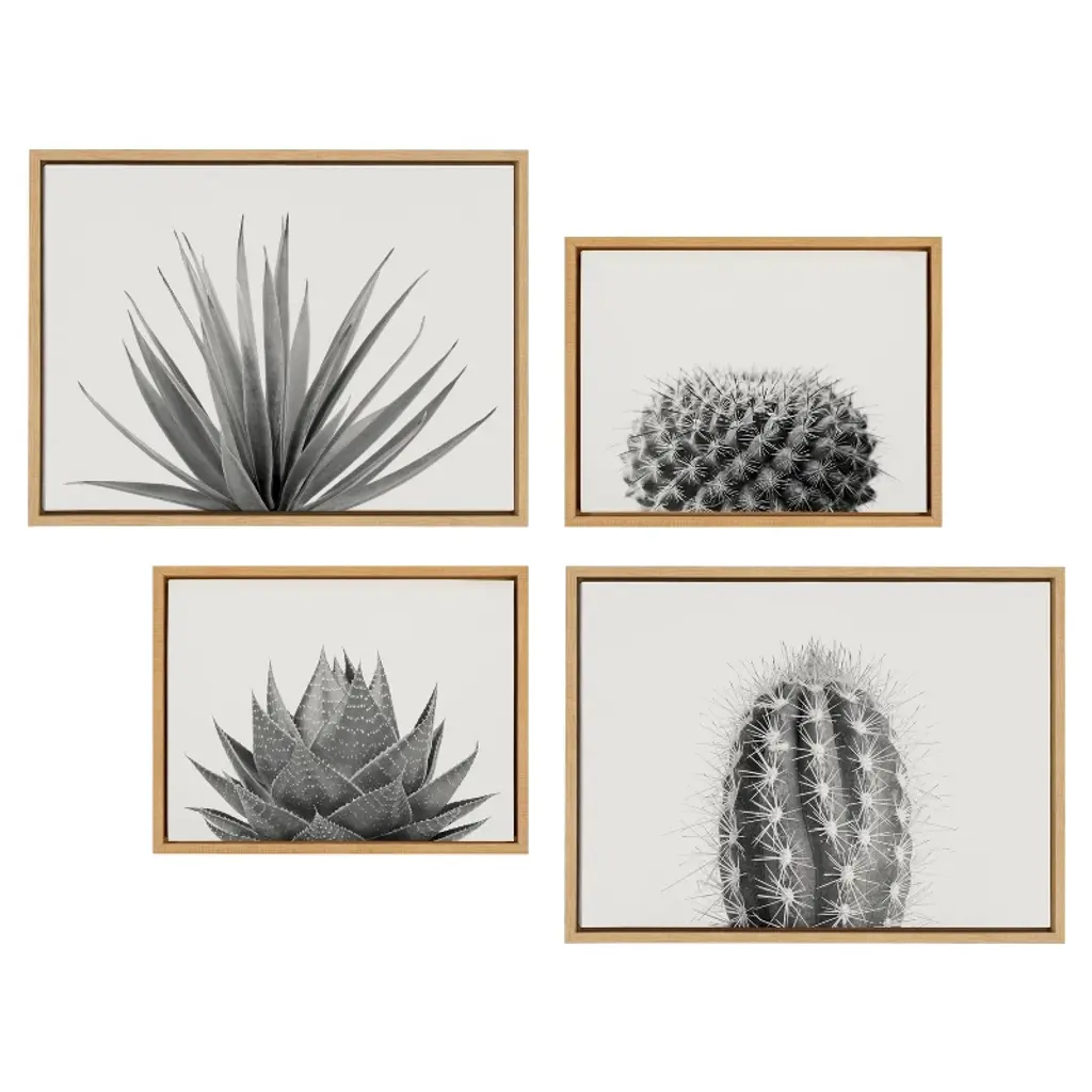 Transform your room into a desert oasis with this set of framed canvas art. It showcases the natural elegance of aloe succulents, tall and short cacti, and agave plants in a soothing arrangement. Framed in the USA in Waunakee, Wisconsin, this modern floating canvas art set of 4 is sure to bring joy to your space. Our design team curates art that will fit perfectly in any room of your home. Showcase this art in your living room, bedroom, home office, kitchen, bathroom, nursery, or anywhere you want to bring a little beauty and charm to your walls. Specializing in home décor, we are continually bringing timeless works of art for the traditional decorator as well as trend-forward pieces for that eclectic art lover. Our high-quality framed canvas art also makes excellent gifts for birthdays, holidays, or housewarming parties. Printed on gallery-wrapped canvas and framed with a simple gallery frame this wall art is easy to display on the wall and will match with any décor style. Display dimensions of the larger frames are 18 inches by 24 inches, and the two smaller frames are each 14 inches by 18 inches by 1.6 inches. Print Names: “Haze Aloe Succulent, Cactus Tall, Cactus Short and Agave Succulent”