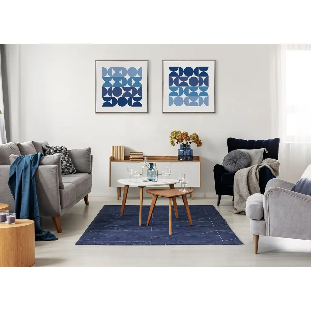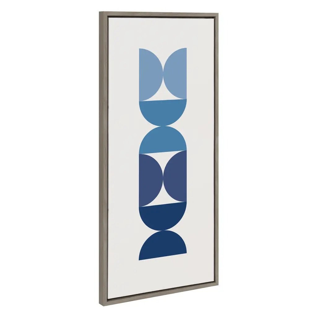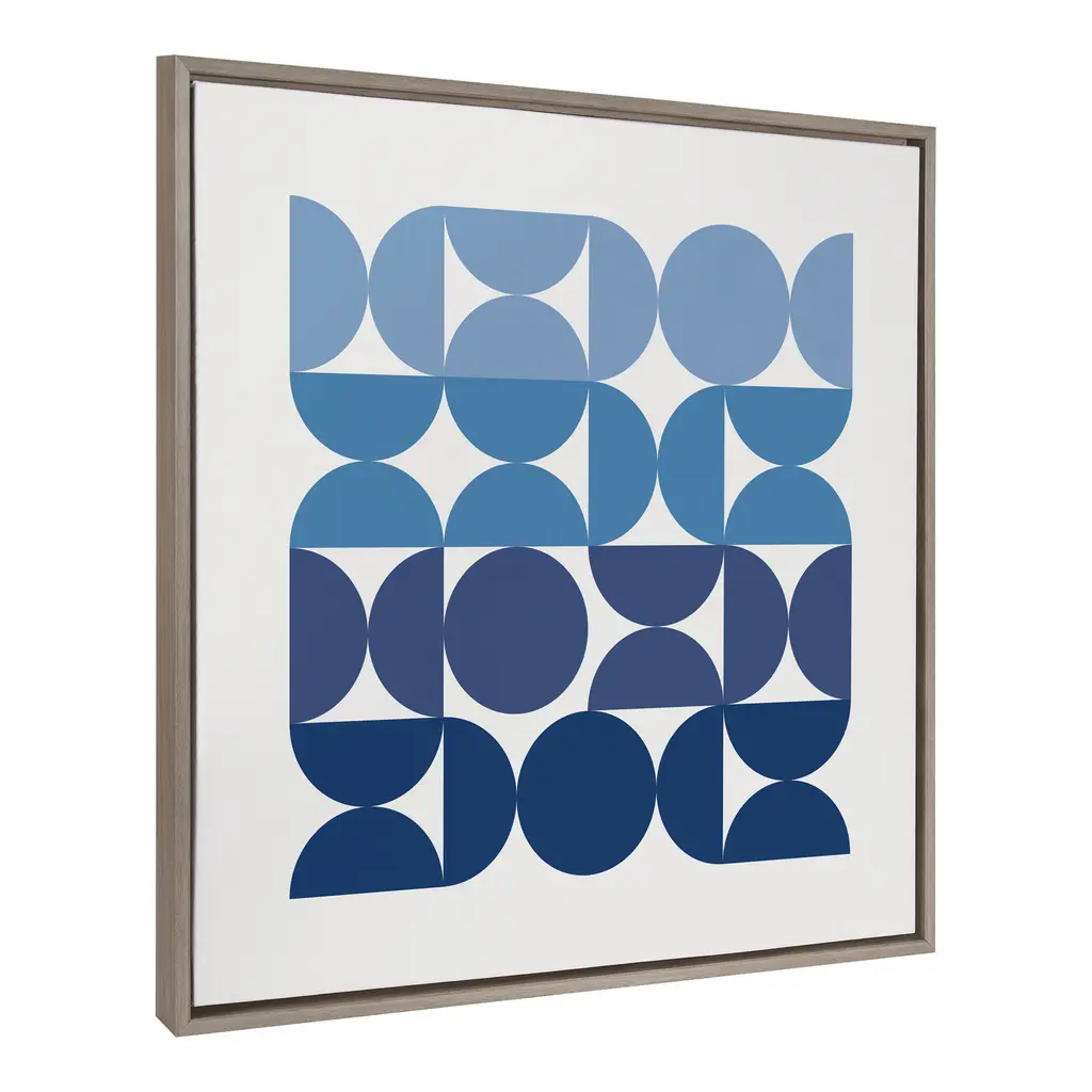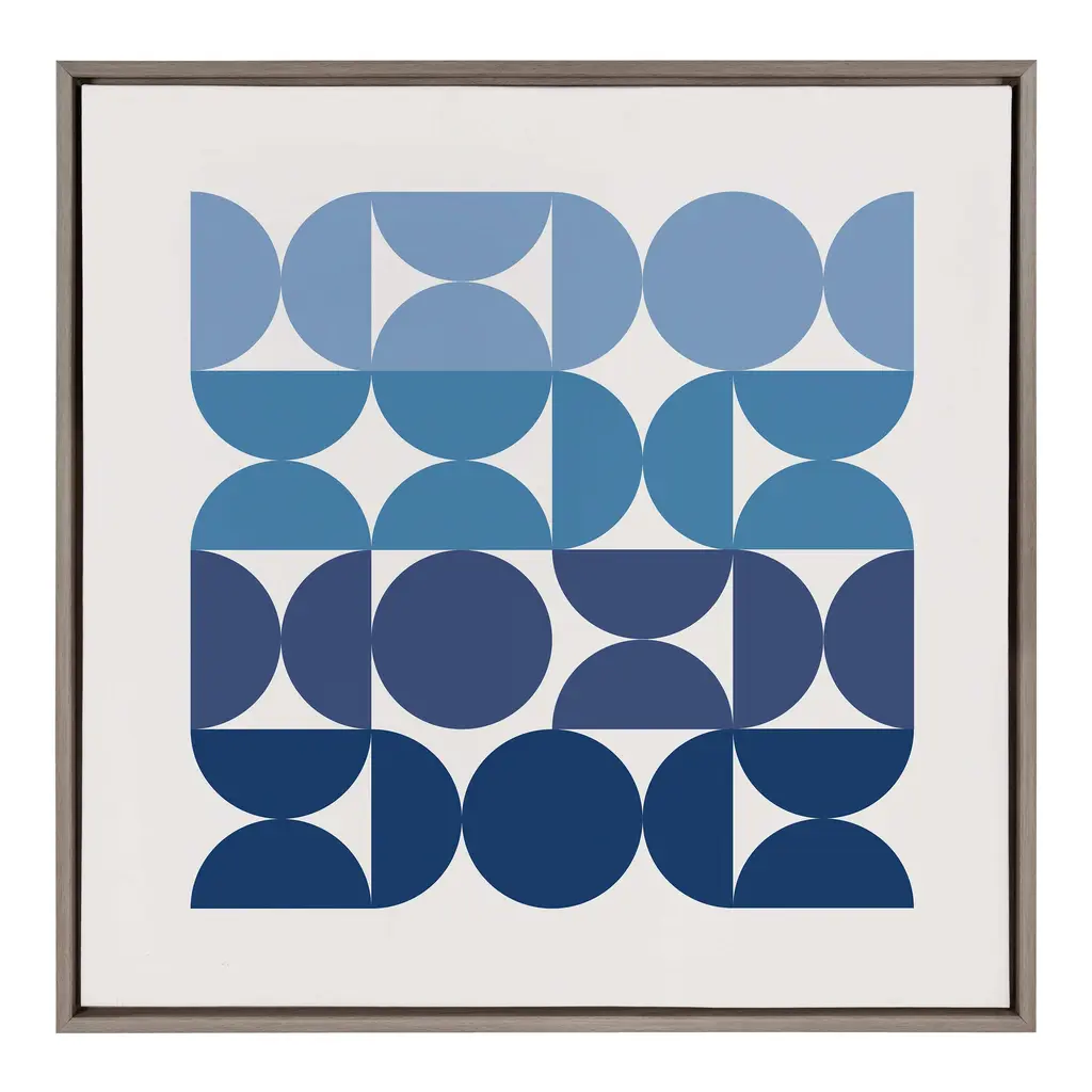 This mid-century modern print depicts ocean waves with these soft blue colors. A great combination of abstract imagery with warm blue colors. Framed in the USA in Waunakee, Wisconsin, this floating canvas art will be a pleasure to look at every day in your living room, bedroom, nursery, or any room in the home. This art print also makes an excellent gift for birthdays, holidays, or housewarming parties. Printed on gallery-wrapped canvas and framed with a lightweight polystyrene frame, this wall art is easy to display on the wall. The outer dimensions are 30 inches by 30 inches by 1.6 inches. Print Name: "Circles and Curves Ocean Beach Blues"