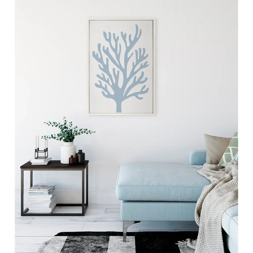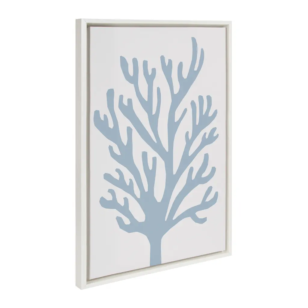 Decorate your home with this minimalist botanical wall art by The Creative Bunch Studio. The calm blue tones of this abstract coral print is the perfect addition to your coastal home. Framed in the USA in Waunakee, Wisconsin, this floating canvas art will be a pleasure to look at every day in your living room, bathroom, bedroom, or any room in your cabin, lake house or beach house. This art print also makes an excellent gift for birthdays, holidays, or house-warming parties. Printed on gallery-wrapped canvas and framed with a lightweight polystyrene frame, this wall art is easy to display on the wall. The outer dimensions are 18 inches by 24 inches by 1.6 inches. Print Name: "Abstract Coral Ocean Blue"
