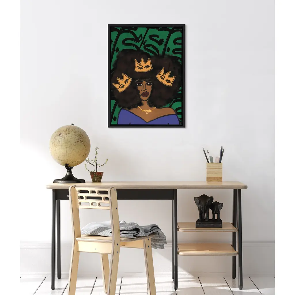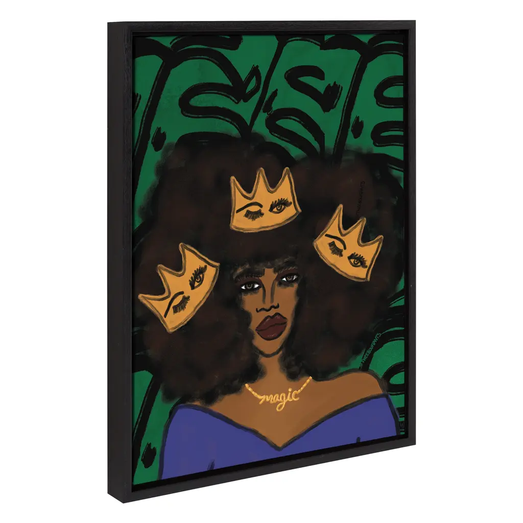 Add some boho-style elegance with this art print by Kendra Dandy. Framed in the USA in Waunakee, Wisconsin, this floating canvas art will be a pleasure to look at every day in your living room, bedroom, office, or any room in the home. This art print also makes an excellent gift for birthdays, holidays, or house-warming parties. Printed on gallery-wrapped canvas and framed with a lightweight polystyrene frame, this wall art has two hangers already attached to the MDF back for easy wall display. The outer dimensions are 24 inches by 18 inches by 1.63 inches. Print Name: "Wear Your Crown"