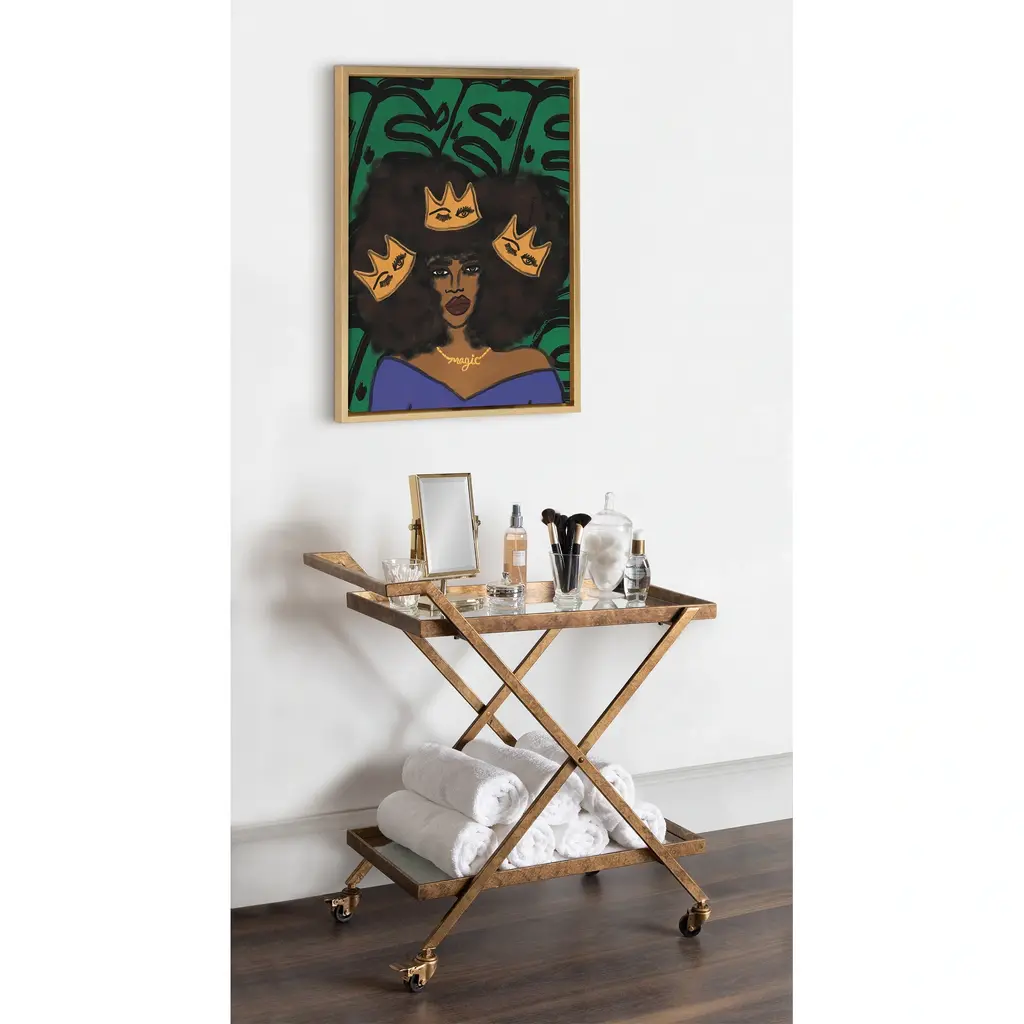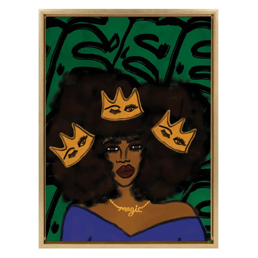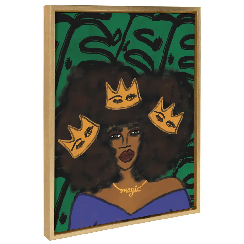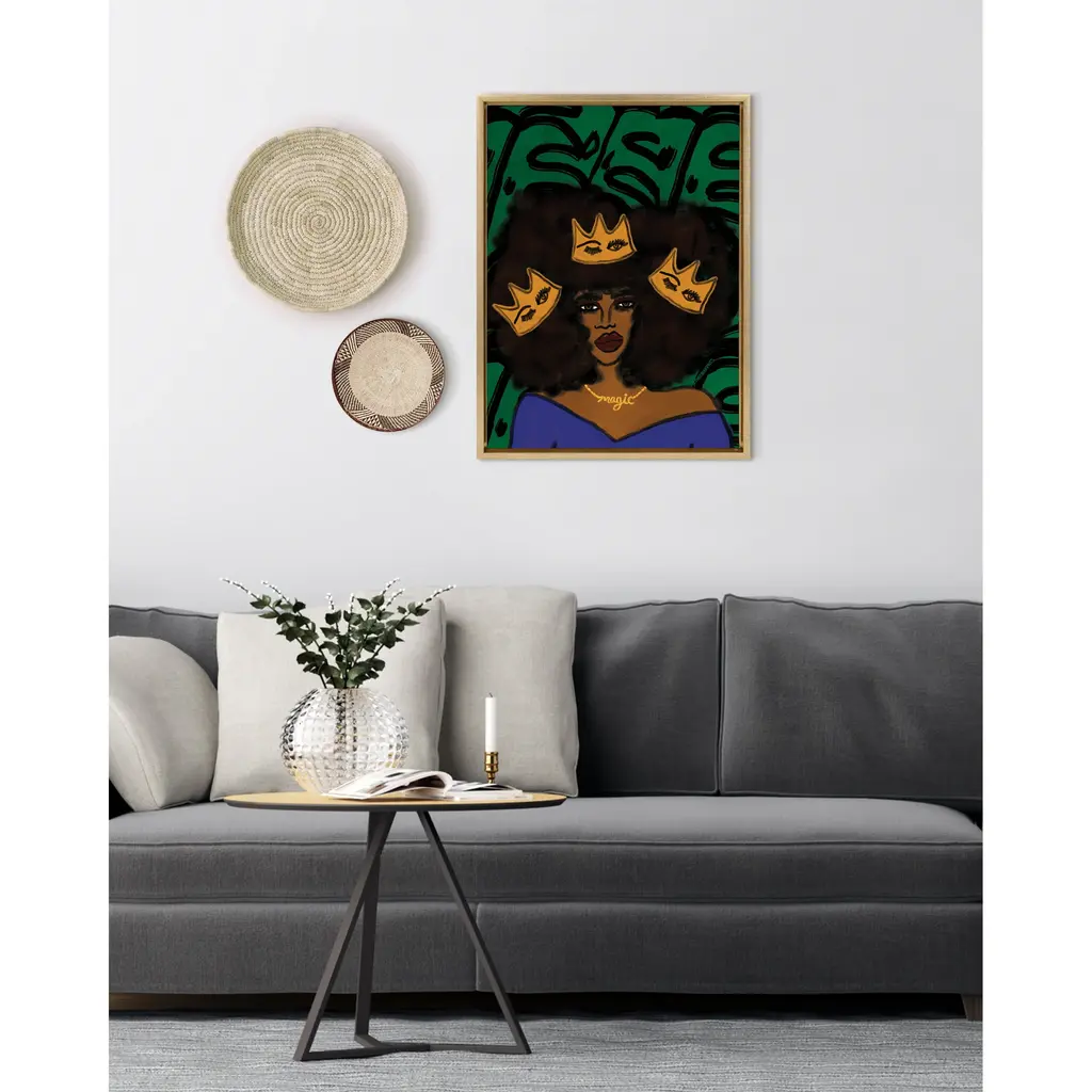 Add some boho-style elegance with this art print by Kendra Dandy. Framed in the USA in Waunakee, Wisconsin, this floating canvas art will be a pleasure to look at every day in your living room, bedroom, office, or any room in the home. This art print also makes an excellent gift for birthdays, holidays, or house-warming parties. Printed on gallery-wrapped canvas and framed with a lightweight polystyrene frame, this wall art has two hangers already attached to the MDF back for easy wall display. The outer dimensions are 24 inches by 18 inches by 1.63 inches. Print Name: "Wear Your Crown"