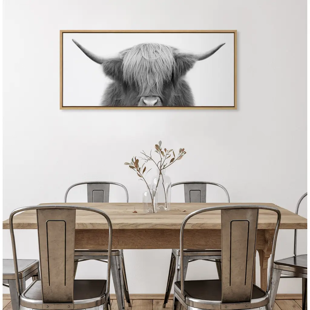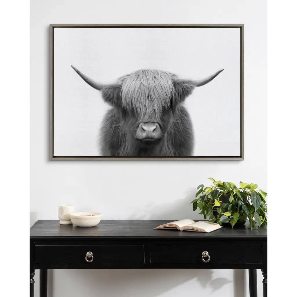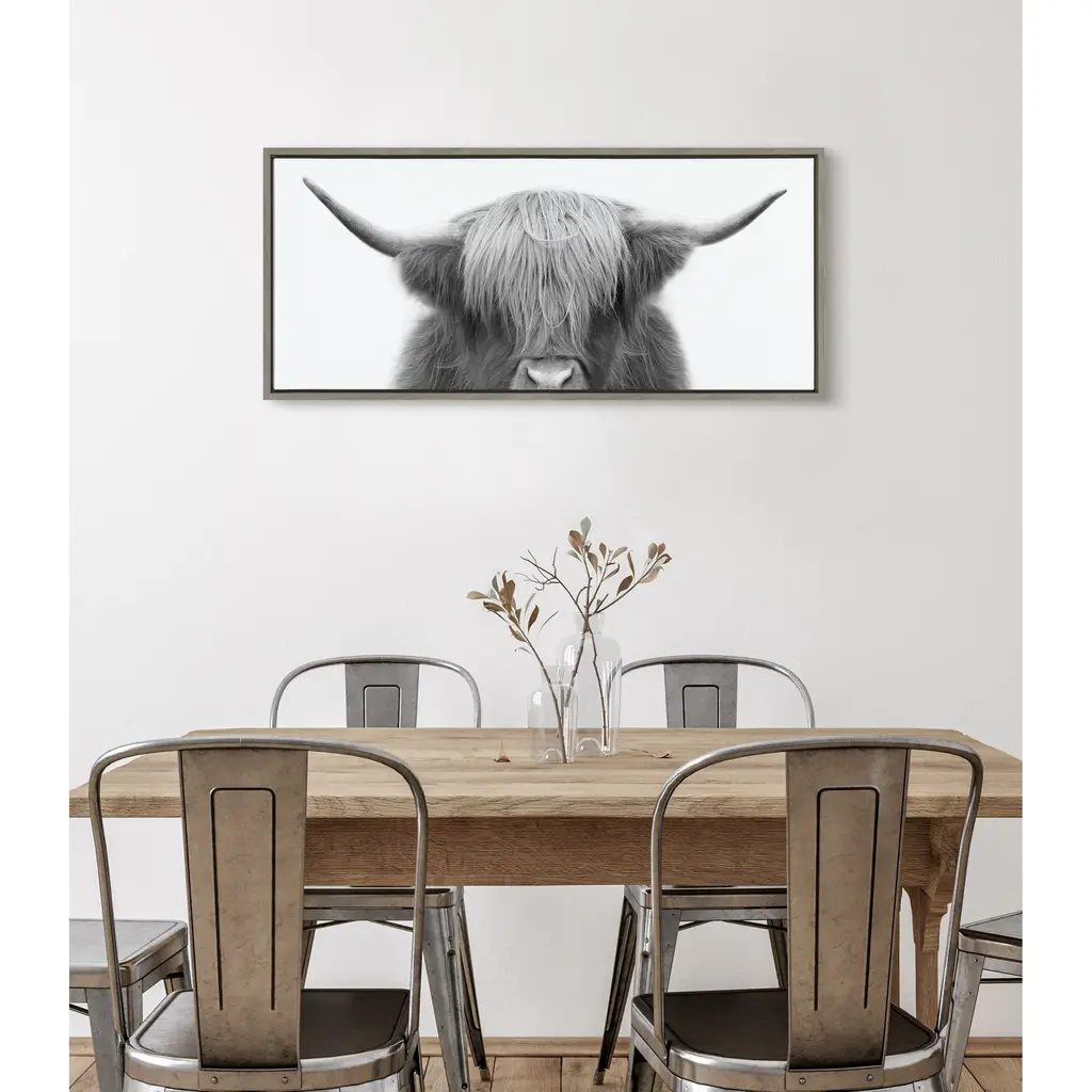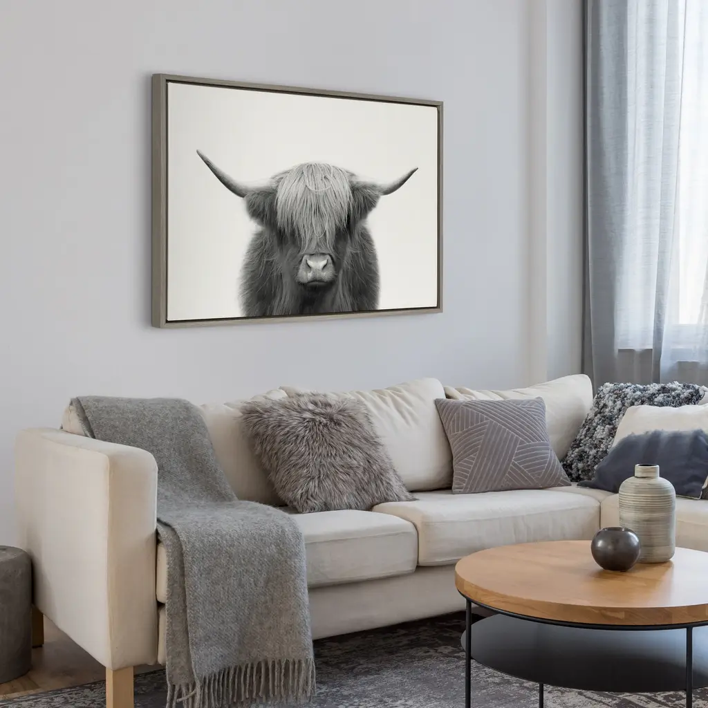 This chic, rustic cow portrait is a great way to give your home a modern farmhouse flair with its black and white look and regal-looking cow. Framed in the USA in Waunakee, Wisconsin, this linen textured canvas art will be a pleasure to look at every day in your living room, bedroom, nursery, or any room in the home. Printed on gallery-wrapped canvas and framed with a lightweight polystyrene frame, this wall art has two hangers already attached to the MDF back for easy wall display. The outer dimensions are 33 inches wide by 23 inches tall by 1.63 inches deep. Print Name: "Hey Dude Highland Cow Crop"