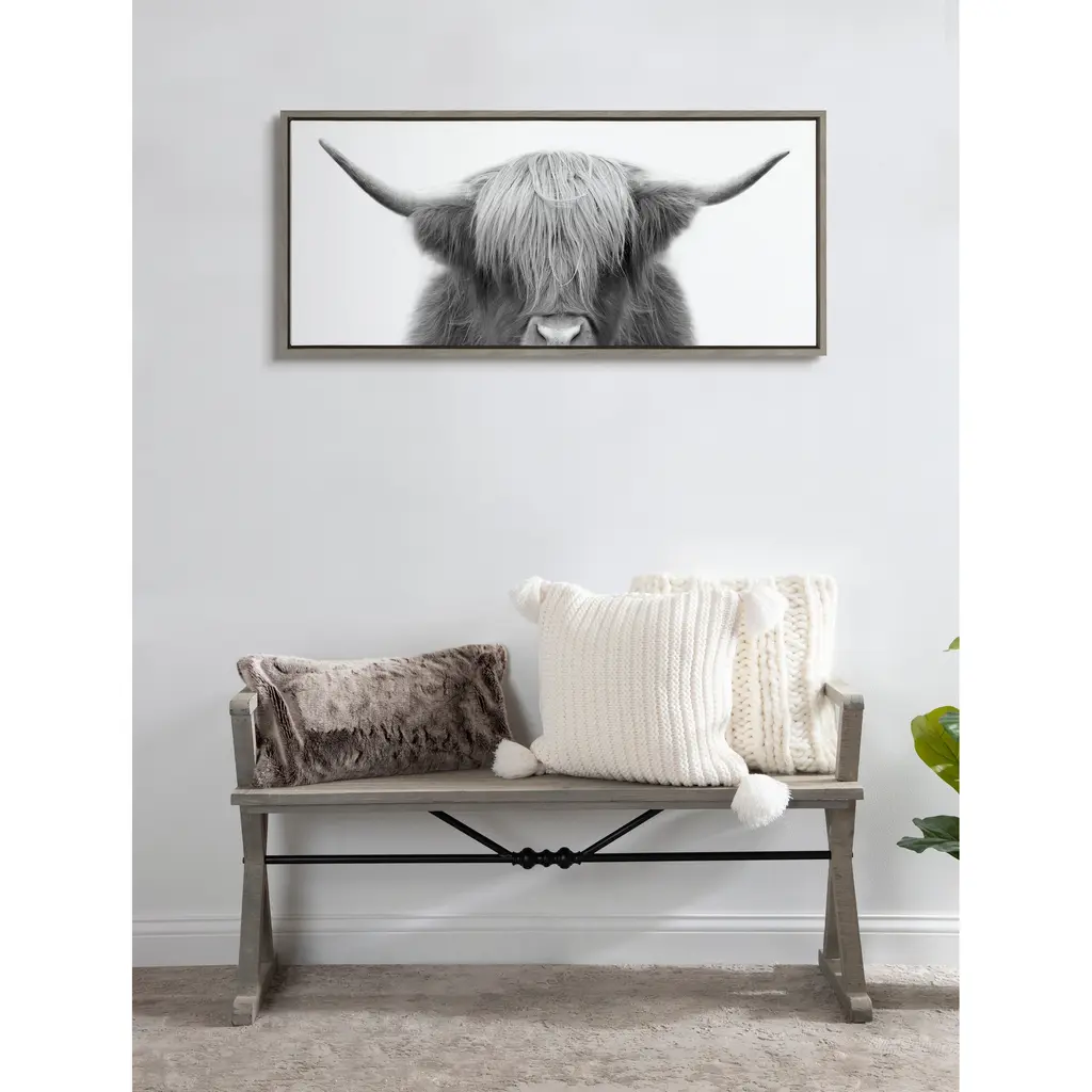 This chic, rustic cow portrait is a great way to give your home a modern farmhouse flair with its black and white look and regal-looking cow. Framed in the USA in Waunakee, Wisconsin, this linen textured canvas art will be a pleasure to look at every day in your living room, bedroom, nursery, or any room in the home. Printed on gallery-wrapped canvas and framed with a lightweight polystyrene frame, this wall art has two hangers already attached to the MDF back for easy wall display. The outer dimensions are 33 inches wide by 23 inches tall by 1.63 inches deep. Print Name: "Hey Dude Highland Cow Crop"