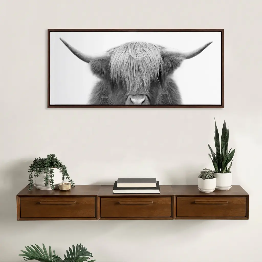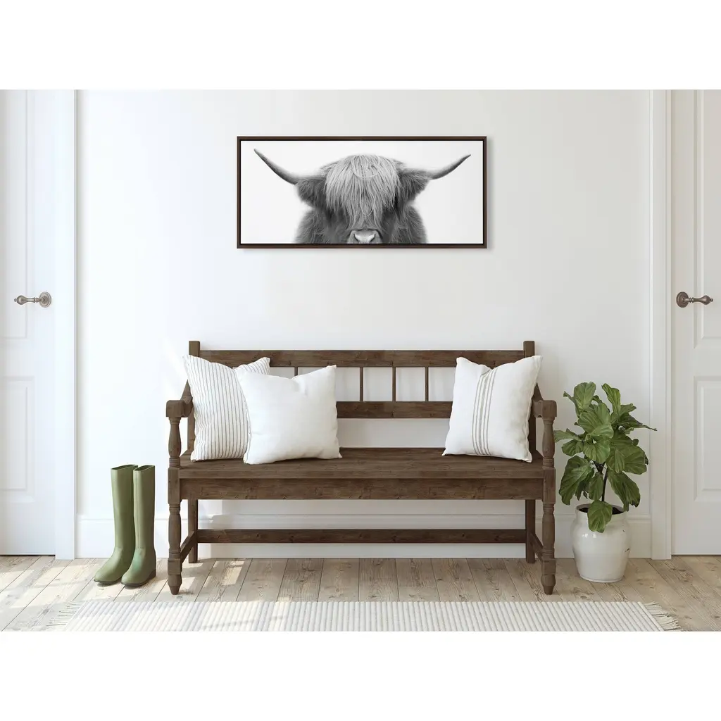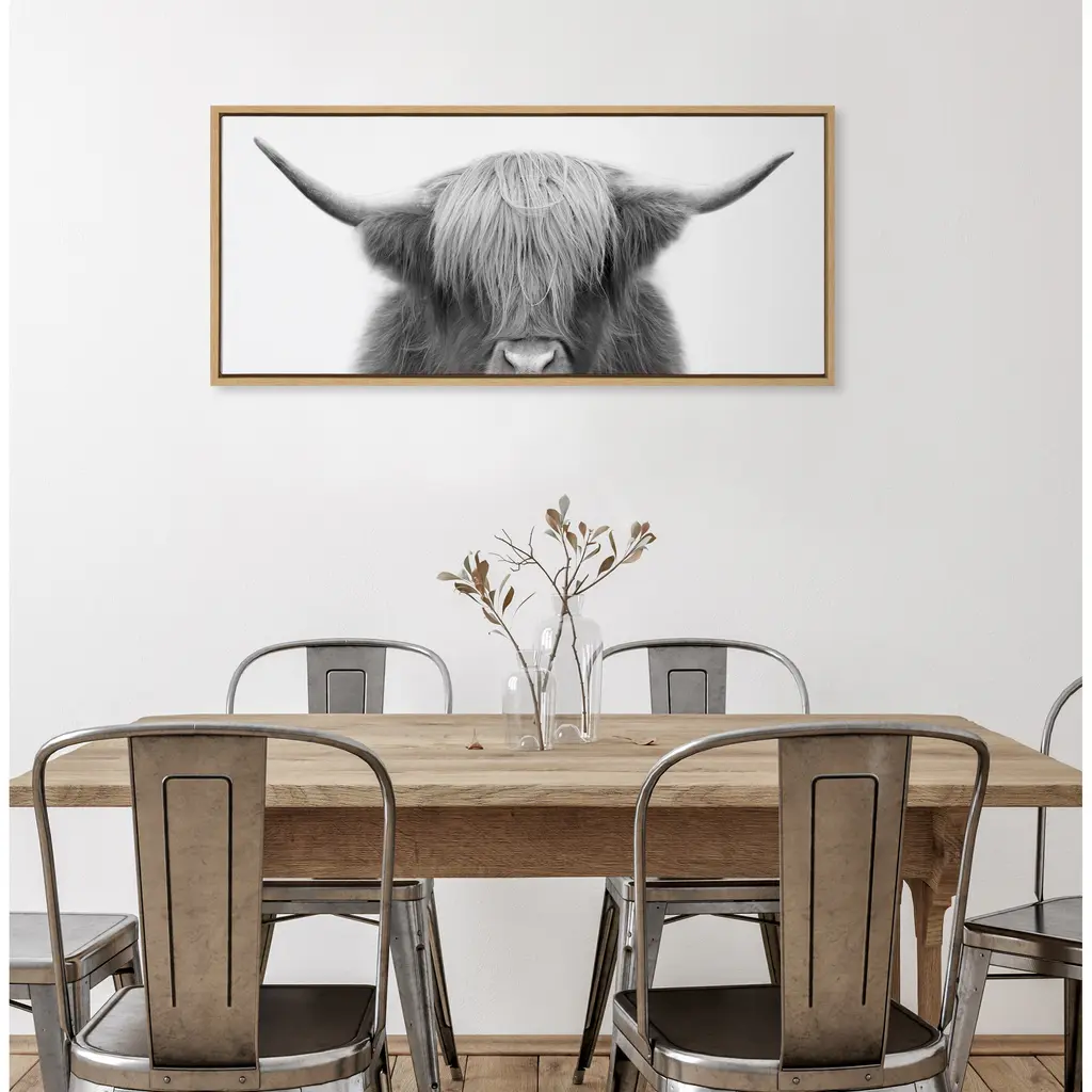 This chic, rustic cow portrait is a great way to give your home a modern farmhouse flair with its black and white look and regal-looking cow. Framed in the USA in Waunakee, Wisconsin, this linen textured canvas art will be a pleasure to look at every day in your living room, bedroom, nursery, or any room in the home. Printed on gallery-wrapped canvas and framed with a lightweight polystyrene frame, this wall art has two hangers already attached to the MDF back for easy wall display. The outer dimensions are 33 inches wide by 23 inches tall by 1.63 inches deep. Print Name: "Hey Dude Highland Cow Crop"