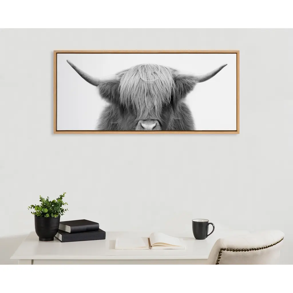 This chic, rustic cow portrait is a great way to give your home a modern farmhouse flair with its black and white look and regal-looking cow. Framed in the USA in Waunakee, Wisconsin, this linen textured canvas art will be a pleasure to look at every day in your living room, bedroom, nursery, or any room in the home. Printed on gallery-wrapped canvas and framed with a lightweight polystyrene frame, this wall art has two hangers already attached to the MDF back for easy wall display. The outer dimensions are 33 inches wide by 23 inches tall by 1.63 inches deep. Print Name: "Hey Dude Highland Cow Crop"