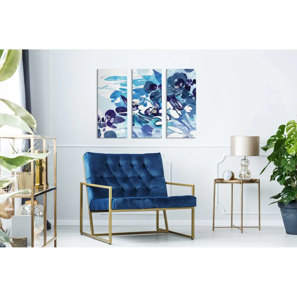 Immerse your walls in a cool blue floral theme with help from this calming tryptic. This canvas art set will be a pleasure to look at every day in your living room, bedroom, office, or any room in the home. These art prints also make an excellent gift for birthdays, holidays, or housewarming parties. Printed on gallery-wrapped canvas, this wall art has three hangers already attached to the back for easy wall display. The outer dimensions are 28 inches by 12 inches by 1.58 inches. Print Name: "Soulmate"