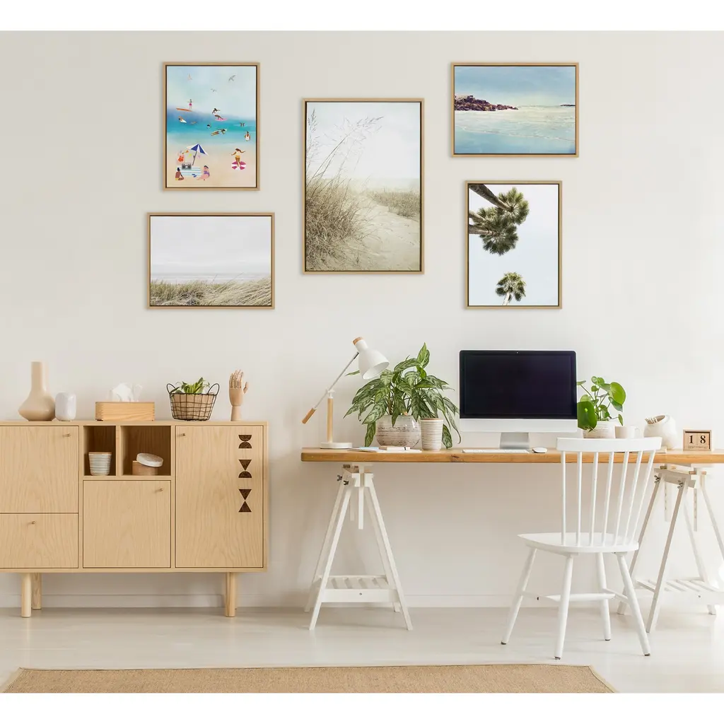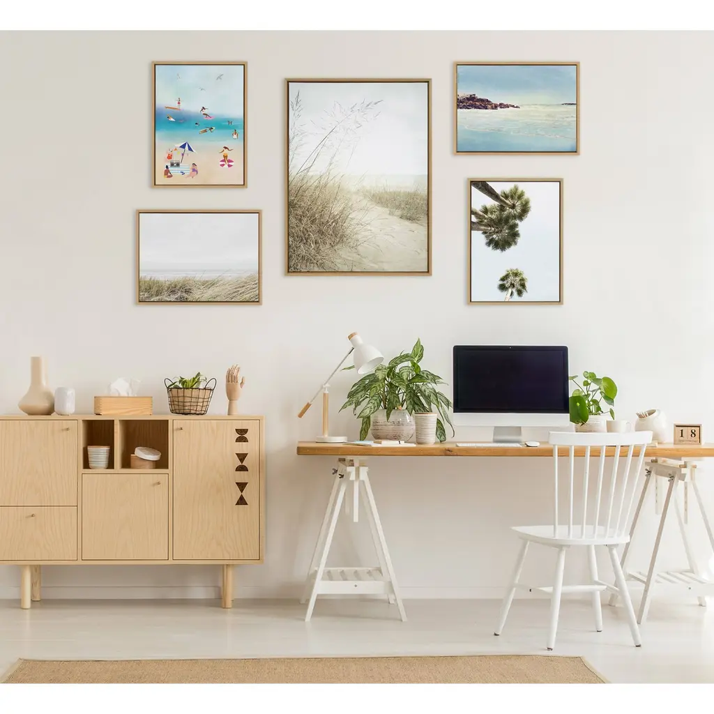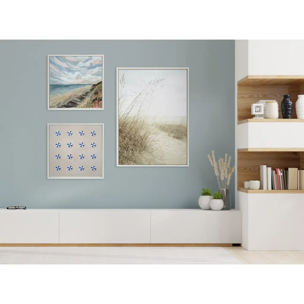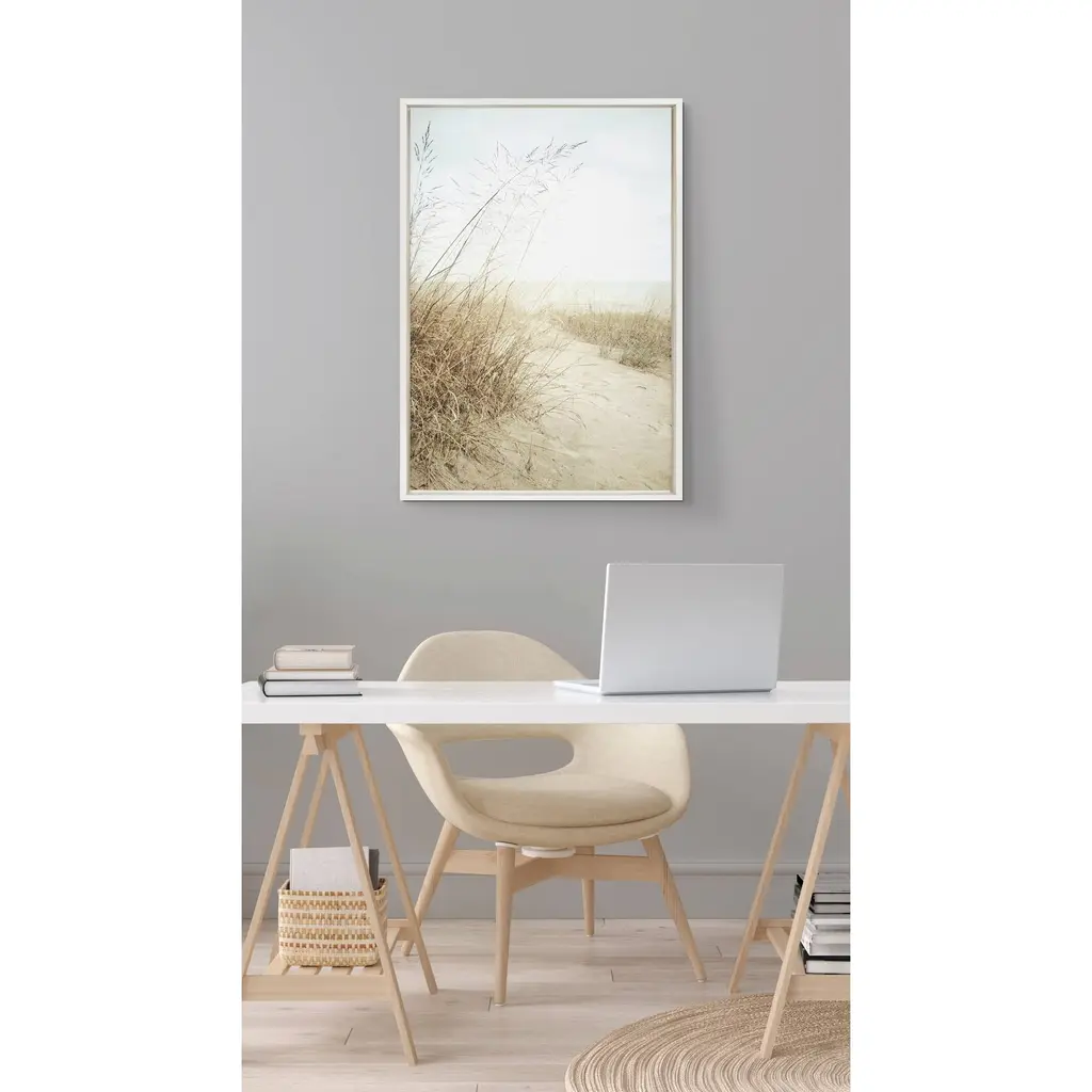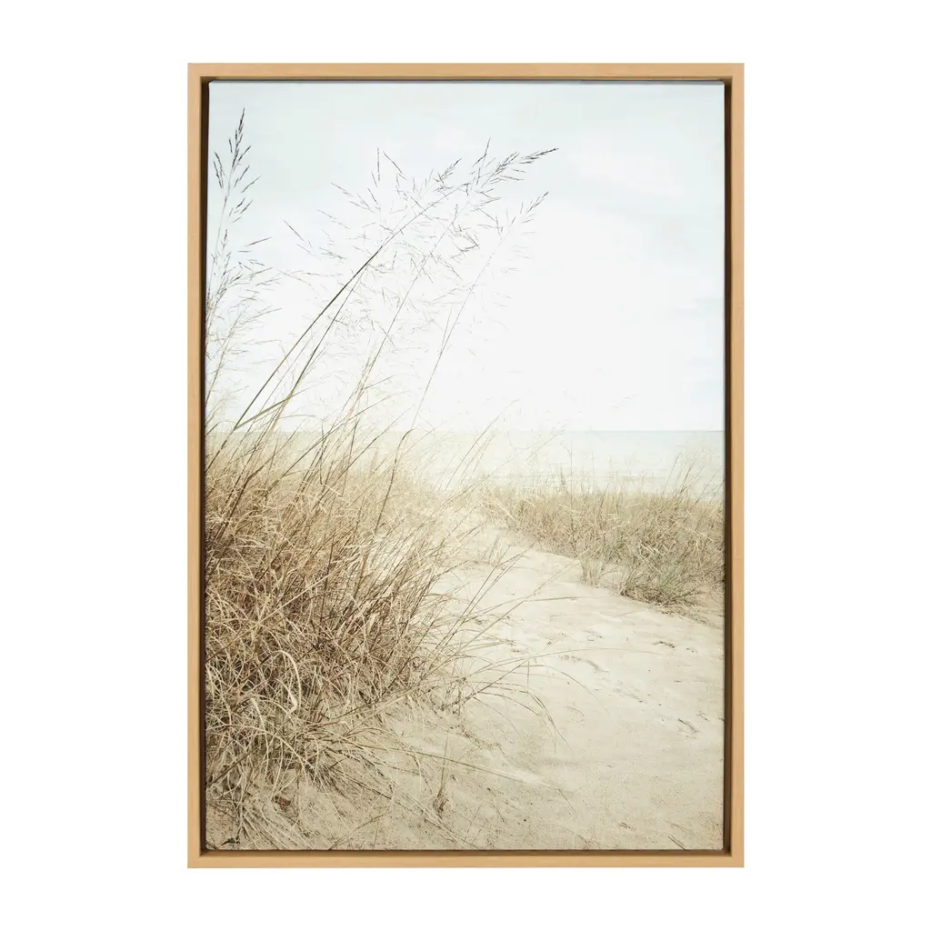 Take a relaxing walk through the windblown grass of the beach in this beautiful, coastal art print. Framed in the USA in Waunakee, Wisconsin, this floating canvas art will be a pleasure to look at every day in your living room, bedroom, office, or any room in the home. This art print also makes an excellent gift for birthdays, holidays, or house-warming parties. Printed on gallery-wrapped canvas and framed with a lightweight polystyrene frame, this wall art has two hangers already attached to the MDF back for easy wall display. The outer dimensions are 33 inches by 23 inches by 1.63 inches. Print Name: "Beach Grasses"