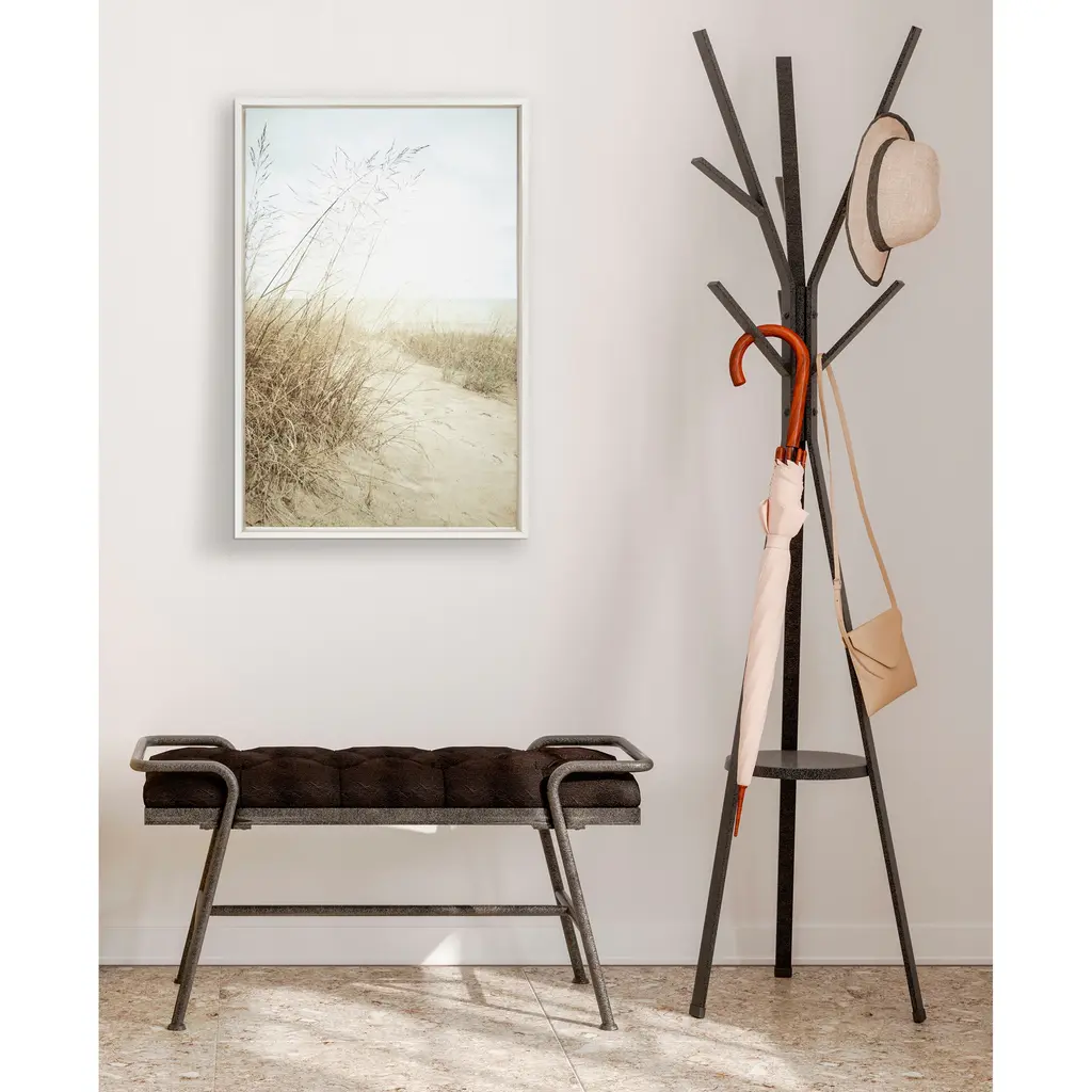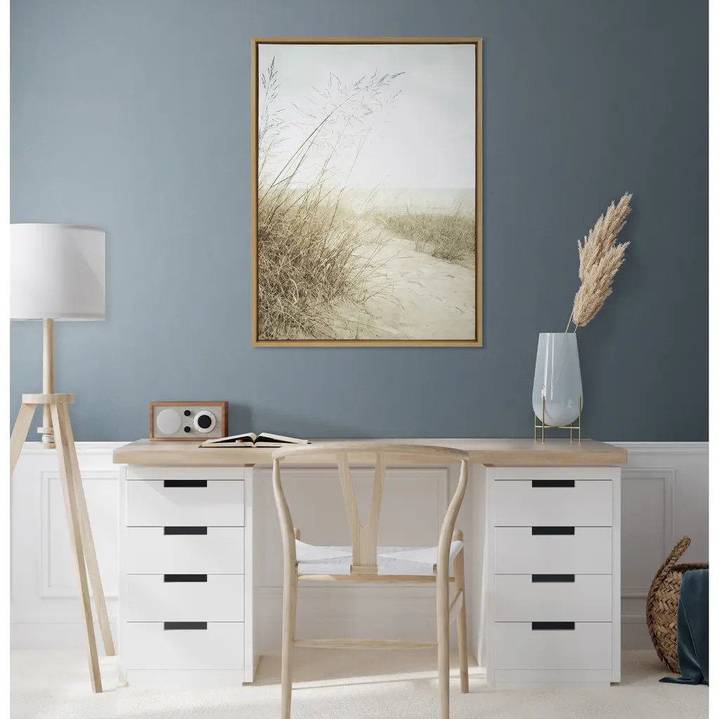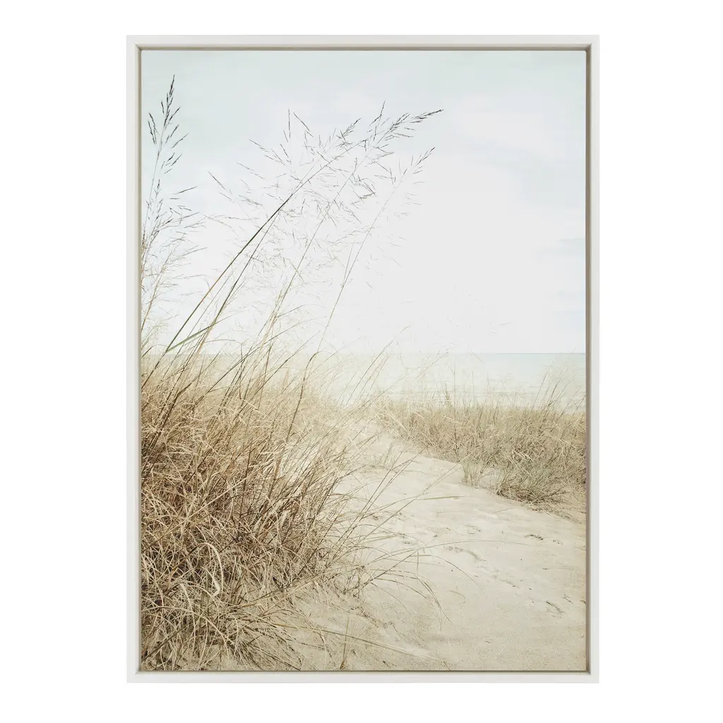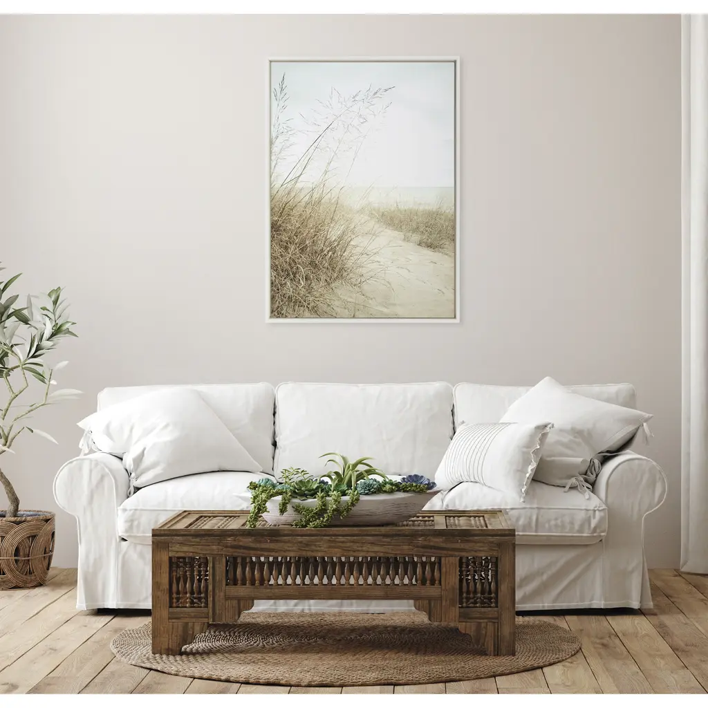Take a relaxing walk through the windblown grass of the beach in this beautiful, coastal art print. Framed in the USA in Waunakee, Wisconsin, this floating canvas art will be a pleasure to look at every day in your living room, bedroom, office, or any room in the home. This art print also makes an excellent gift for birthdays, holidays, or house-warming parties. Printed on gallery-wrapped canvas and framed with a lightweight polystyrene frame, this wall art has two hangers already attached to the MDF back for easy wall display. The outer dimensions are 33 inches by 23 inches by 1.63 inches. Print Name: "Beach Grasses"