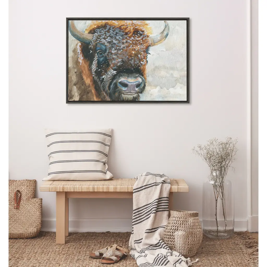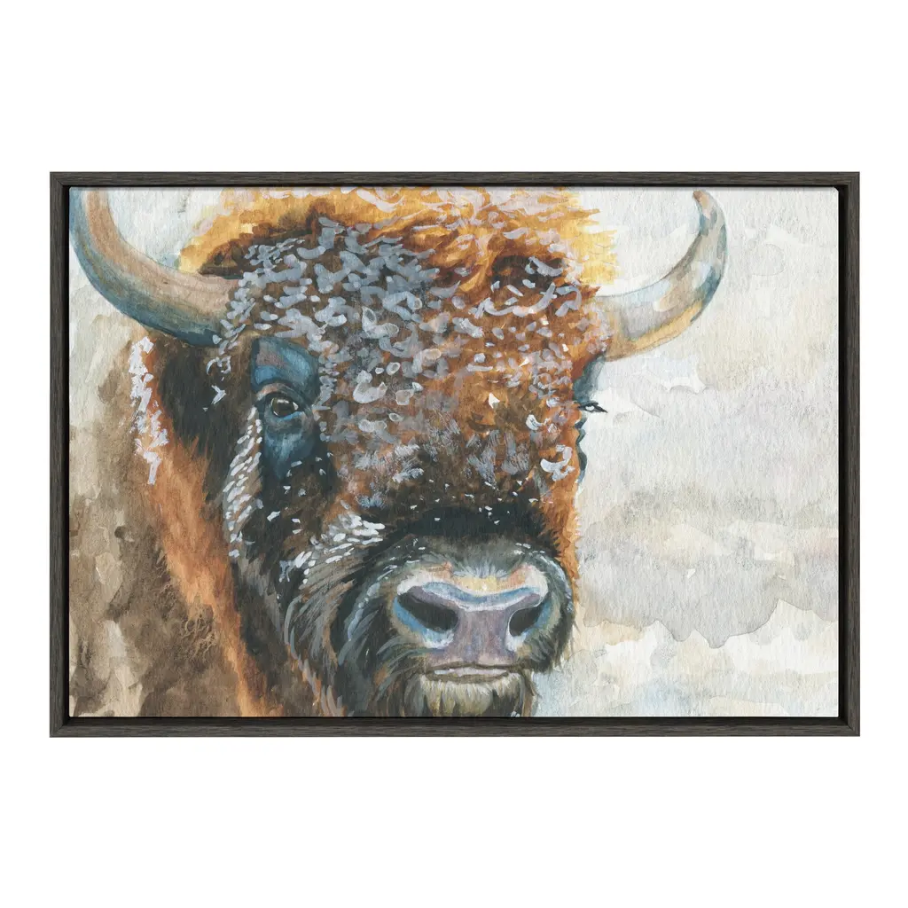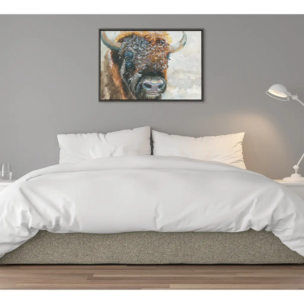 This painted buffalo portrait art is a perfect addition to any rustic or farmhouse-inspired room. With its realistic details and striking composition, this framed canvas wall art is sure to become a focal point of any space. Framed in the USA in Waunakee, Wisconsin, this modern floating canvas art is sure to bring joy to your space. Our design team curates art that will fit perfectly in any room of your home. Showcase this art in your living room, bedroom, home office, kitchen, bathroom, nursery, or anywhere you want to bring a little beauty and charm to your walls. Specializing in home décor, we are continually bringing timeless works of art for the traditional decorator as well as trend-forward pieces for that eclectic art lover. Our high-quality framed canvas art also makes excellent gifts for birthdays, holidays, or housewarming parties. Printed on gallery-wrapped canvas and framed with a simple gallery frame this wall art is easy to display on the wall and will match with any décor style. The outer dimensions are 23 inches by 33 inches by 1.6 inches. Print Name: "Bison"