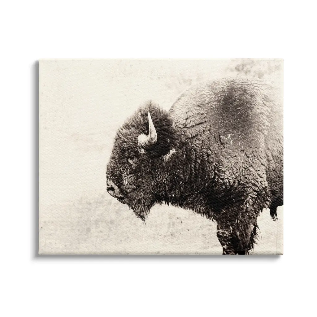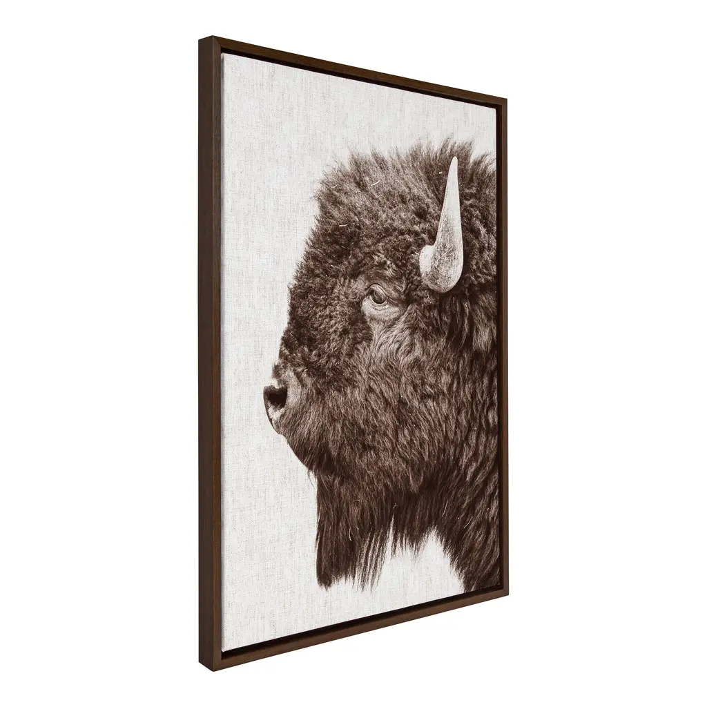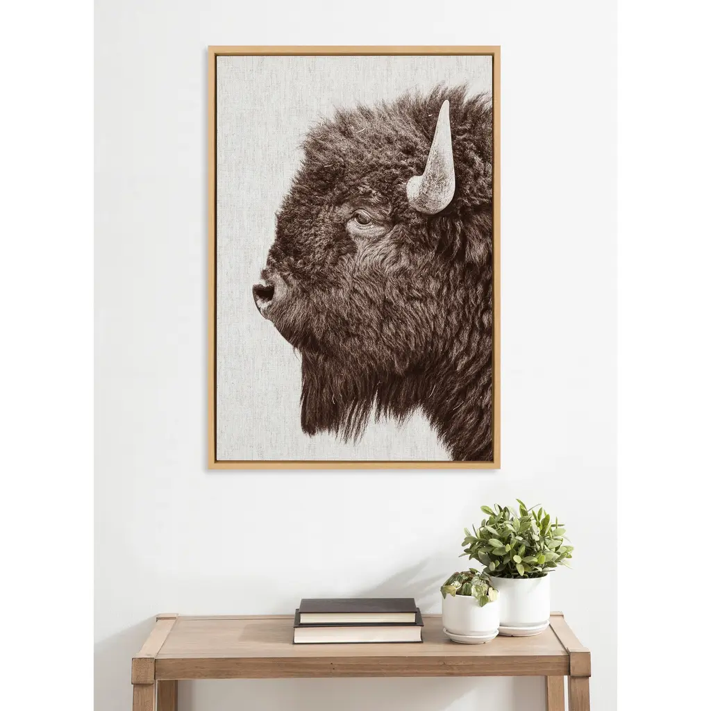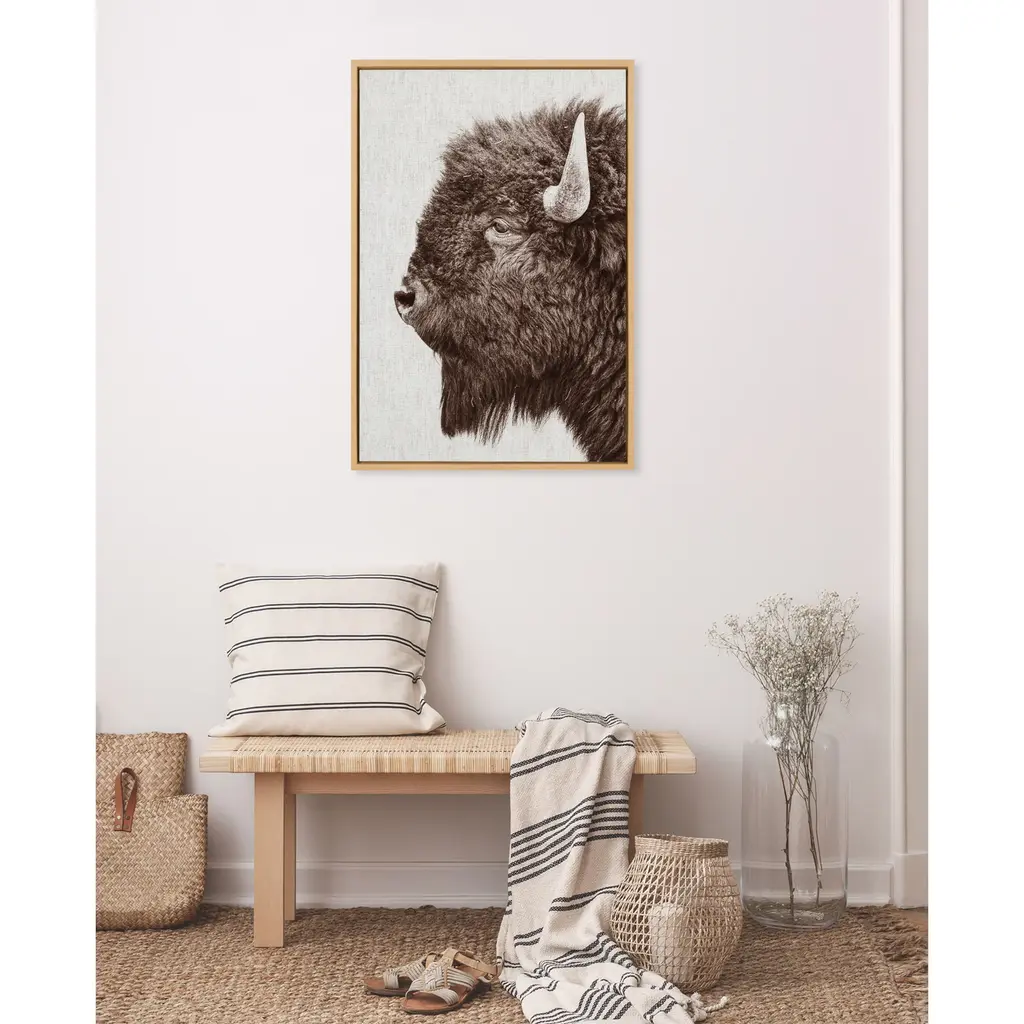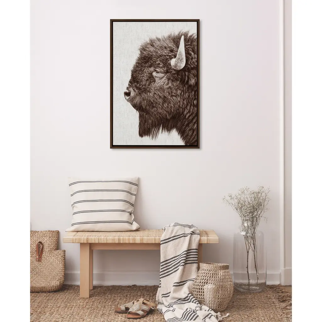 Provide your space with some whimsical appeal with this prairie bison portrait. This lovely, light piece by Amy Peterson Art Studio is perfect for any animal lover. Framed in the USA in Waunakee, Wisconsin, this modern floating canvas art is sure to bring joy to your space. Our design team curates art that will fit perfectly in any room of your home. Showcase this art in your living room, bedroom, home office, kitchen, bathroom, nursery, or anywhere you want to bring a little beauty and charm to your walls. Specializing in home décor, we are continually bringing timeless works of art for the traditional decorator as well as trend-forward pieces for that eclectic art lover. Our high-quality framed canvas art also makes excellent gifts for birthdays, holidays, or housewarming parties. Printed on gallery-wrapped canvas and framed with a simple gallery frame this wall art is easy to display on the wall and will match with any décor style. The outer dimensions are 23 inches by 33 inches by 1.6 inches. Print Name: "Bison Profile Woven Neutral Linen"