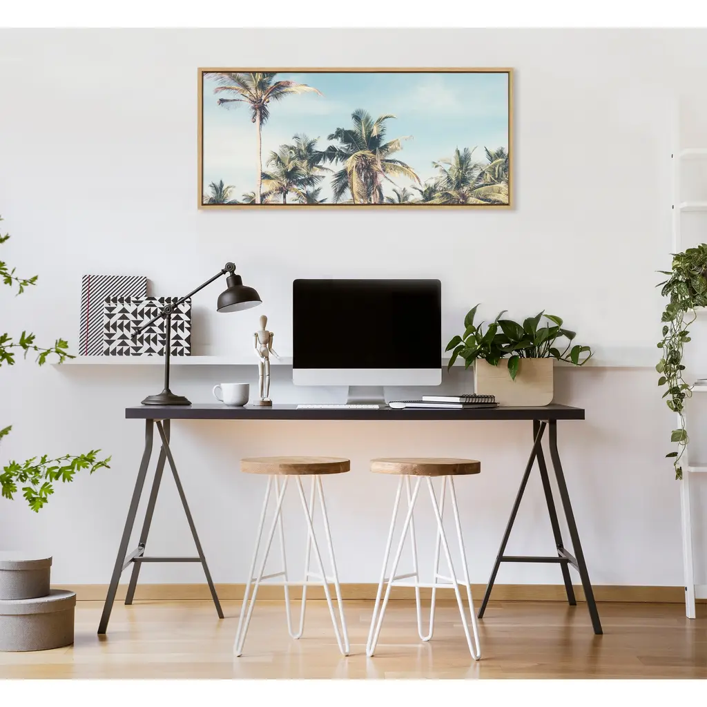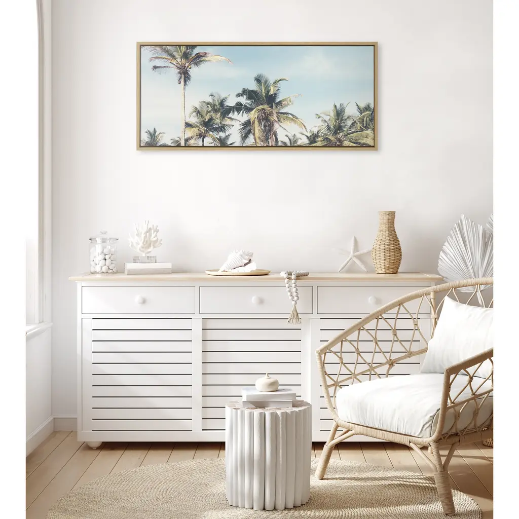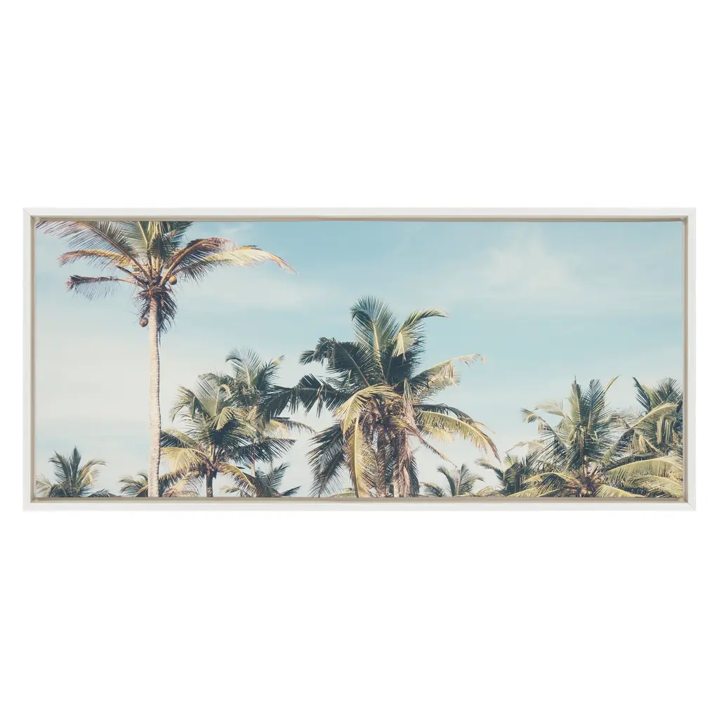 If you're looking for a warm, beachy vibe for your living room, bedroom, bathroom, entryway, or dining room, look no further than this palm tree-inspired canvas. With its long and narrow size, it's perfect for that tall skinny vertical space or wide skinny horizontal space. Framed in the USA in Waunakee, Wisconsin, this floating canvas art will be a pleasure to look at every day in your living room, bedroom, nursery, or any room in the home. This art print also makes an excellent gift for birthdays, holidays, or housewarming parties. Printed on gallery-wrapped canvas and framed with a lightweight polystyrene frame, this wall art is easy to display on the wall. The outer dimensions are 18 inches by 40 inches by 1.6 inches. Print Name: "Coastal Coconut Palm Tree Beach"