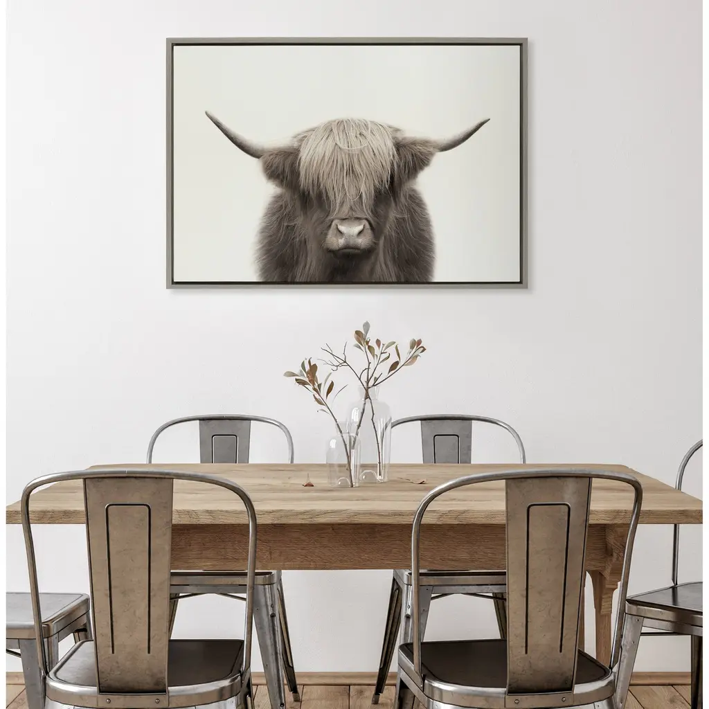 This chic, rustic cow portrait is a great way to give your home a modern farmhouse flair with its warm, rustic look and regal-looking cow. Framed in the USA in Waunakee, Wisconsin, this linen textured canvas art will be a pleasure to look at every day in your living room, bedroom, nursery, or any room in the home. Printed on gallery-wrapped canvas and framed with a lightweight polystyrene frame, this wall art has two hangers already attached to the MDF back for easy wall display. The outer dimensions are 33 inches tall by 23 inches wide by 1.63 inches deep. Print Name: "Hey Dude Highland Cow Color"