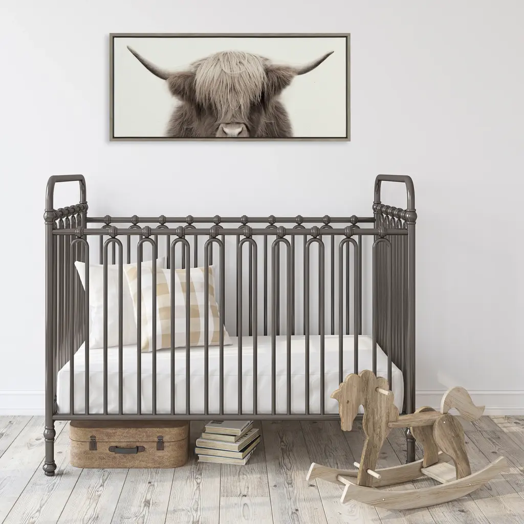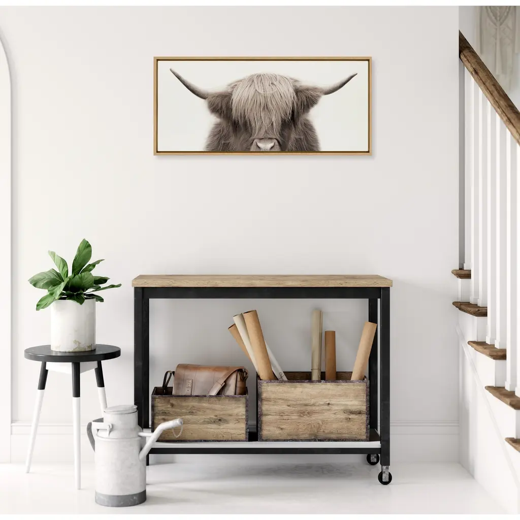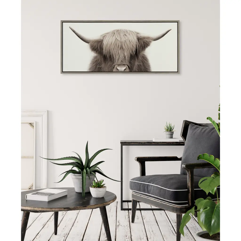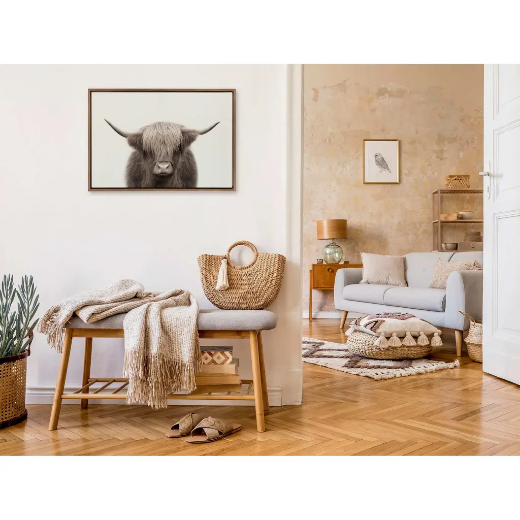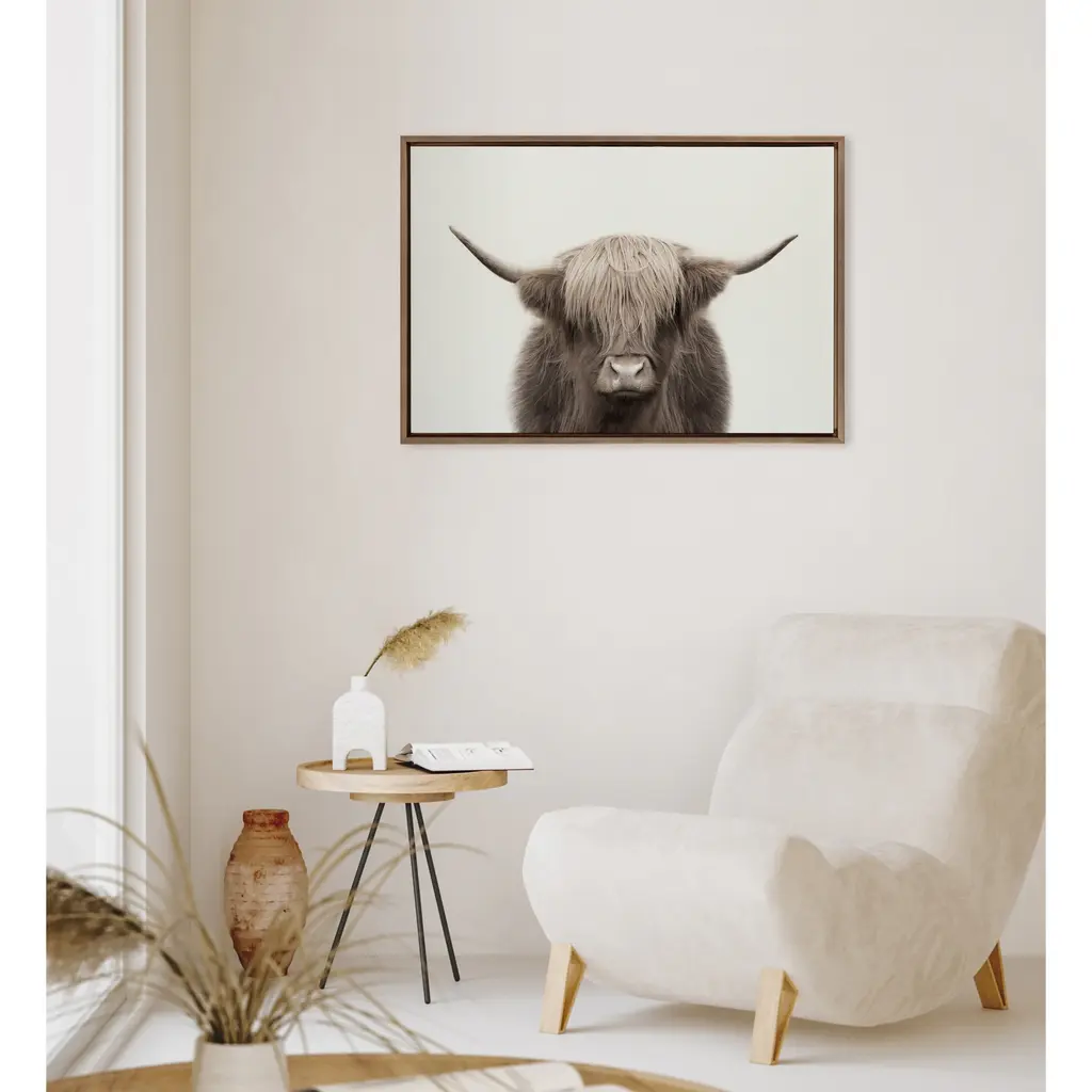 This chic, rustic cow portrait is a great way to give your home a modern farmhouse flair with its warm, rustic look and regal-looking cow. Framed in the USA in Waunakee, Wisconsin, this linen textured canvas art will be a pleasure to look at every day in your living room, bedroom, nursery, or any room in the home. Printed on gallery-wrapped canvas and framed with a lightweight polystyrene frame, this wall art has two hangers already attached to the MDF back for easy wall display. The outer dimensions are 33 inches tall by 23 inches wide by 1.63 inches deep. Print Name: "Hey Dude Highland Cow Color"