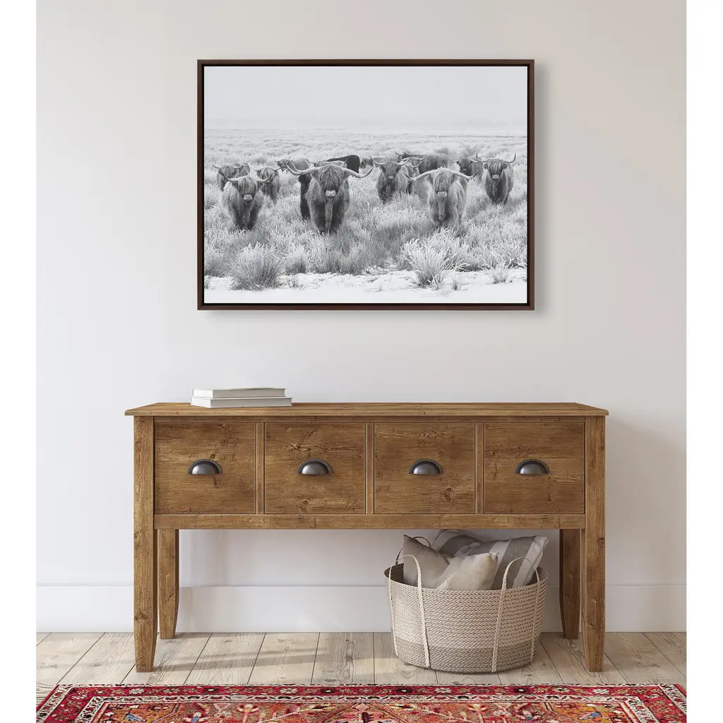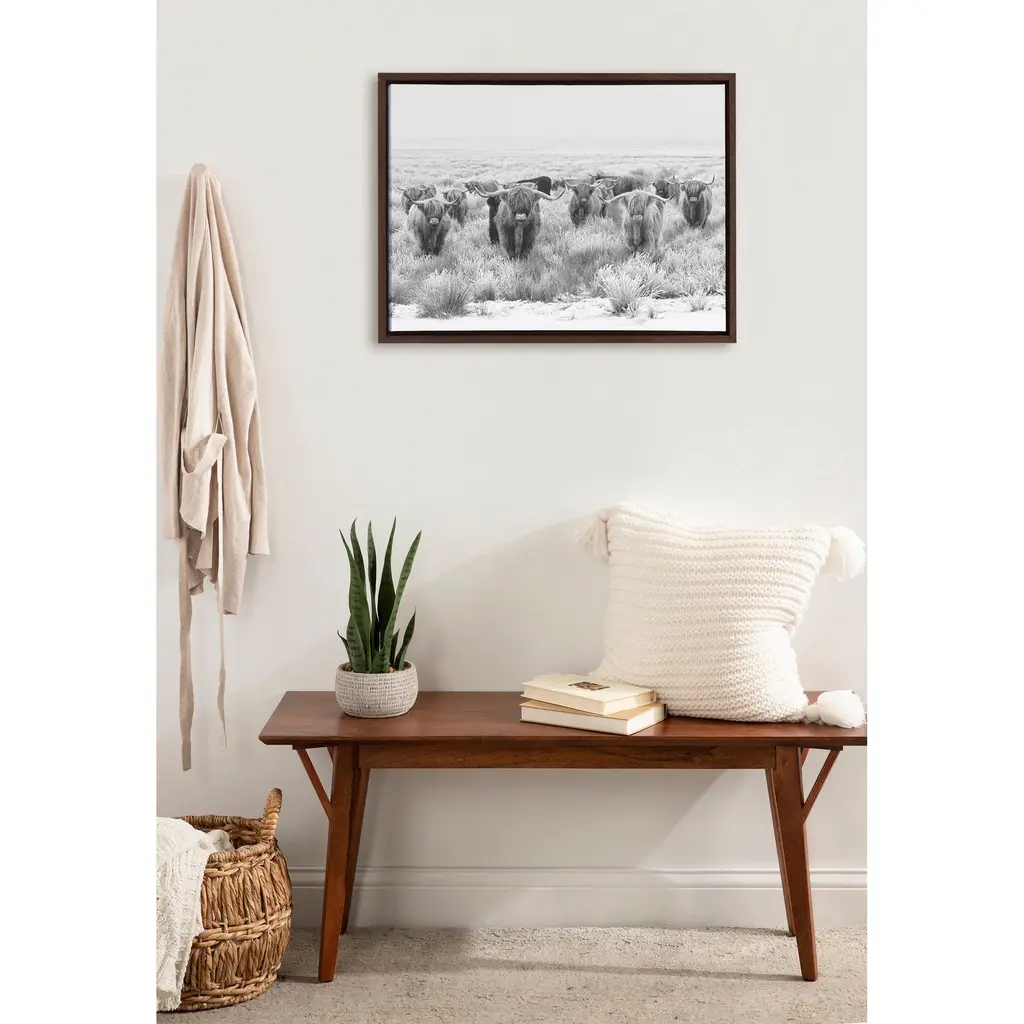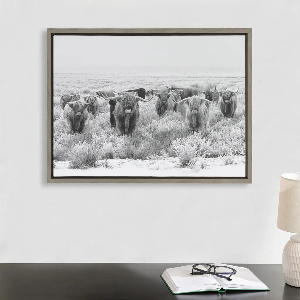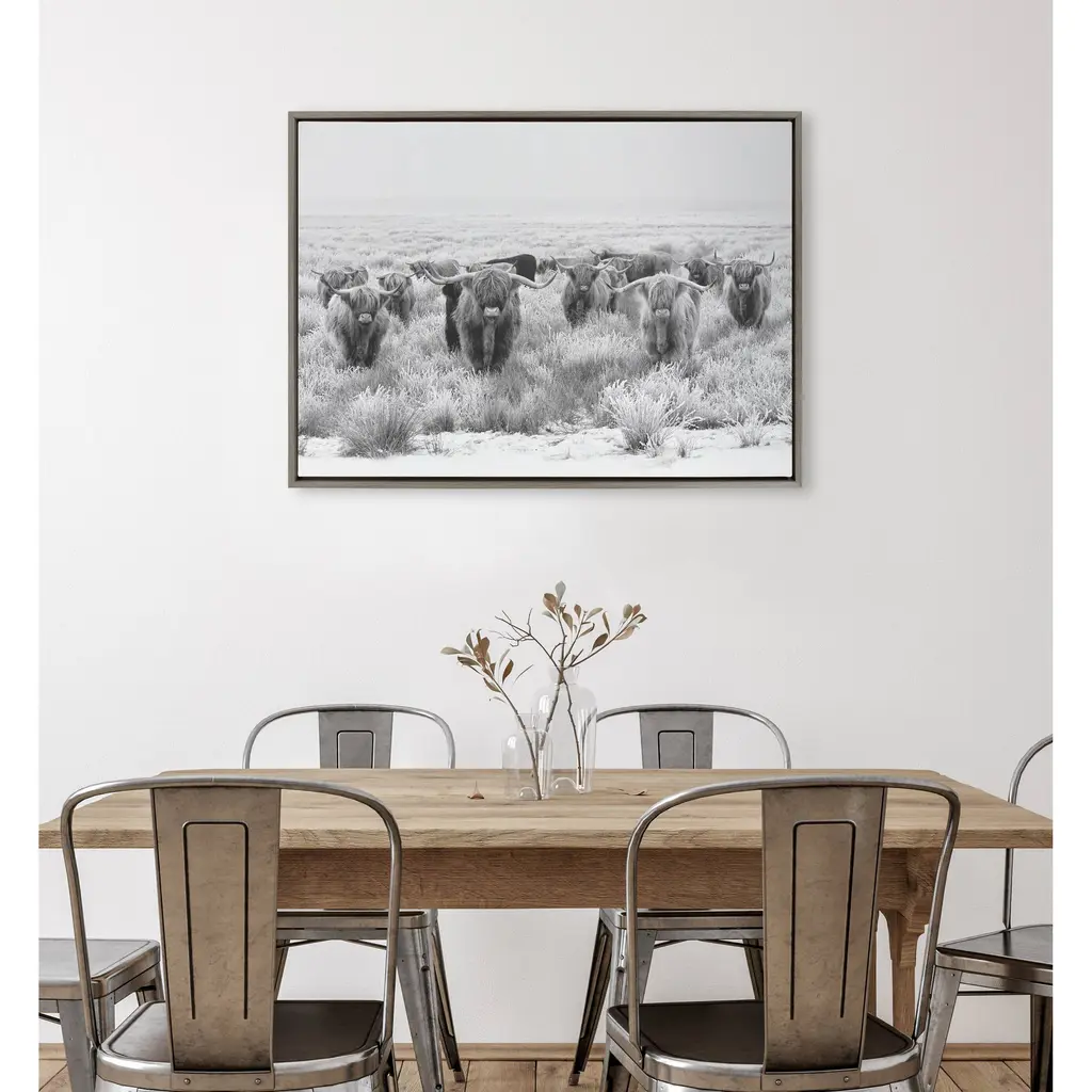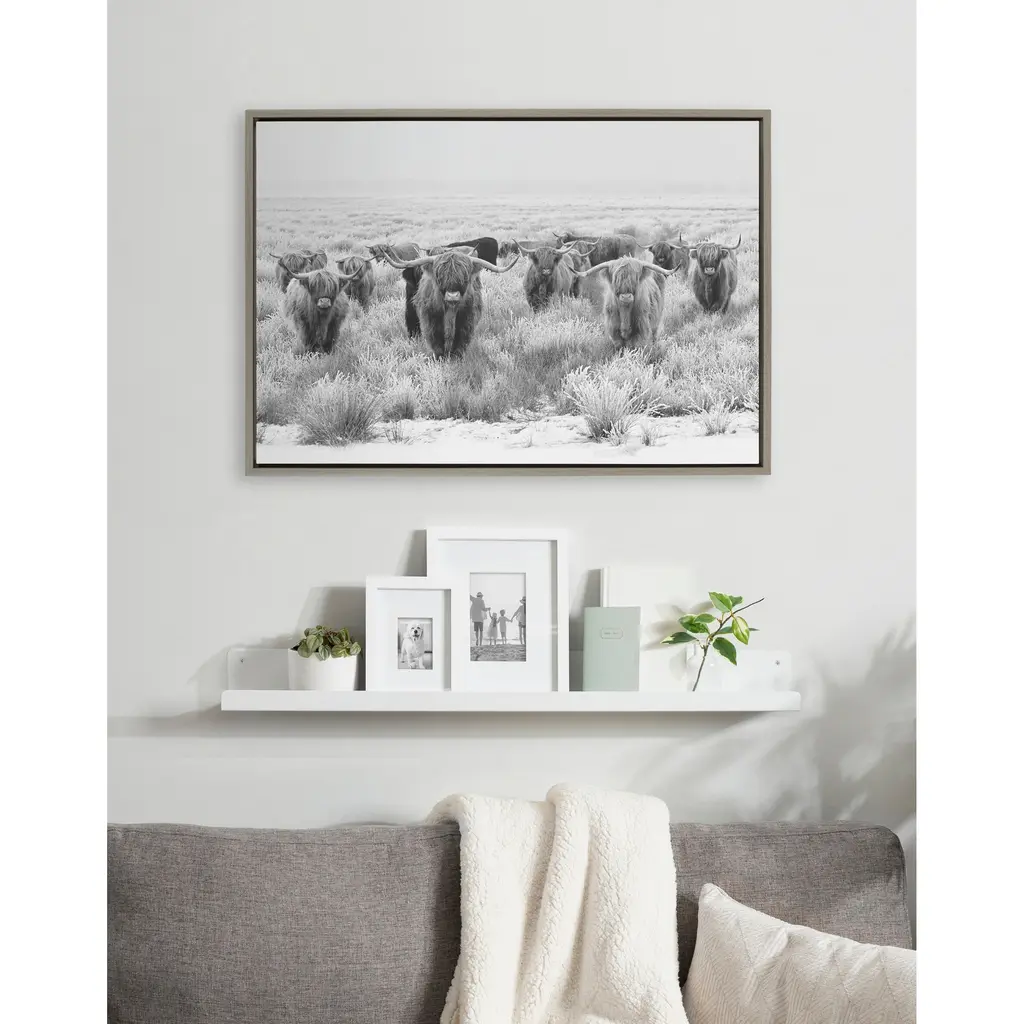 Join the herd with this charming rustic-inspired Highland Cow art print! Framed in the USA in Waunakee, Wisconsin, this floating canvas art will be a pleasure to look at every day in your living room, bedroom, office, or any room in the home. This art print also makes an excellent gift for birthdays, holidays, or housewarming parties. Printed on gallery-wrapped canvas and framed with a lightweight polystyrene frame, this wall art has two hangers already attached to the MDF back for easy wall display. The outer dimensions are 40 inches wide by 18 inches tall by 1.62 inches deep. Print Name: "Herd of Highland Cows Black and White"