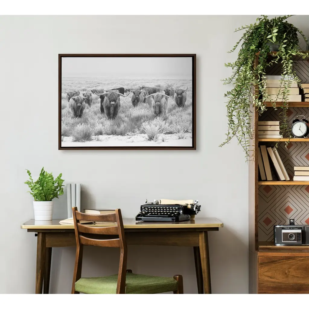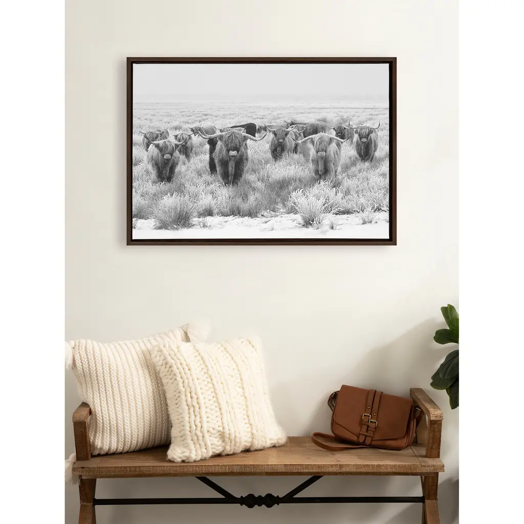 Join the herd with this charming rustic-inspired Highland Cow art print! Framed in the USA in Waunakee, Wisconsin, this floating canvas art will be a pleasure to look at every day in your living room, bedroom, office, or any room in the home. This art print also makes an excellent gift for birthdays, holidays, or housewarming parties. Printed on gallery-wrapped canvas and framed with a lightweight polystyrene frame, this wall art has two hangers already attached to the MDF back for easy wall display. The outer dimensions are 40 inches wide by 18 inches tall by 1.62 inches deep. Print Name: "Herd of Highland Cows Black and White"