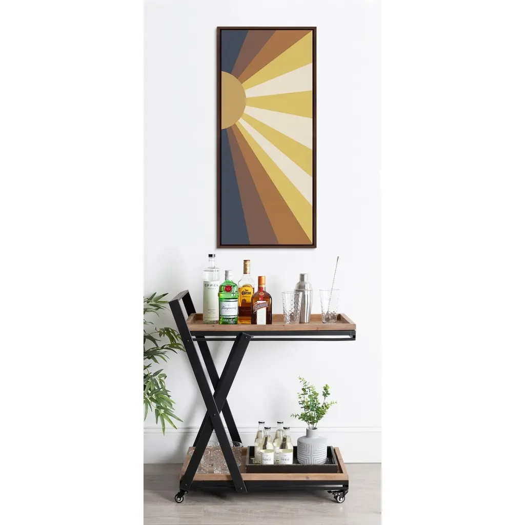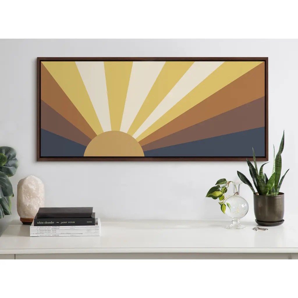 This vintage, 70s-inspired sunset art print is the perfect way to capture a groovy aesthetic on your wall with its funky color palette and happy vibes. Framed in the USA in Waunakee, Wisconsin, this floating canvas art will be a pleasure to look at every day in your living room, bedroom, office, or any room in the home. This art print also makes an excellent gift for birthdays, holidays, or housewarming parties. Printed on gallery-wrapped canvas and framed with a lightweight polystyrene frame, this wall art has two hangers already attached to the MDF back for easy wall display. The outer dimensions are 40 inches by 18 inches by 1.62 inches. Print Name: "Retro Sunset"