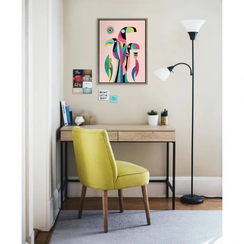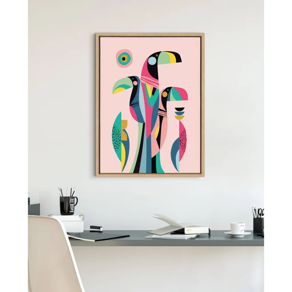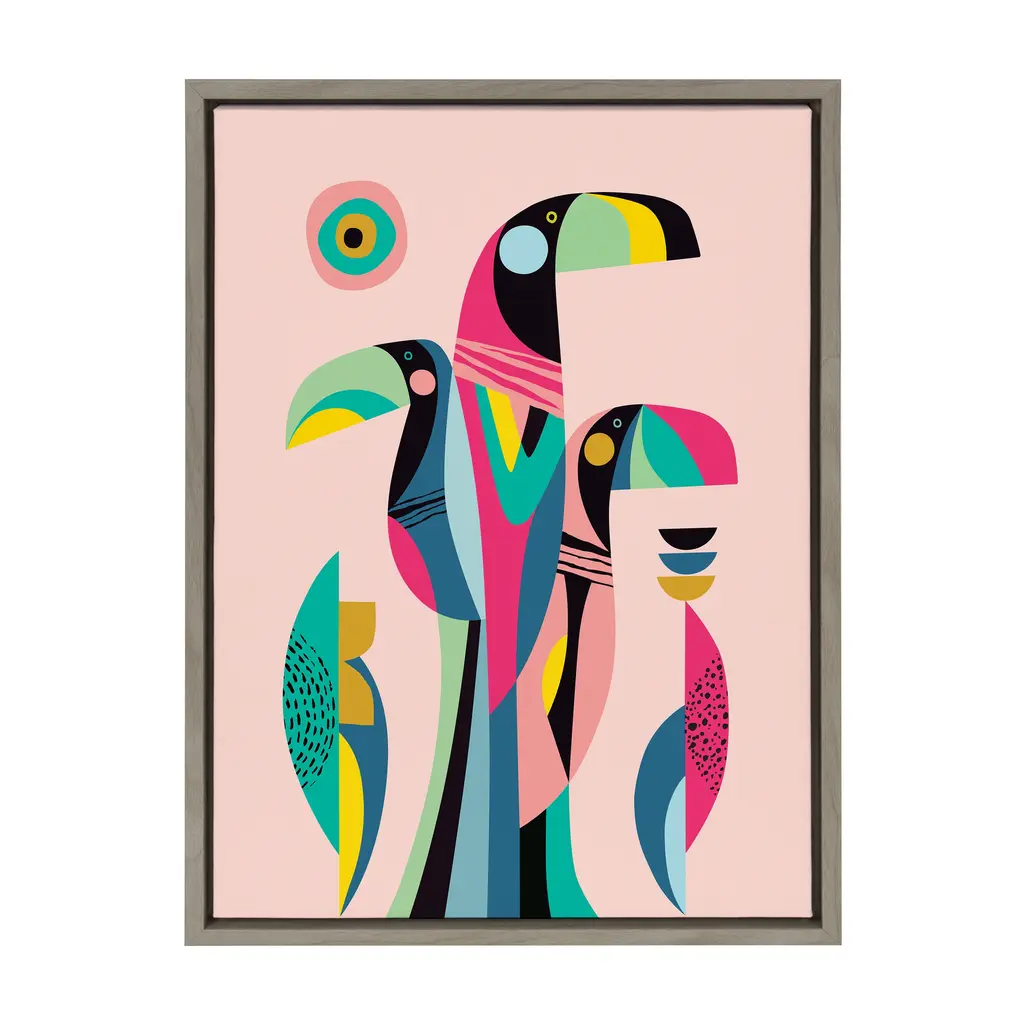 This colorful family of toucans makes your home feel like a vibrant, tropical cabana with its colorful design! Framed in the USA in Waunakee, Wisconsin, this floating canvas art will be a pleasure to look at every day in your living room, bedroom, nursery, or any room that needs a tropical accent. This art print also makes an excellent gift for birthdays, holidays, or house-warming parties. Printed on gallery-wrapped canvas and framed with a lightweight polystyrene frame, this wall art has two hangers already attached to the MDF back for easy wall display. The outer dimensions are 24 inches tall by 18 inches wide by 1.63 inches deep. Print Name: "Mid Century Modern Tropical Toucan"