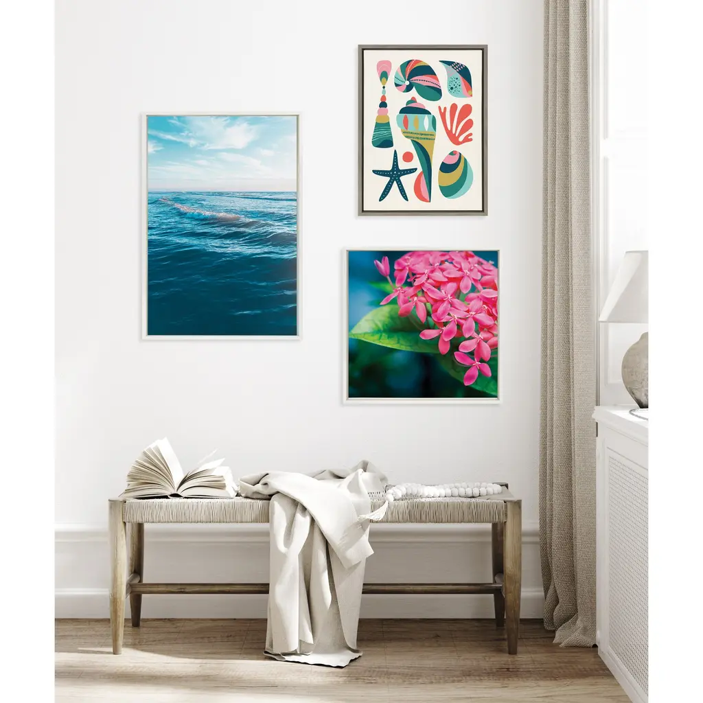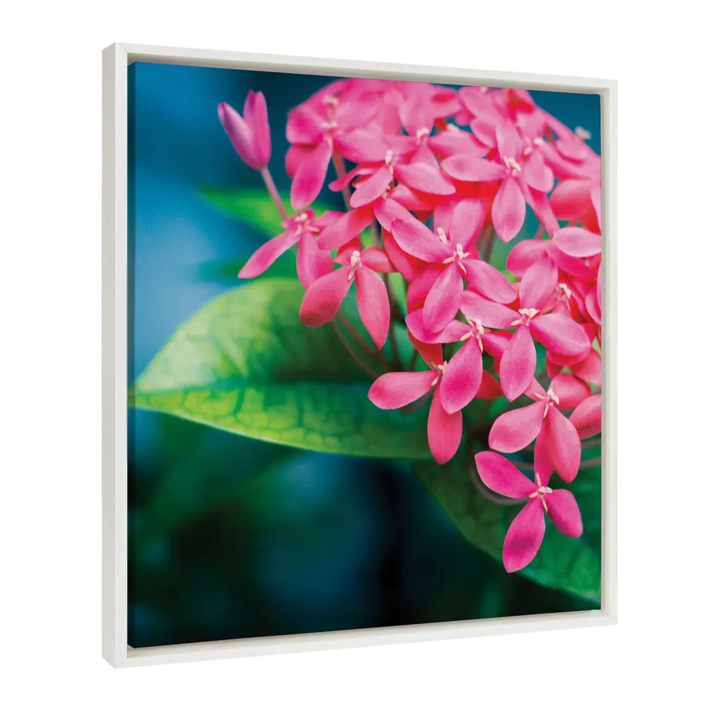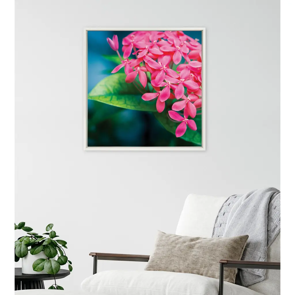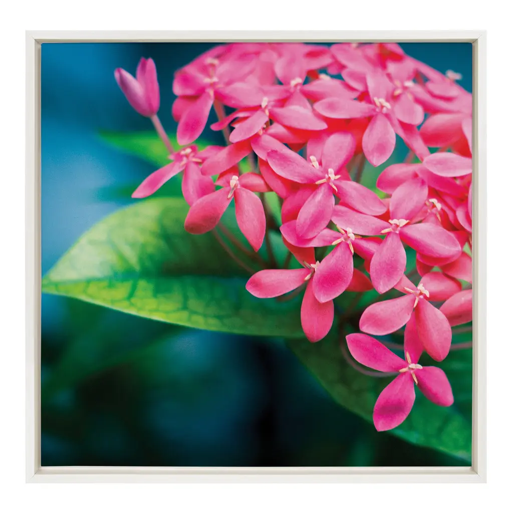 Add a burst of color to your living space with this vibrant floral photography art print. Framed in white, this canvas print by Stephanie Klatt is perfect for adding a tropical touch to your home decor. Framed in the USA in Waunakee, Wisconsin, this modern floating canvas art is sure to bring joy to your space. Our design team curates art that will fit perfectly in any room of your home. Showcase this art in your living room, bedroom, home office, kitchen, bathroom, nursery, or anywhere you want to bring a little beauty and charm to your walls. Specializing in home décor, we are continually bringing timeless works of art for the traditional decorator as well as trend-forward pieces for that eclectic art lover. Our high-quality framed canvas art also makes excellent gifts for birthdays, holidays, or housewarming parties. Printed on gallery-wrapped canvas and framed with a simple gallery frame this wall art is easy to display on the wall and will match with any décor style. The outer dimensions are 22 inches by 22 inches by 1.6 inches. Print Name: "Tropical Flower Blossom"