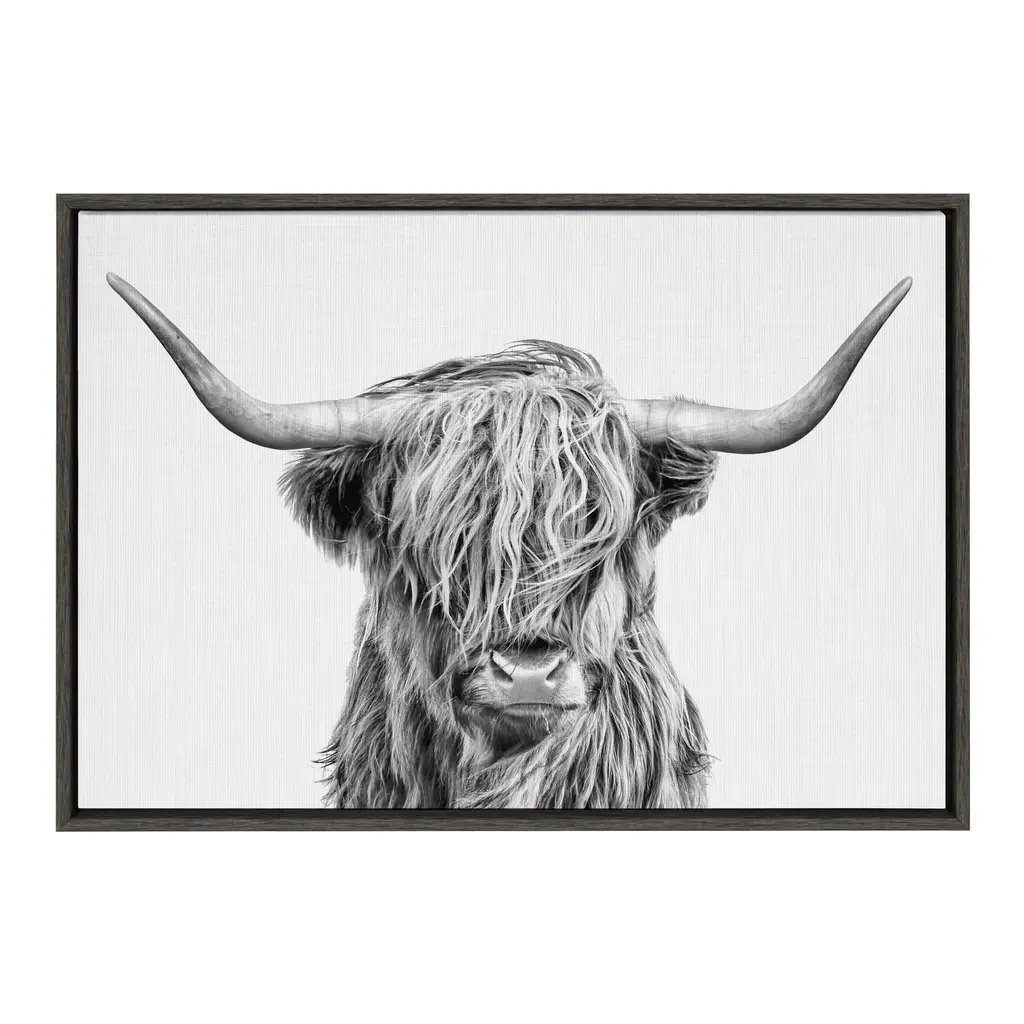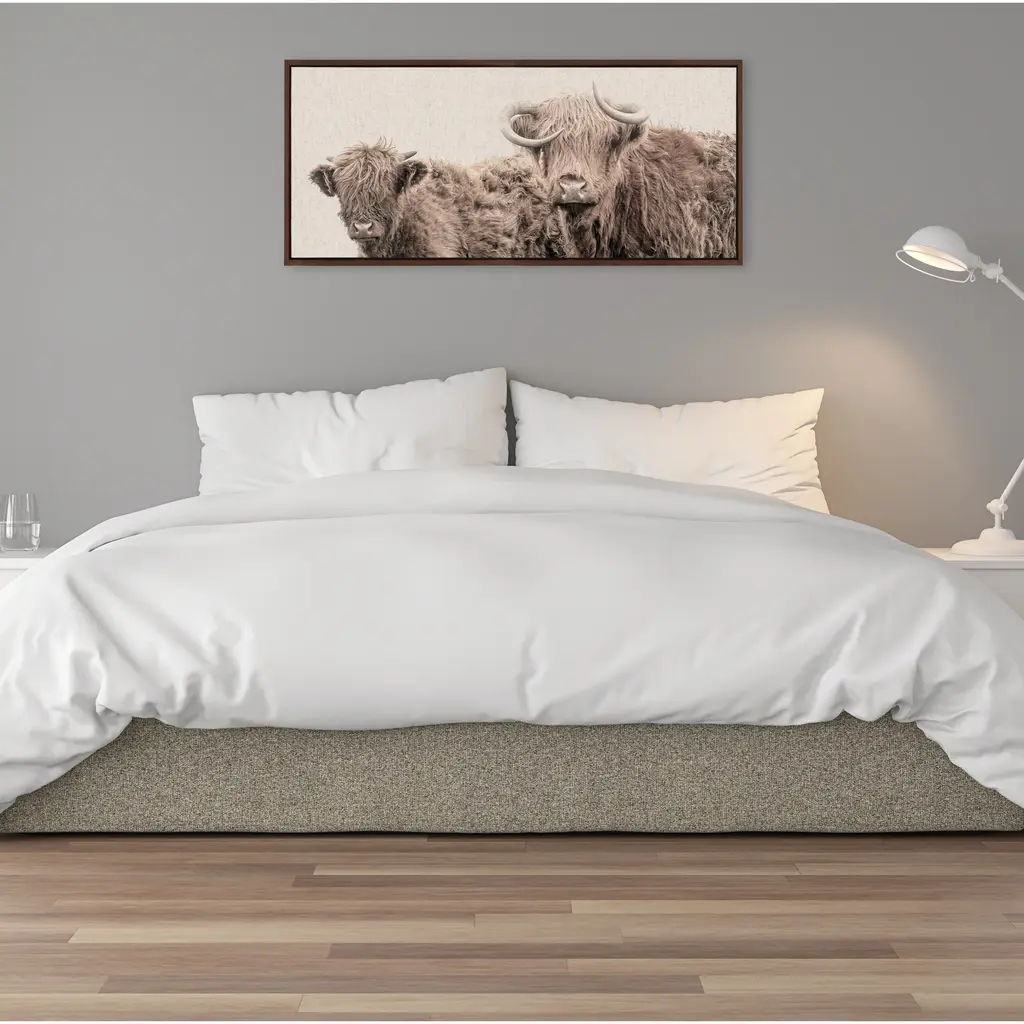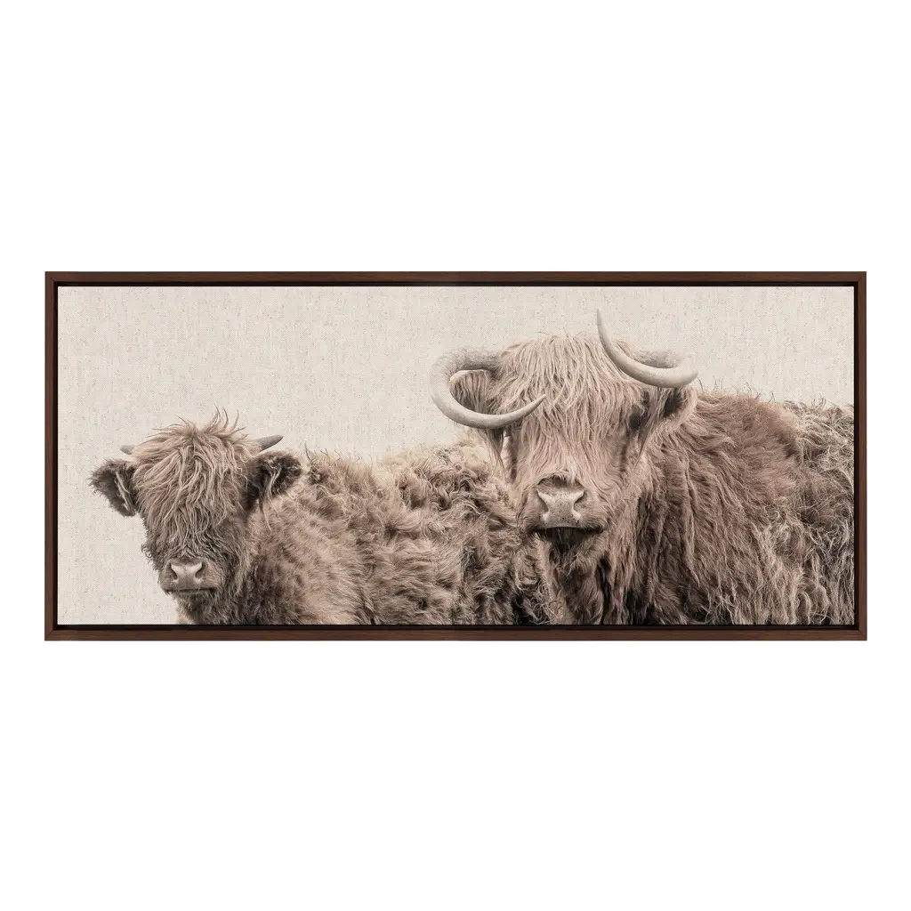 Introduce the charm of the countryside into your home with this stunning pair of rustic cows by Amy Peterson Art Studio. This dramatic depiction of beloved Highland Cows is the perfect refined addition to your home. Framed in the USA in Waunakee, Wisconsin, this modern floating canvas art is sure to bring joy to your space. Our design team curates art that will fit perfectly in any room of your home. Showcase this art in your living room, bedroom, home office, kitchen, bathroom, nursery, or anywhere you want to bring a little beauty and charm to your walls. Specializing in home décor, we are continually bringing timeless works of art for the traditional decorator as well as trend-forward pieces for that eclectic art lover. Our high-quality framed canvas art also makes excellent gifts for birthdays, holidays, or housewarming parties. Printed on gallery-wrapped canvas and framed with a simple gallery frame this wall art is easy to display on the wall and will match with any décor style. The outer dimensions are 18 inches by 40 inches by 1.6 inches. Print Name: "Two Highland Cow Best Friends Color Neutral Linen Bright"