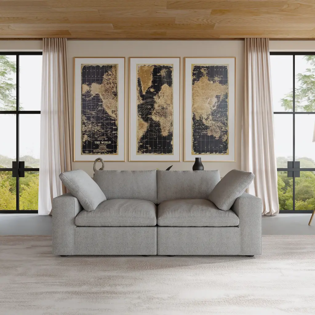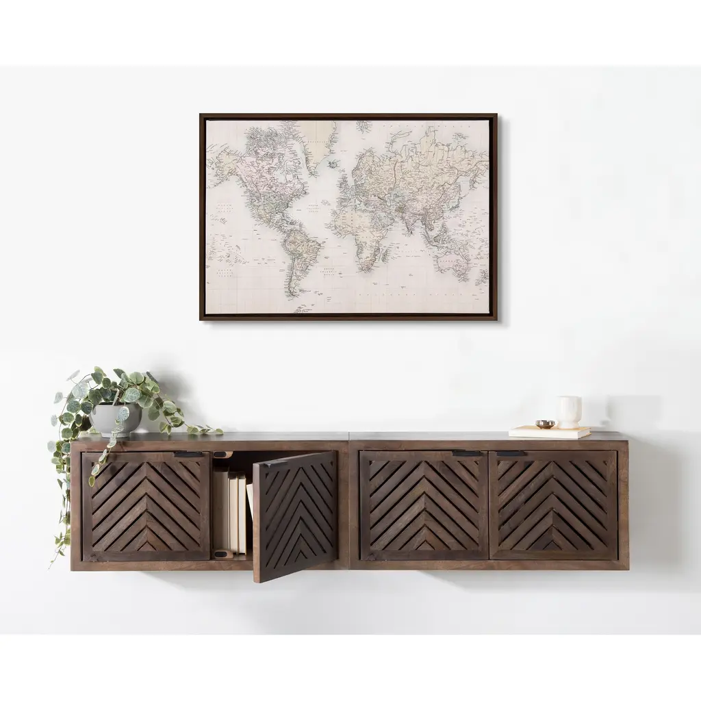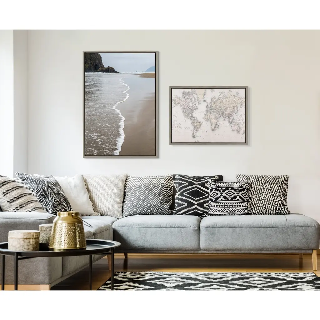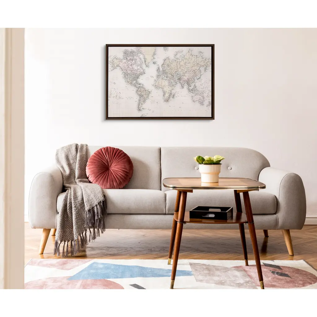 This neutral world map will inspire you to take that trip you've always wanted to take. Use it as a dream board or buy little tacks to poke the places you've been. Gorgeous in an office, dining room or right over your couch in the living room. Framed in the USA in Waunakee, Wisconsin, this floating canvas art will be a pleasure to look at every day in your living room, bedroom, nursery, or any room in the home. This art print also makes an excellent gift for birthdays, holidays, or house-warming parties. Printed on gallery-wrapped canvas and framed with a lightweight polystyrene frame, this wall art is easy to display on the wall. The outer dimensions are 24 inches by 18 inches by 1.6 inches. Print Name: "Vintage World Map"