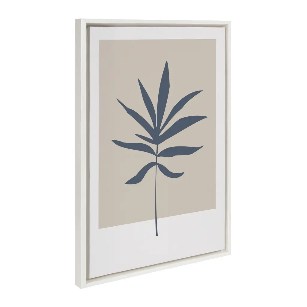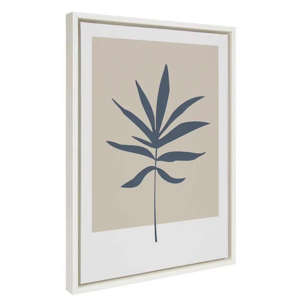 Decorate your home with this soft botanical wall art by The Creative Bunch Studio. Its calm tones and framed canvas would give you a delightful addition to your space. Framed in the USA in Waunakee, Wisconsin, this floating canvas art will be a pleasure to look at every day in your living room, bedroom, nursery, or any room in the home. This art print also makes an excellent gift for birthdays, holidays, or house-warming parties. Printed on gallery-wrapped canvas and framed with a lightweight polystyrene frame, this wall art is easy to display on the wall. The outer dimensions are 18 inches by 24 inches by 1.6 inches. Print Name: "Muted Tan and Blue Colorblock Botanical Palm"