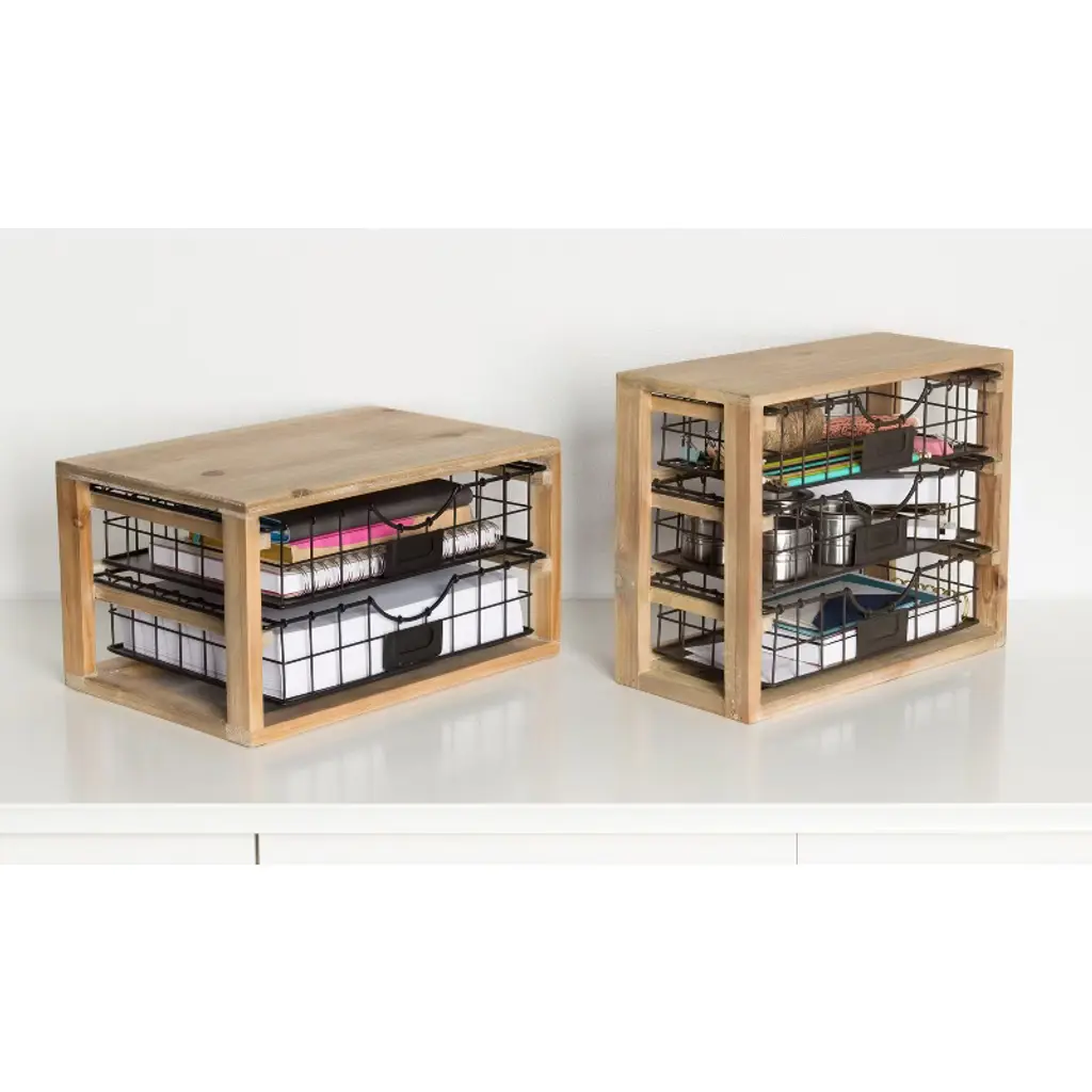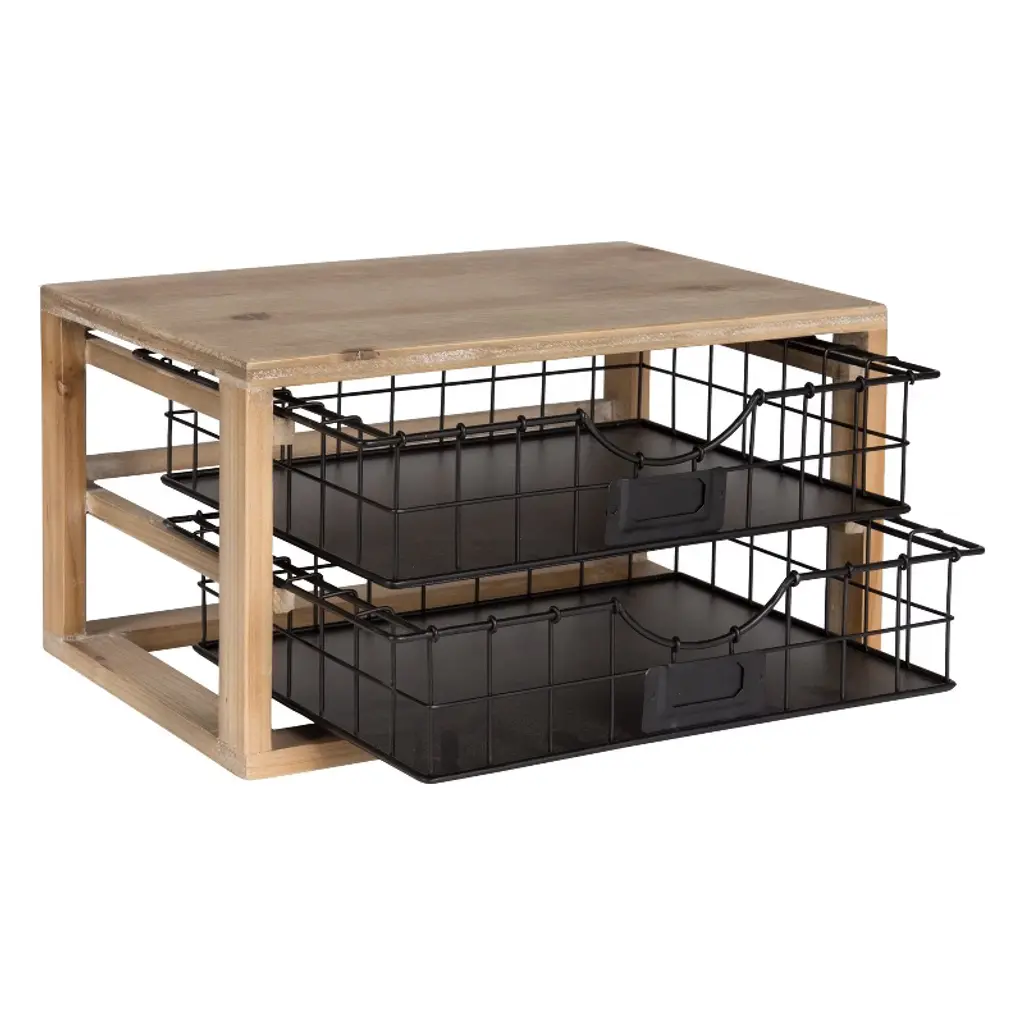 Store away your paper, office supplies, make up, or other odds and ends in this charming small desktop wire metal drawers. These desktop drawers are constructed of rustic solid wood with 2 metal drawers each with a metal label holder. Each drawer can hold a full ream of standard 8.5x11 paper. This rustic chic set of drawers is perfect to hold papers, notes, or other desk accessories in your home office. It can also be used in your farmhouse decor bathroom or shabby chic vanity to hold make up palettes and brushes. The overall size of the drawer set is 14.25 inches wide by 8 inches high and 9 inches deep-perfect for your home office desktop!