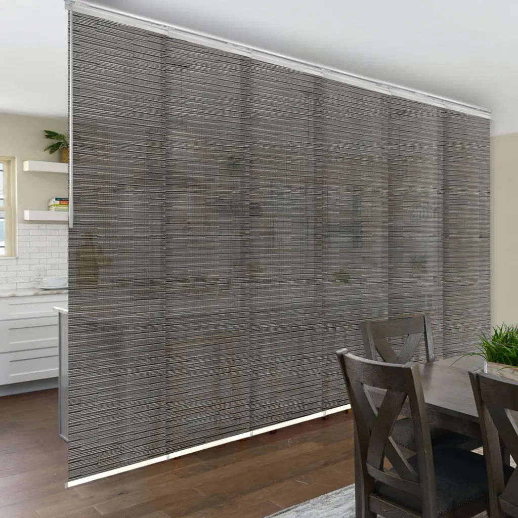 Central Design Products is pleased to introduce a new innovative panel track that offers easy 2-way installation, adding an alluring style and refined touch to your home decor. The single rail design of the track is sleek, compact, and reduces the overall footprint and weight of the installation, eliminating bulky, intrusive window treatments. Adjusting the panel height is a breeze � simply trim the panel, re-attach the liner, and install the panel weight. Detailed instructions are included.The panel track also features a patented slider design, made with aluminum and fitted with bearings that allow for durable and smooth operation. The sliders are stacked closer together than conventional panel tracks, reducing light bleed coming from the gaps between panels. This track has endless uses from dividing rooms, garages, offices, and closets to decorating windows and patios. Available in larger sizes including 8, 10, and 12 panels. Extends from 98-130� wide. Each panel measures 23.5" wide and 116" tall, with a total installation height of 118.5" (includes the 2.5" rail track). The track can be wall or ceiling mounted. The panels can stack on the left or the right. The clearance from the wall is extendable from 1.25� to 3.25� and projection from the wall is extendable from 3� to 4.25�. Kato panel is made from 69% Vinyl 31% Polyester, with a light filtering shade that blocks 50% of the light.