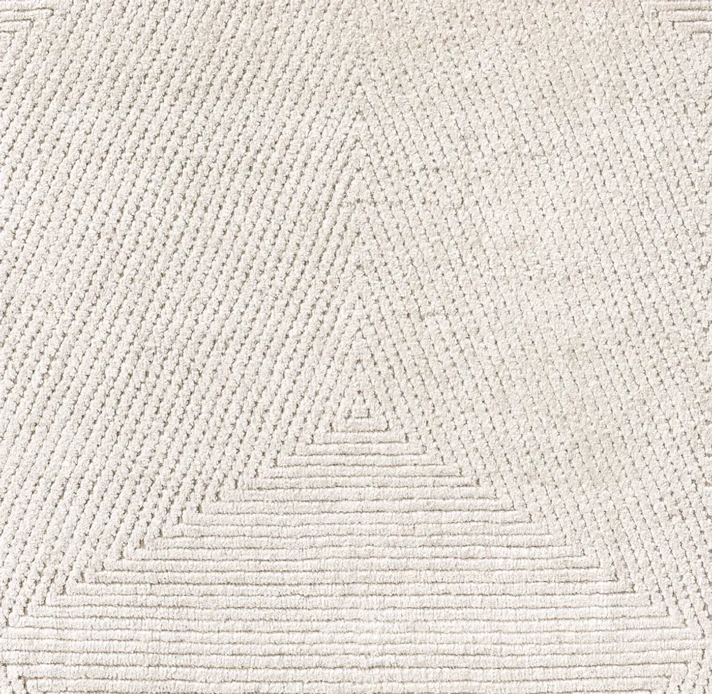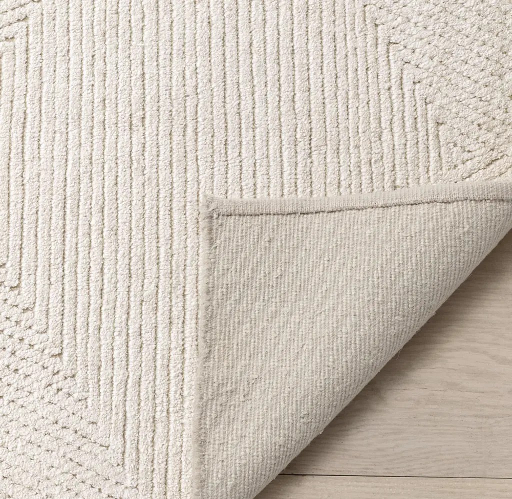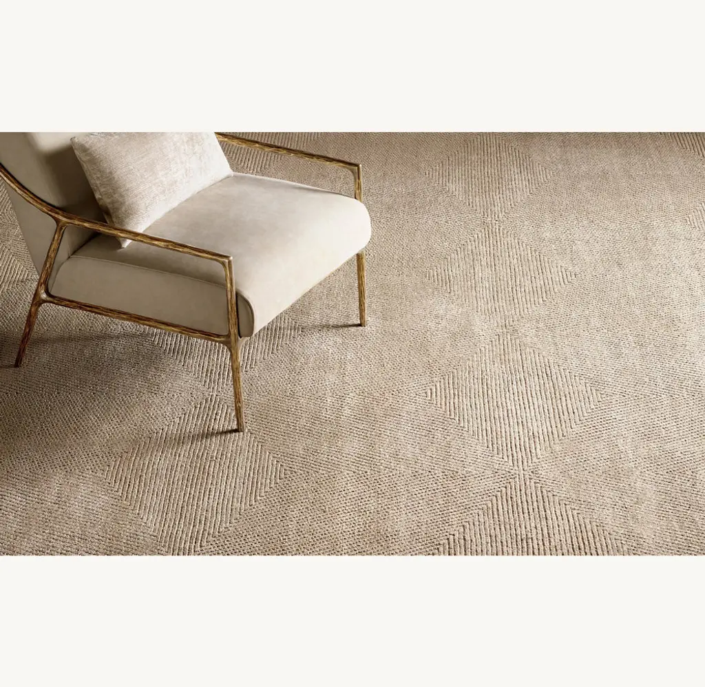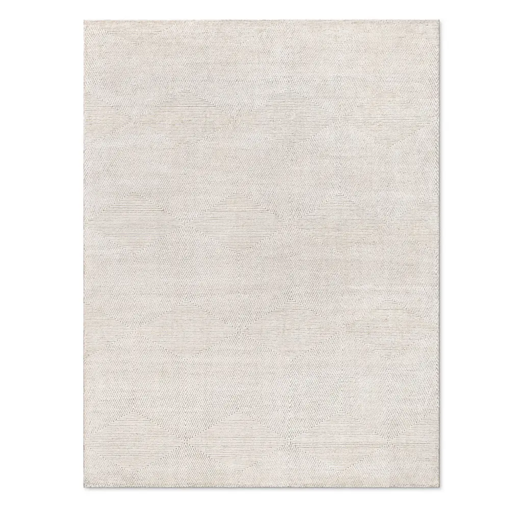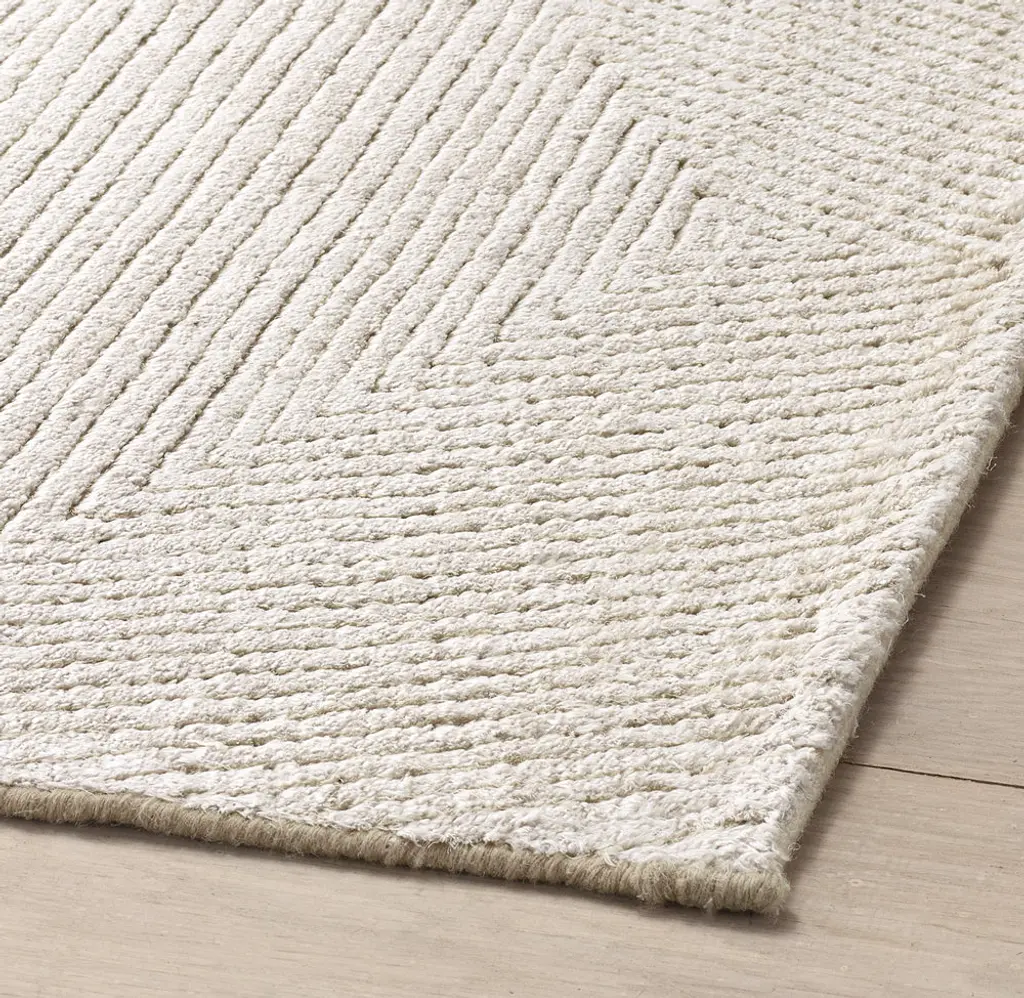 Kaveri's artful geometry gains dimension from rows of luxuriant silk and smooth, flatwoven wool. Knotted by hand, the precise lines are softened by organic variations in the shading and texture of the soft pile.