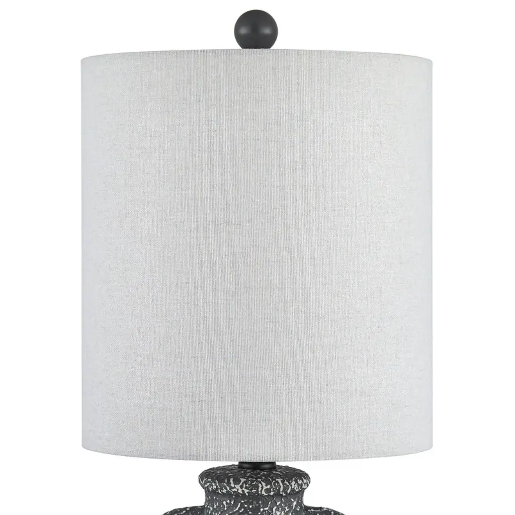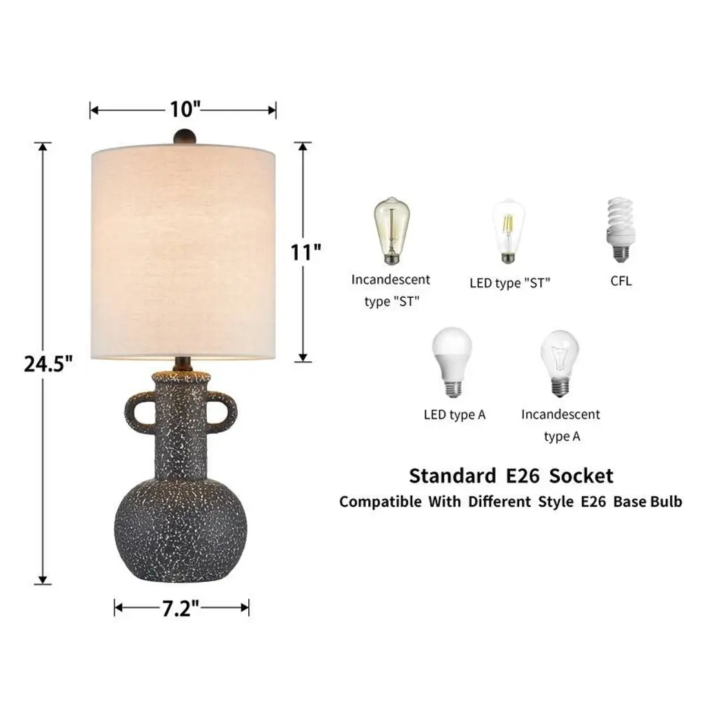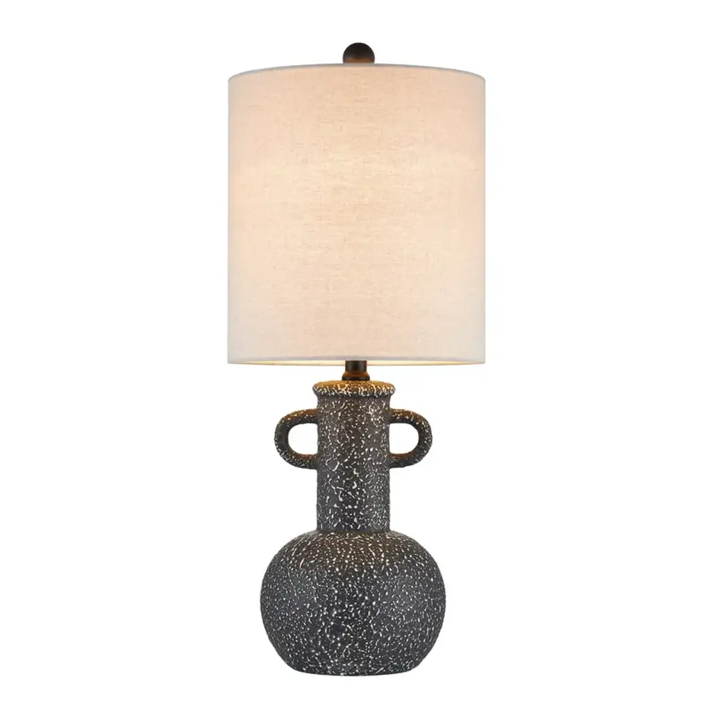 Elevate your space with this 24.5” table lamp. The base is crafted in ceramic and the surface with faux concreted design gives an artful vintage-like look to the classic gourd silhouette. This lamp is capped with a tall drum shade that diffuses the light from a 100W bulb (not included) throughout your space. Giving a unique whimsy and a perfect addition to your bedside/side table/entryway.Features: Dimension:Cleaning Note: