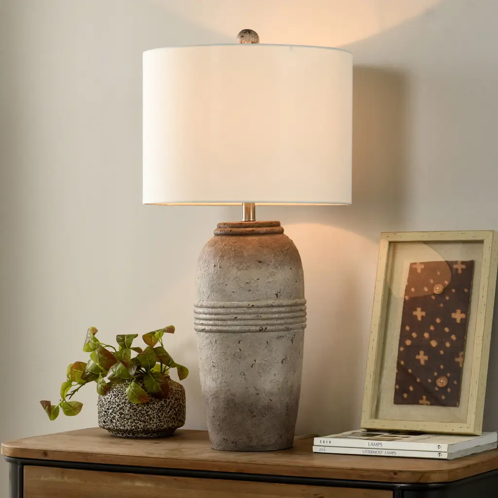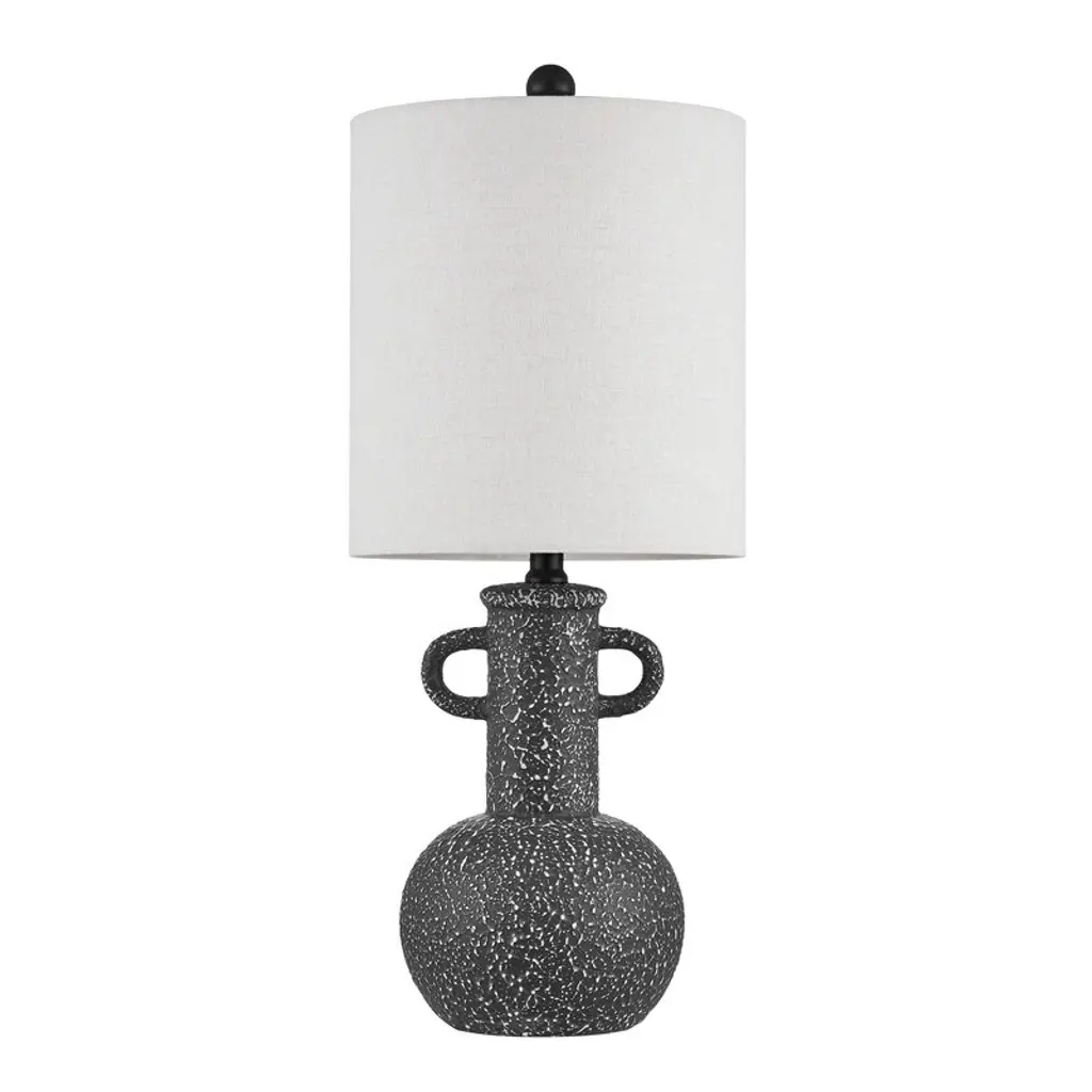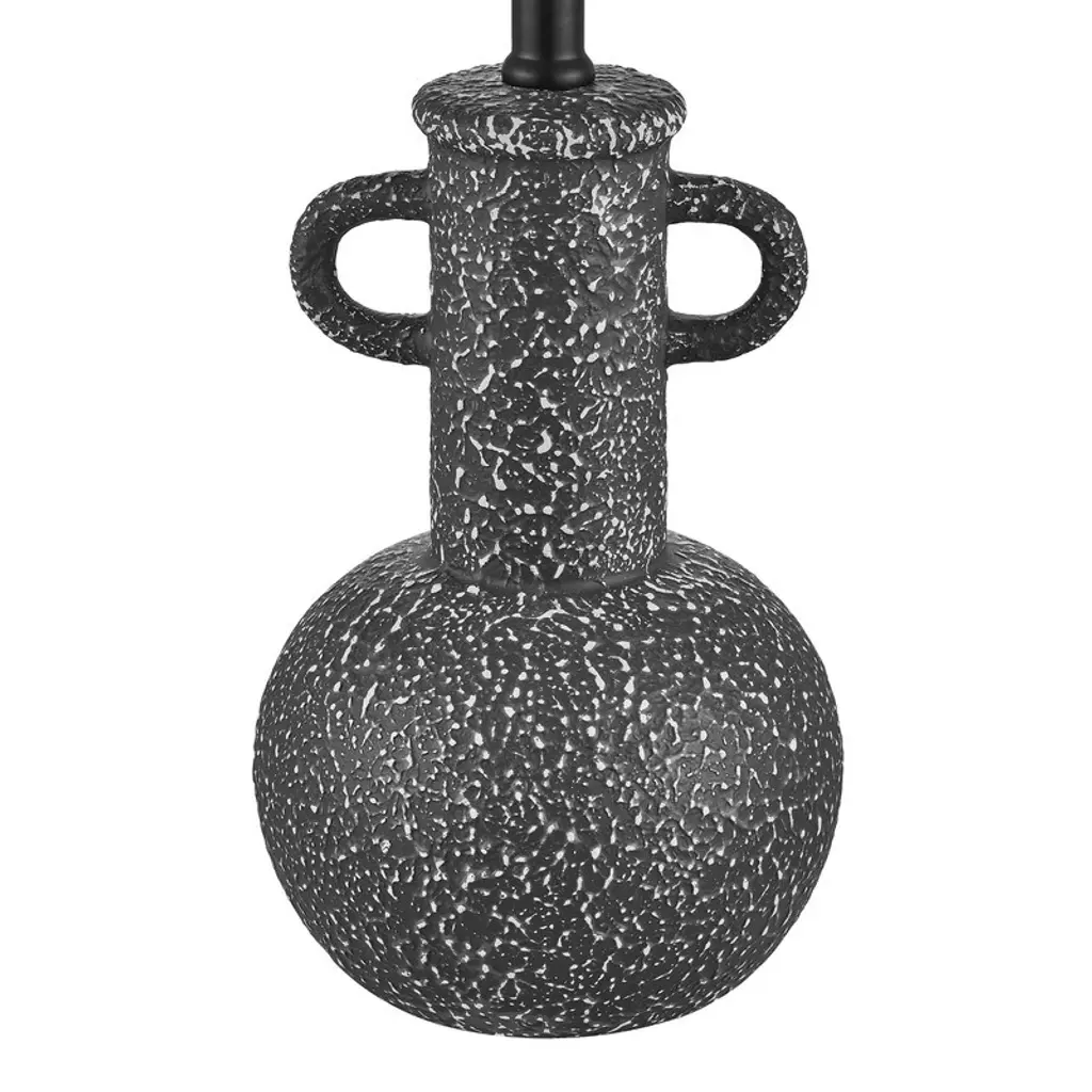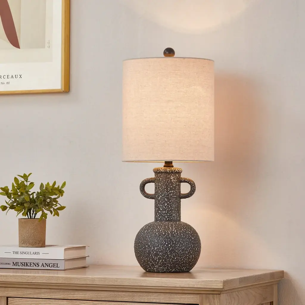 Elevate your space with this 24.5” table lamp. The base is crafted in ceramic and the surface with faux concreted design gives an artful vintage-like look to the classic gourd silhouette. This lamp is capped with a tall drum shade that diffuses the light from a 100W bulb (not included) throughout your space. Giving a unique whimsy and a perfect addition to your bedside/side table/entryway.Features: Dimension:Cleaning Note: