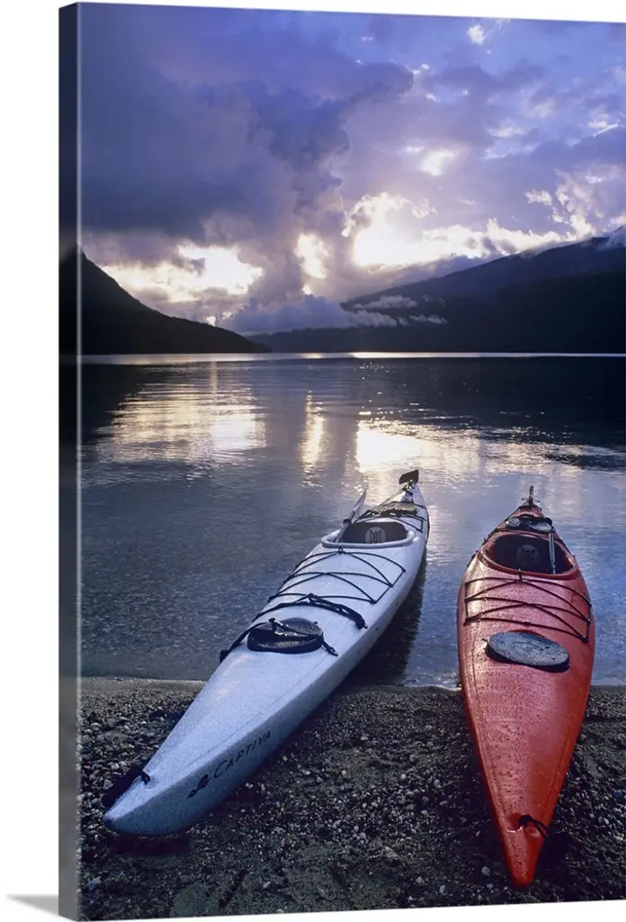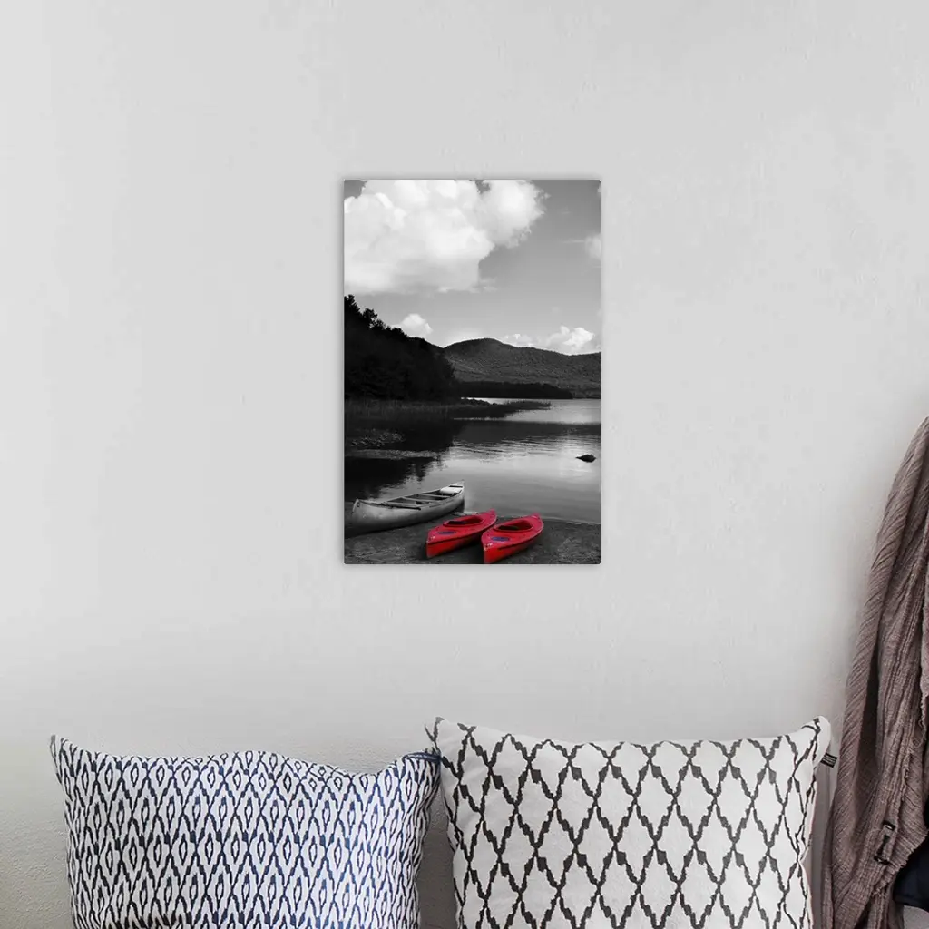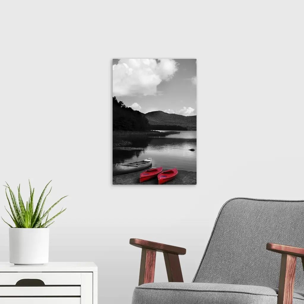 Black and white photograph with two bright red kayaks next to a canoe, resting on the shore of a lake.