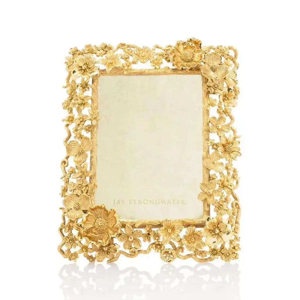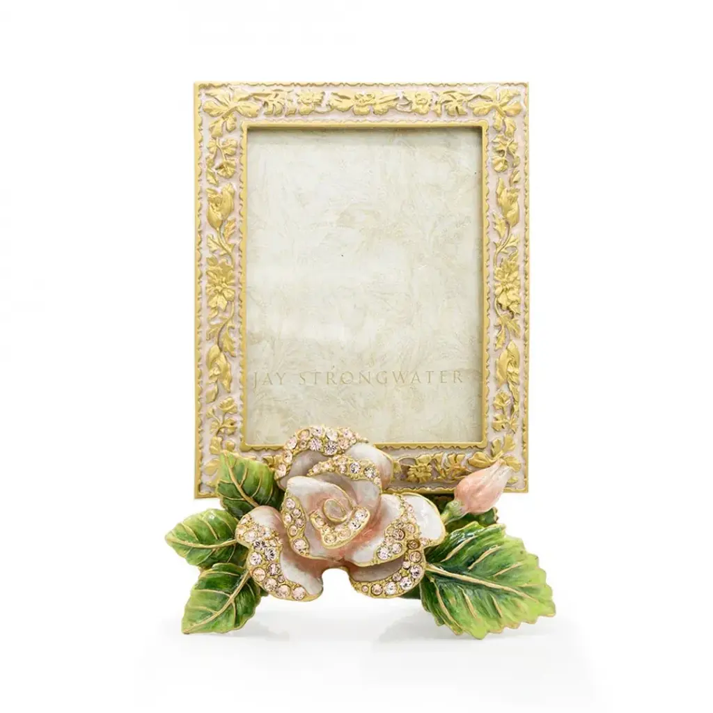 A single blush pink rose adds dramatic flair to this 3" x 4" frame. Enameled by hand, accented by individually-placed European crystals, and plated in 14K gold this piece sets a majestic stage for your most treasured photo memories.