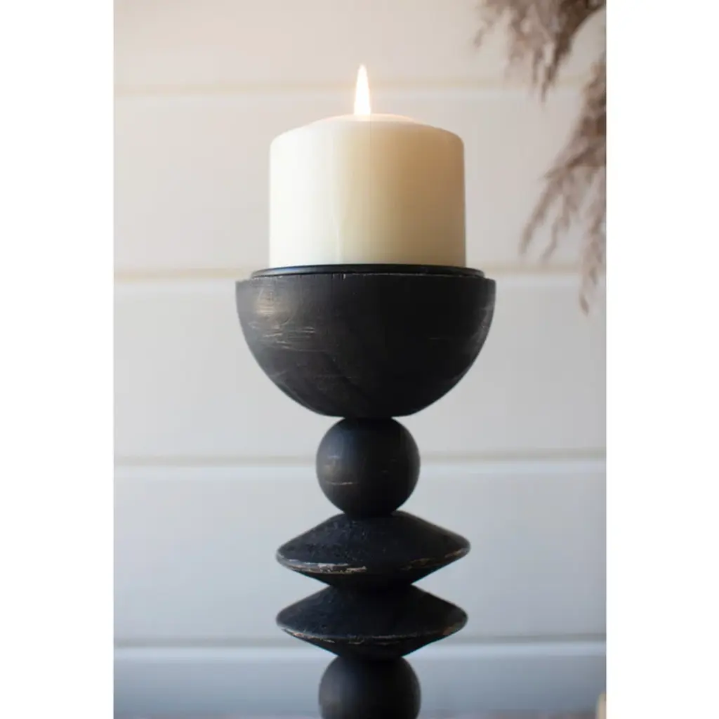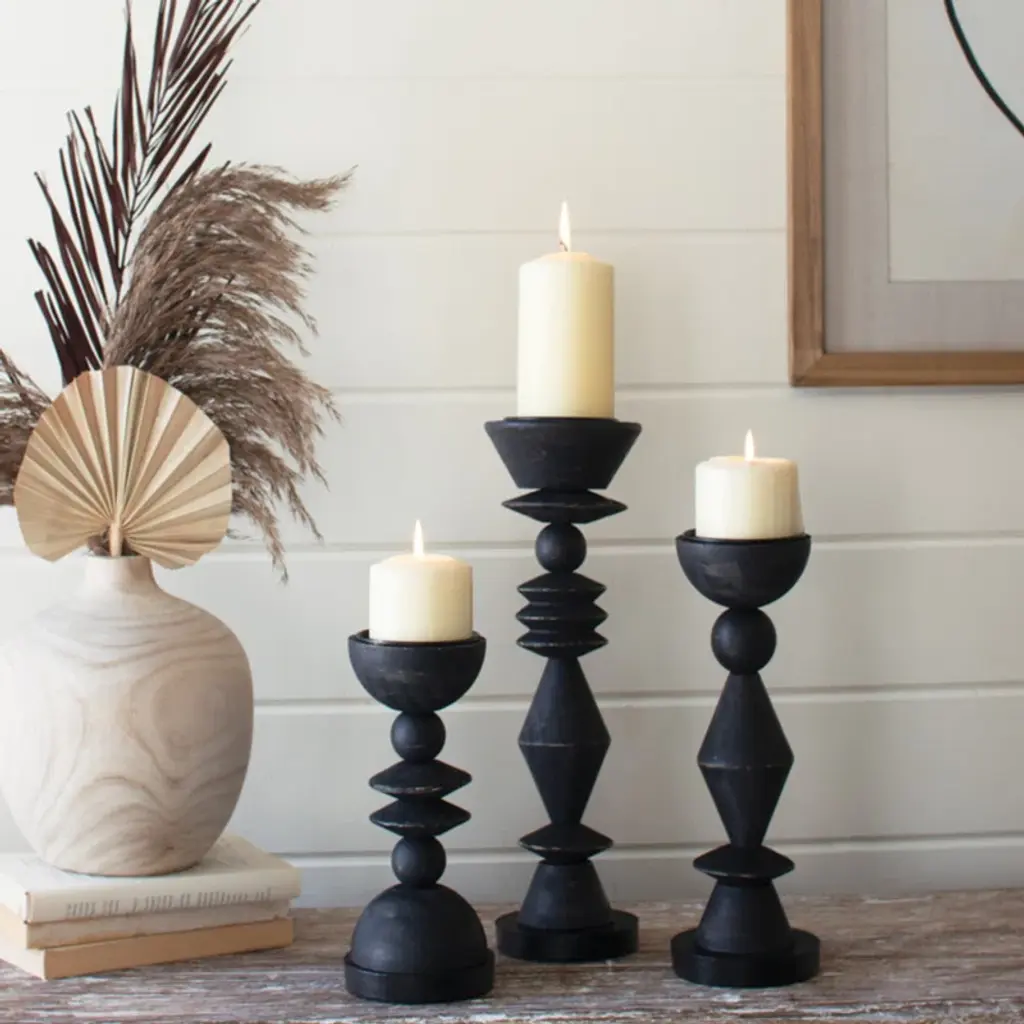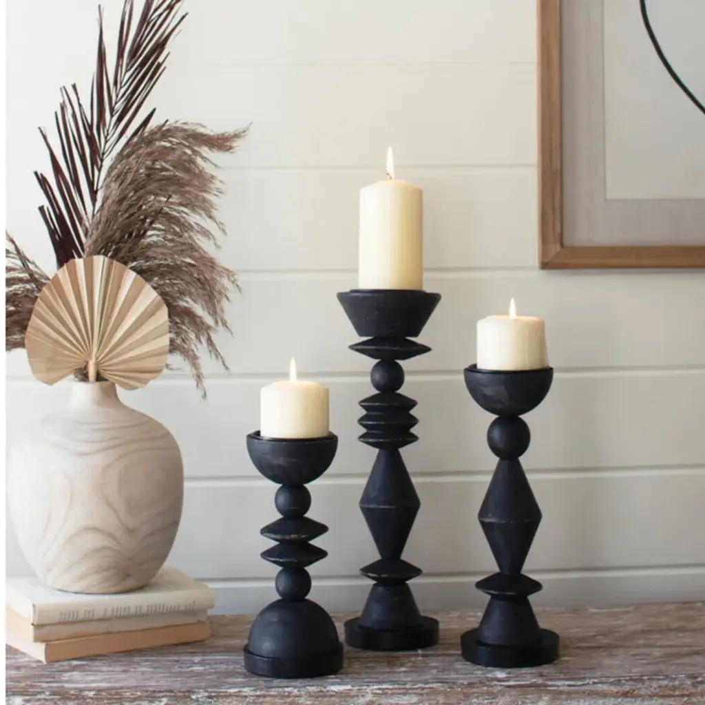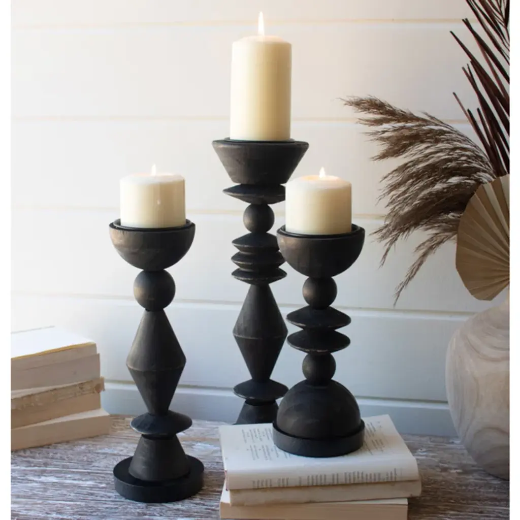Elevate pillar candles in any space. These turned-wood candle holders with geometric shapes add a touch of black to any room. The 16", 12. 5", and 10" tall heights mean they are great singly, in groups, or in pairs.
