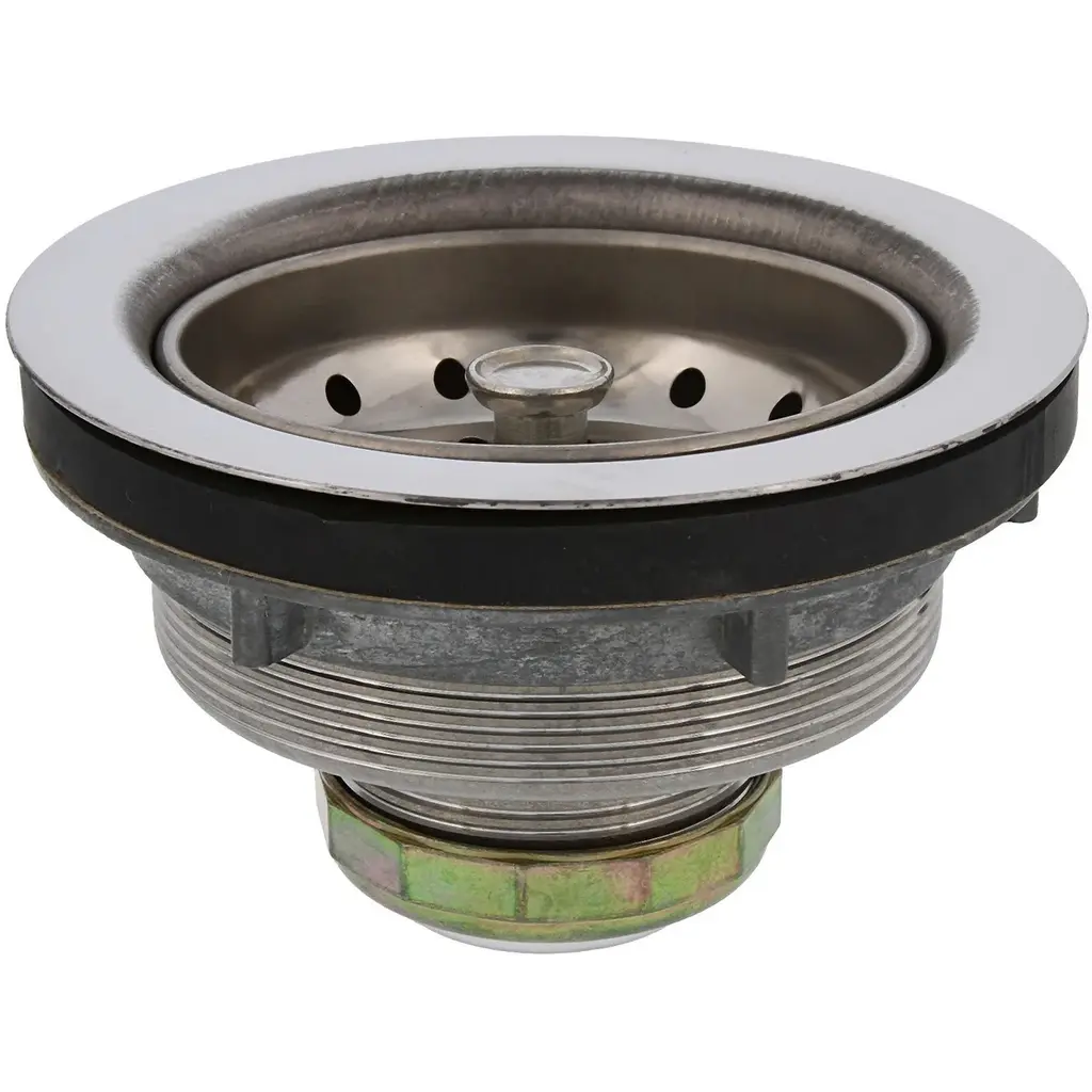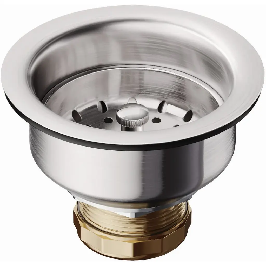 Brass strainer for 3-1/2" diameter hole - 4-2/1" diameter flange. Solid brass body with deep cut threads. Fixed post stainless steel basket with safety rolled edge. With neoprene stopper and 4mm jumbo rubber locknut washer. Die-cast locknut and long shank slip nut. Includes locknut friction washer and flanged tailpiece washer. Boxed.