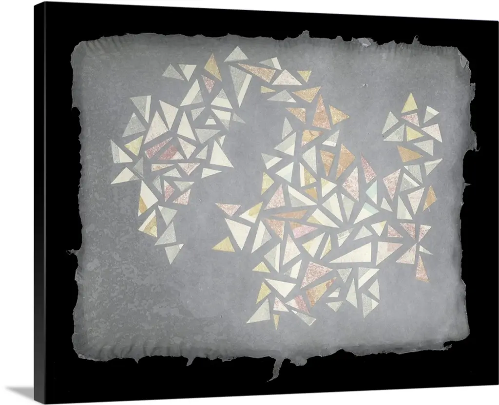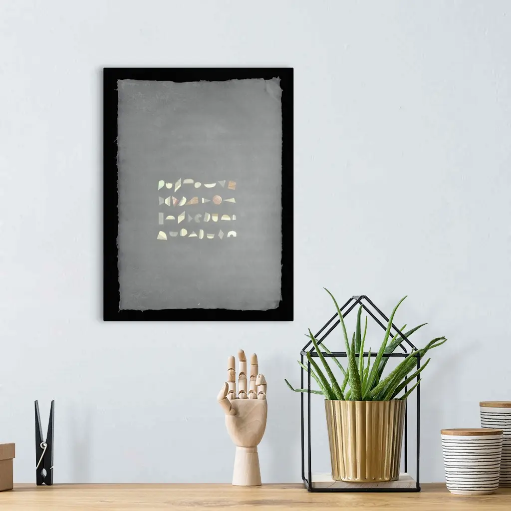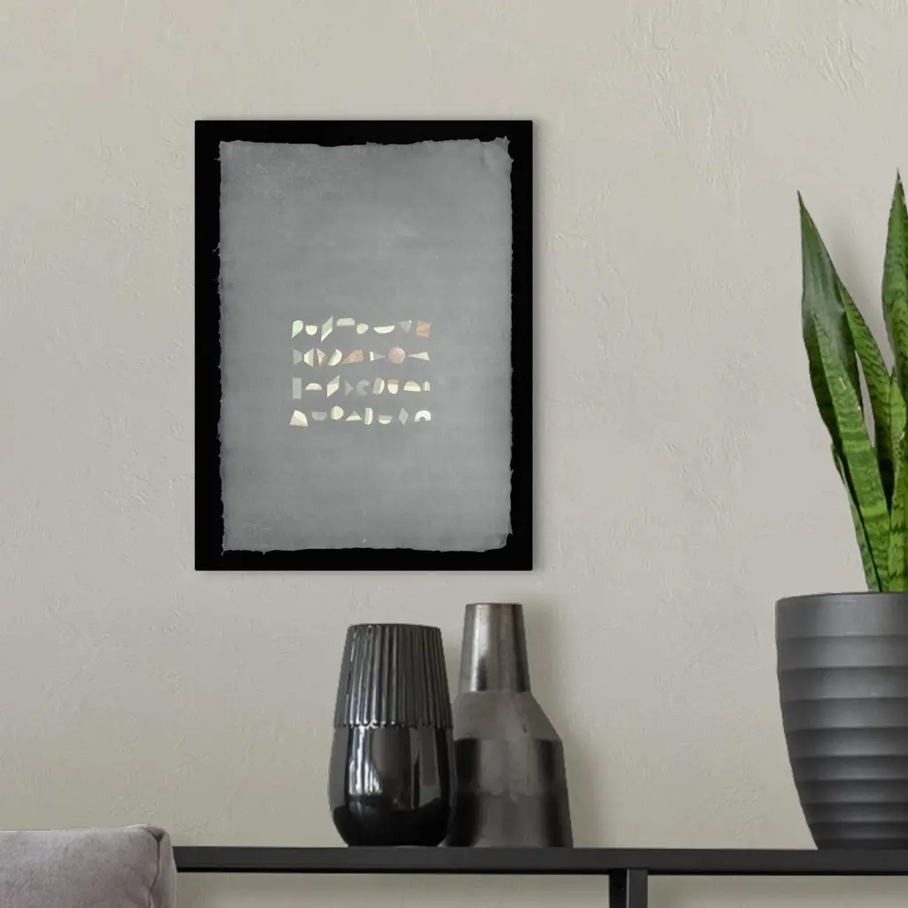 Carefully composed geometric shapes form a block suspended in handmade paper.