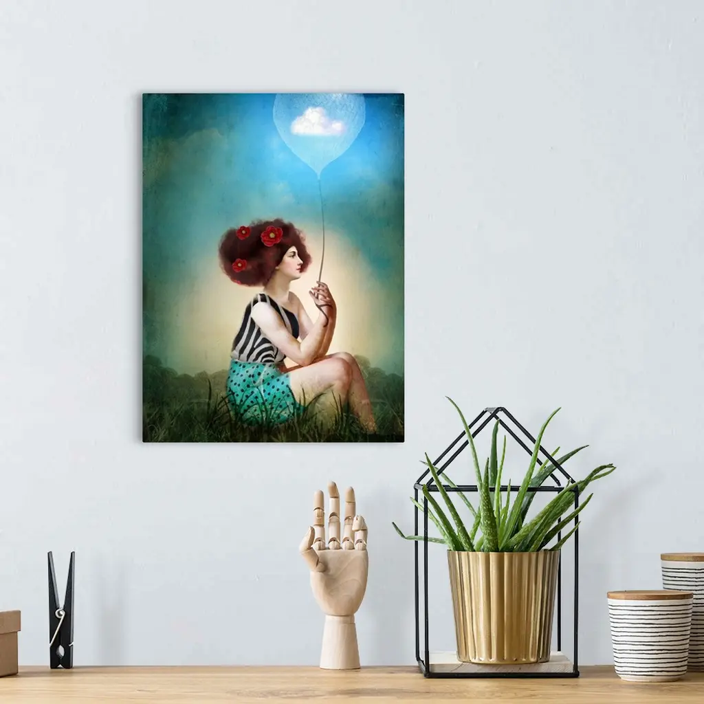 A young lady is sitting in a field holding a balloon that has a cloud in it.