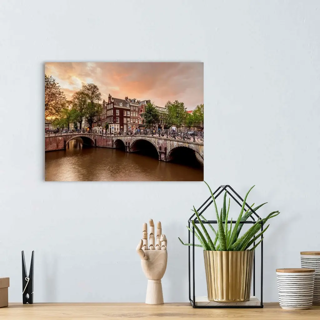 Keizersgracht And Leliegrach Canals And Bridges At Sunset, Amsterdam, North Holland, The Netherlands