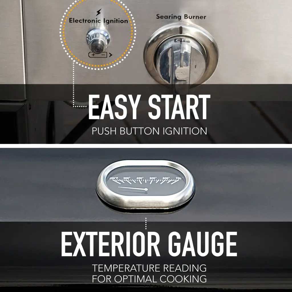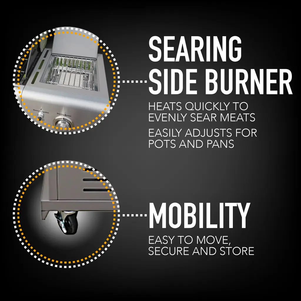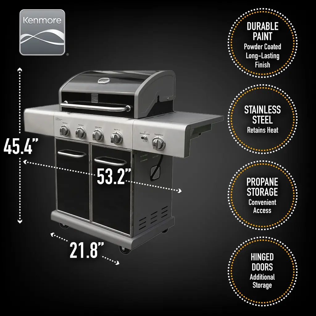 Gather your loved ones for a perfect BBQ night with the Kenmore 4-Burner Propane Gas Grill with Searing Side Burner in Stainless Steel/Black. With its stainless steel burners, a high-heat searing burner, and a spacious 593 sq. in. cooking surface, this propane gas grill is ideal for dedicated BBQ enthusiasts.This elegant and stylish 4-burner gas grill offers a host of features for a superior grilling experience. It includes a built-in lid temperature gauge, a warming rack, an electronic igniter, and an easy-to-clean grease tray. With durable stainless steel burners and cast-iron cooking grates for even heat distribution and retention, this grill also boasts a folding door cabinet and a generous 593 sq. in. grilling surface. Features:Recommended Uses:Backyard BBQs, Outdoor Entertaining, Birthday Parties, Holiday Feasts, Weekend Cookouts, Family Gatherings, Neighborhood Parties, Baby Showers, Wedding Receptions, Graduation Parties, and Intimate Events