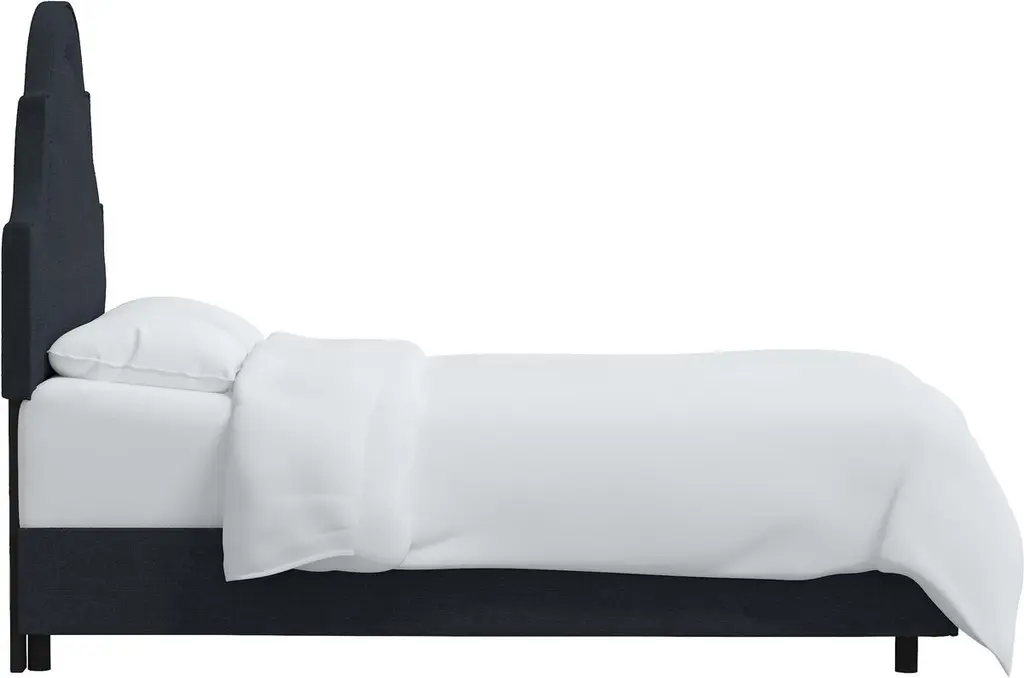 This sophisticated bed is crafted of pine with a regal silhouette and linen-blend upholstery in a versatile neutral hue. We love how its amply padded headboard makes a comfy backdrop for reading or watching TV in bed. Mattress and box spring required. Handcrafted in the USA.