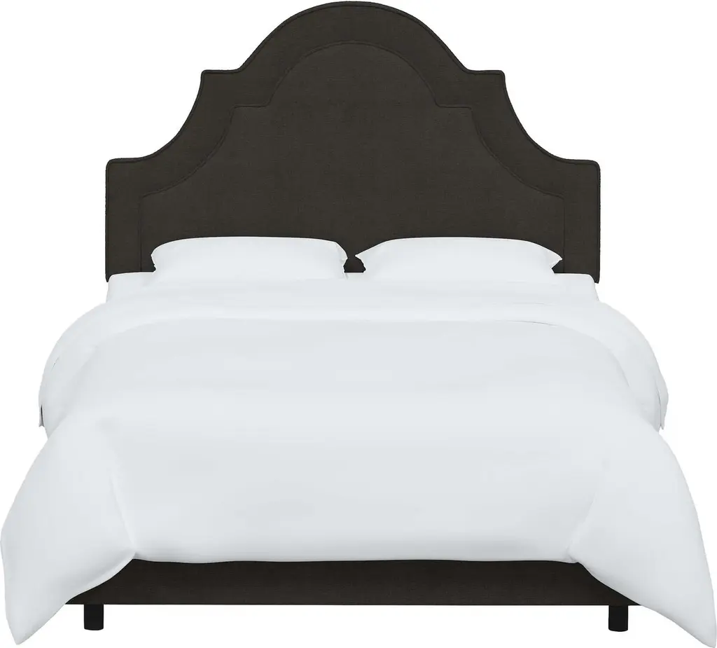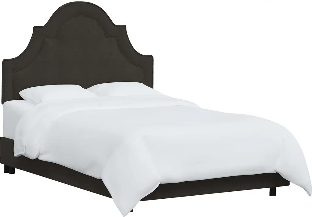 This sophisticated bed is crafted of pine with a regal silhouette and linen-blend upholstery in a versatile neutral hue. We love how its amply padded headboard makes a comfy backdrop for reading or watching TV in bed. Mattress and box spring required. Handcrafted in the USA.