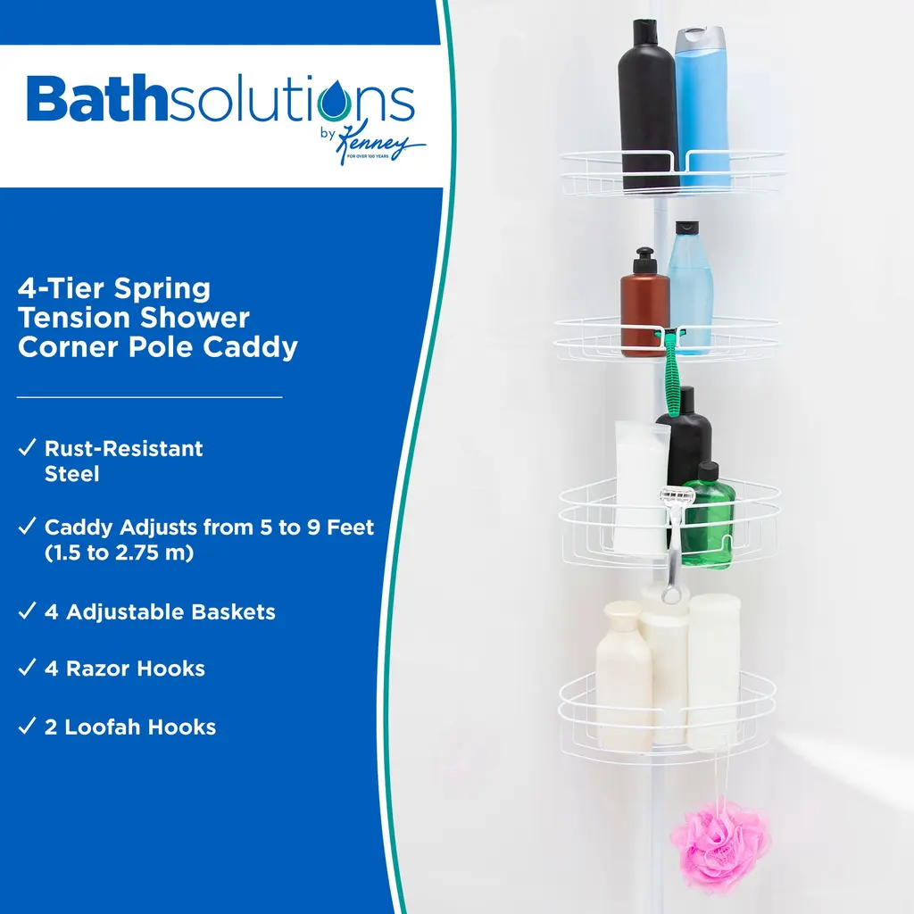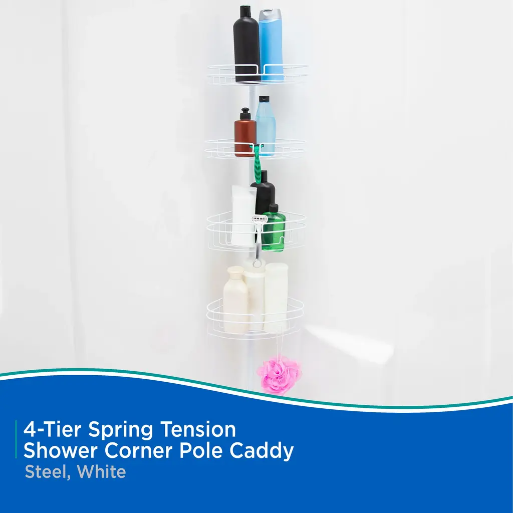 The Kenney 4-Tier Spring Tension Shower Corner Pole Caddy brings extra storage to the underutilized corner of your bath or shower. The caddy is made of rust-resistant metal and has four adjustable shelves in two different sizes. Each shelf can be adjusted up or down to accommodate different size bottles. The wire basket shelves allow for better storage, easier cleaning, and water drainage. It also includes a razor holder to keep sharp razors out of the way and help them last longer by letting them dry out after each use.The tension pole adjusts from five to nine feet tall (1.5 to 2.75 m) to fit most standard height ceilings. It installs quickly with no tools and can be moved easily when needed.
