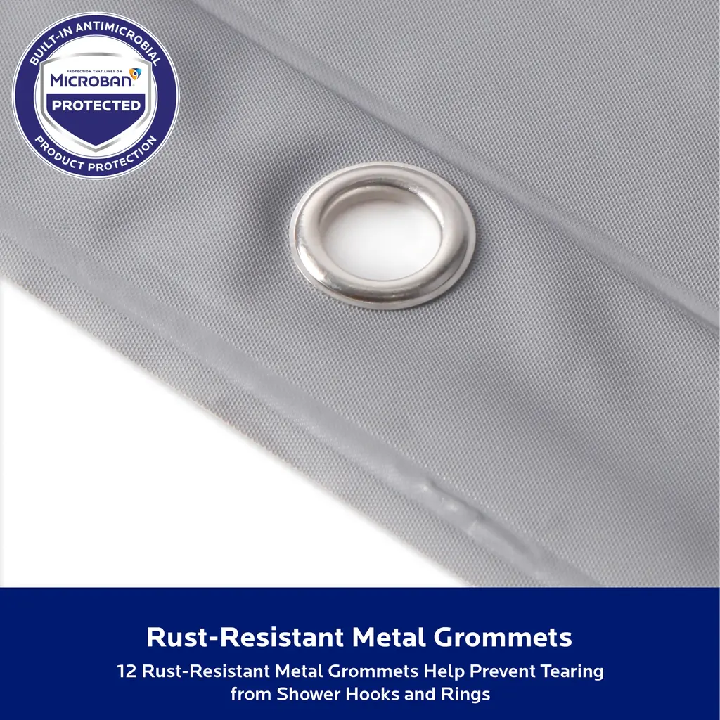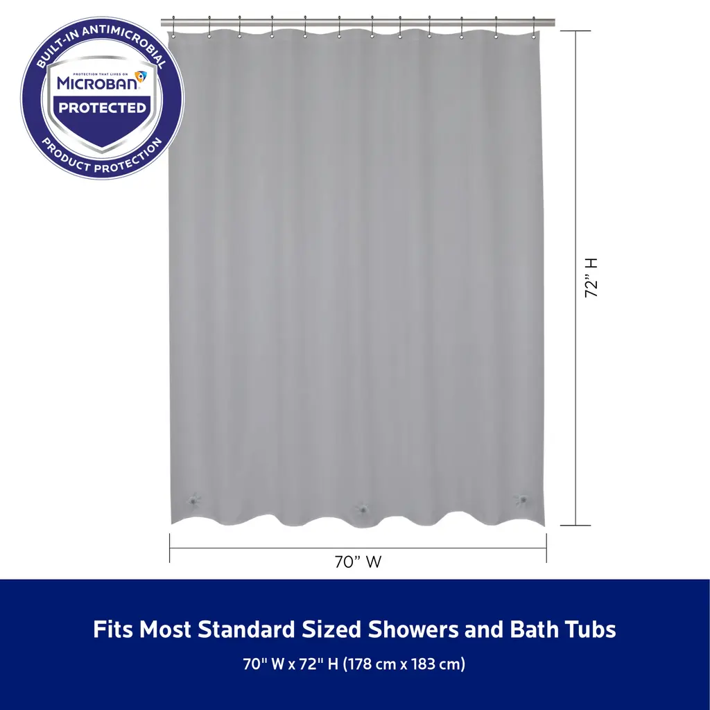The Kenney Medium Weight PEVA Shower Liner Protected with Microban antimicrobial technology inhibits the growth and reproduction of odor-causing bacteria, mold and mildew and provides enhanced product protection from microbes. Microbes can cause staining and noxious odors - less microbes equals a fresher product! Protected with Microban, this Shower Liner will remain antimicrobial for the expected product lifetime - the antimicrobial properties will not wear off or wash away.The Shower Liner is made of environmentally friendly PEVA, making it PVC-free and odorless. The liner has 12 rust-resistant metal grommets to prevent tearing from shower hooks and rings. The weighted hem on the waterproof liner keeps the liner from billowing and in place.Standard sized, this liner measures 70 inches wide by 72 inches tall (178 cm x 183 cm) to fit most showers and bath tubs.