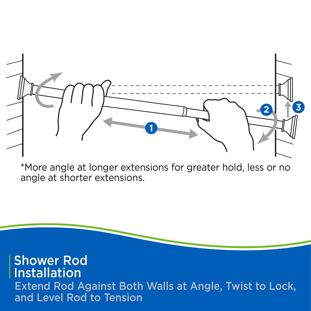 The Kenney Twist & Fit No Tools Rust-Proof Aluminum Tension Shower Curtain Rod is adjustable from 42 inches to 72 inches wide, making it a great solution for standard and oversized bathtubs. Fashionable finishes make it simple to find coordinating rings and shower curtains to match the rest of your bathroom. Made of aluminum, this shower rod will not rust in your bath. The non-slip, non-scratch end caps mean no damage to your wall or tile. The end caps include ring locks to keep your shower curtain against the wall, preventing drafts.Twist and Fit makes installation easy - without the need for tools. To install, extend against both walls and twist to secure in place.