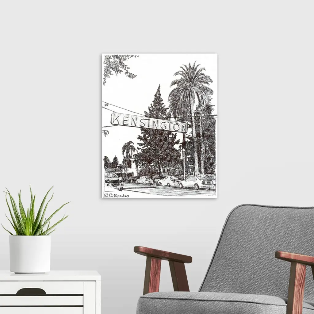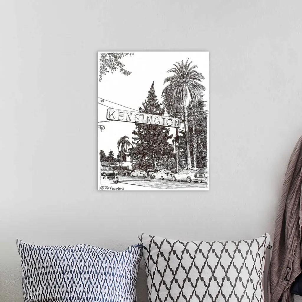 Kensington - San Diego - Pen and Ink drawing of the beloved neighborhood sign by California artist RD Riccoboni.