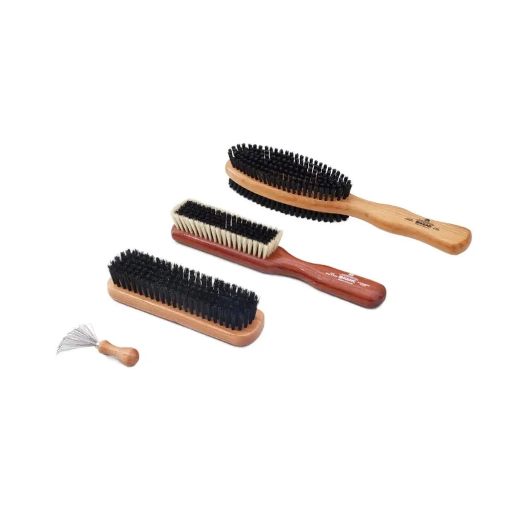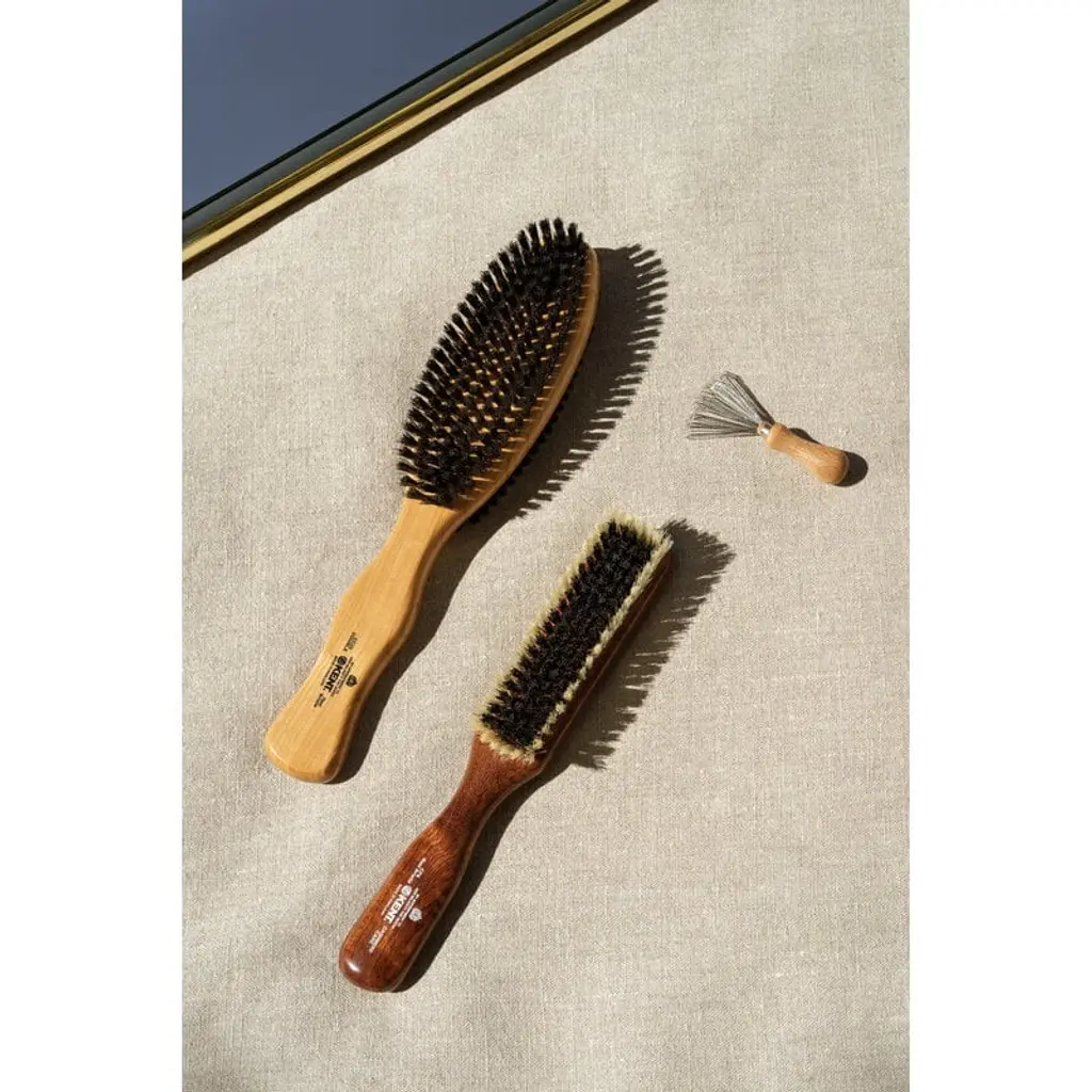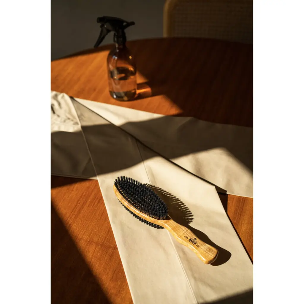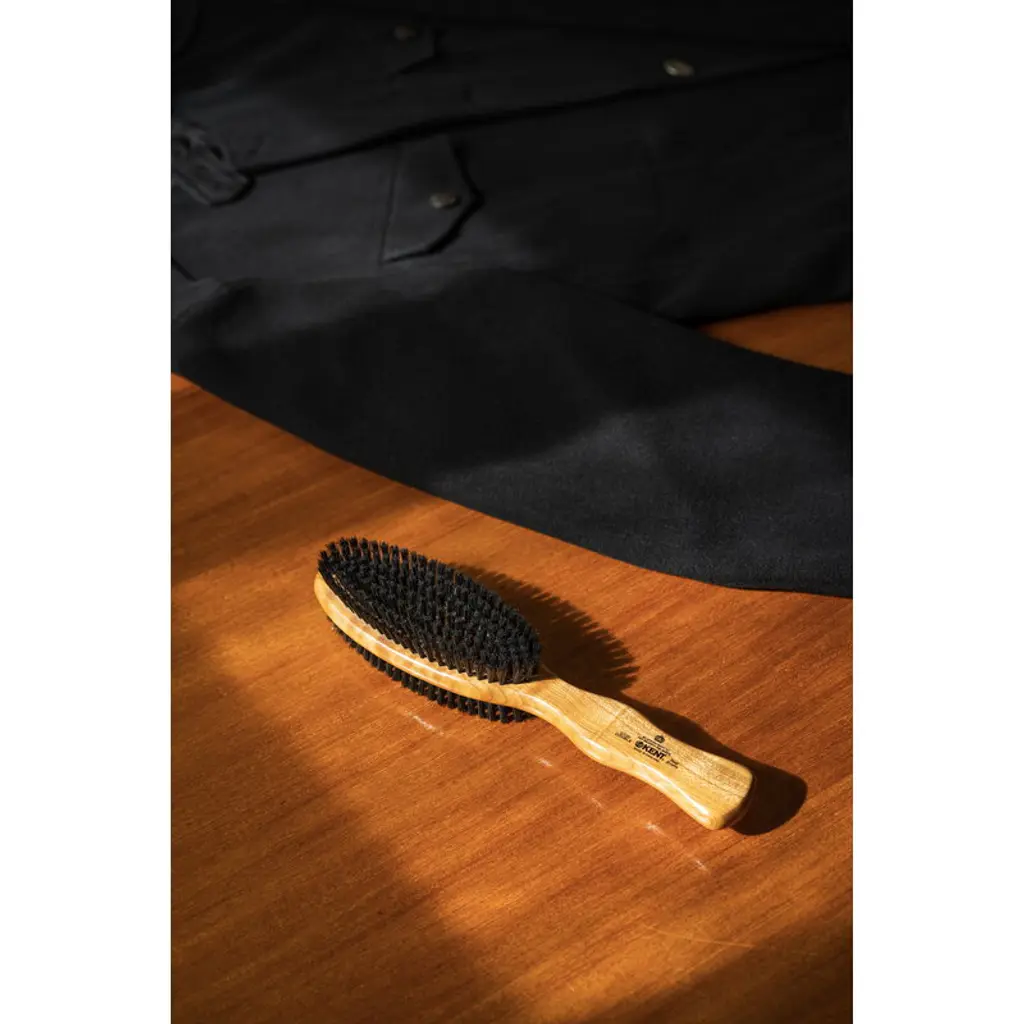 The Kent CC20 clothes brush is designed for cleaning thick wool coats, denim and other durable textiles. It gently yet effectively removes dust, lint or hair from clothes, and also works for removing dried stains from textiles, thus extending their washing interval. The short bristles of the double-sided clothes brush are optimized for loose lint and stains, while the longer ones are best suited for removing dust. The Kent CC20 clothes brush is made in the UK with a natural and nylon bristle mix and cherry wood. Its first-class quality is guaranteed by the manufacturer's logo printed on the wooden handle – Kent is also known as the official brush supplier to the British Royal Family. The brush should be maintained and cleaned regularly with a brush cleaning comb; proper care will make it last for decades, from one generation to another.